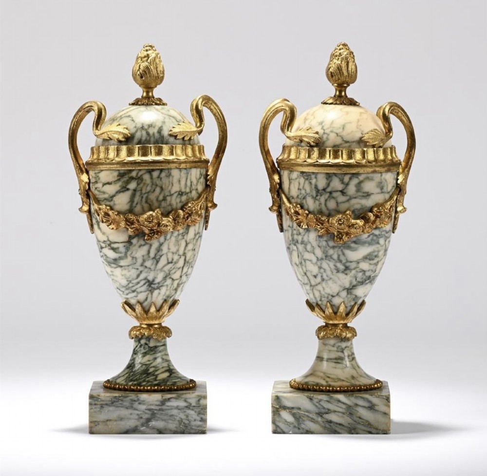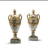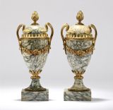 Opulent bright ormolu bronze mounts with floral swags to the tapering ovoid marble bodies, raised on socle supports with ormolu leaf mounts onto square block bases with beaded ormolu rings . The dome-top fixed ‘lids’ with cast ormolu berry finials and shaped twin loop handles . The distinctive light green marble with attractive figuring and striations.