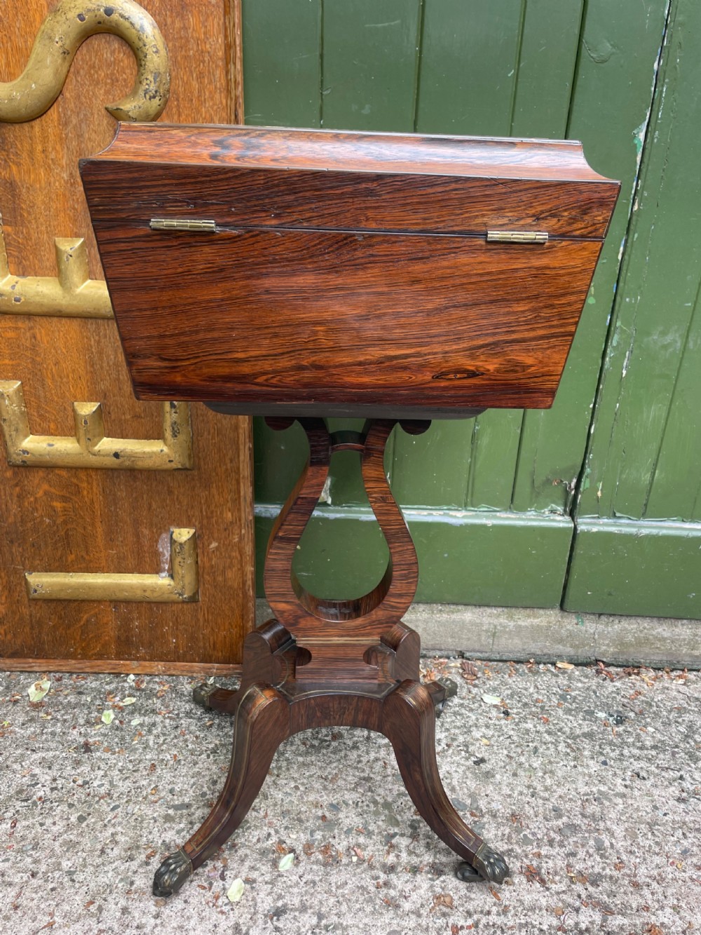 A piece of flamboyantly-designed Regency period furniture from an era when imported fashionable tea was an important and expensive commodity served in a polite ritual within high society circles .