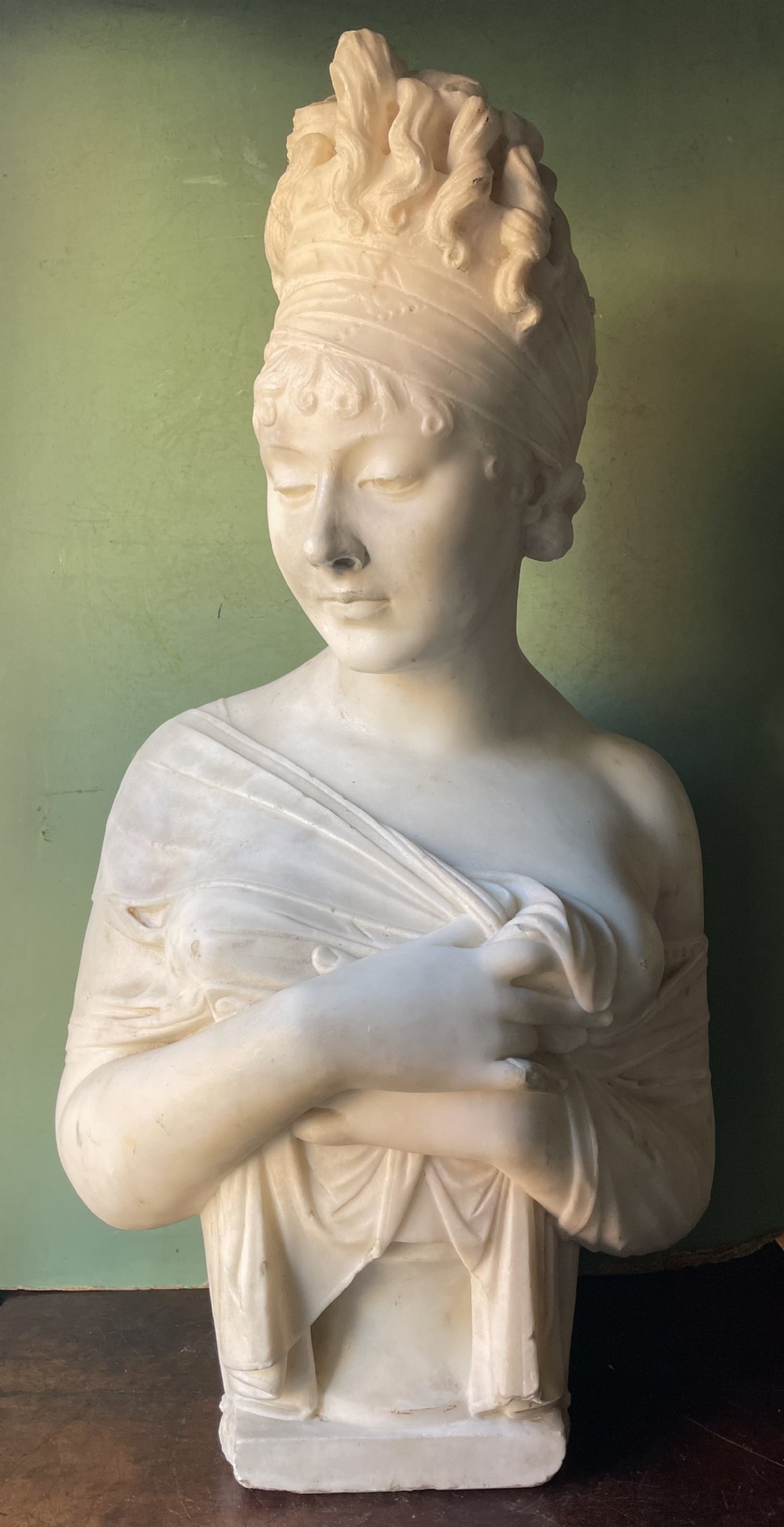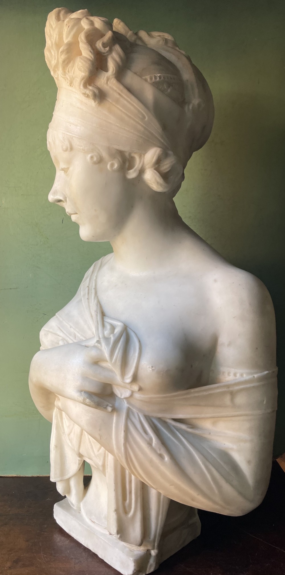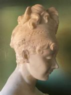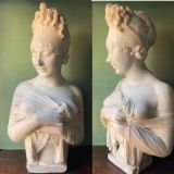 Well-sculpted large-scale study after the original by Joseph Chinard ( 1756-1813 ) of the French socialite and acclaimed beauty, Juliette Recamier . The subject is depicted half-length in a coy pose , clutching her garments or shawl across her breast, her hair held in a bandeau with a comb in her tumbling curls.