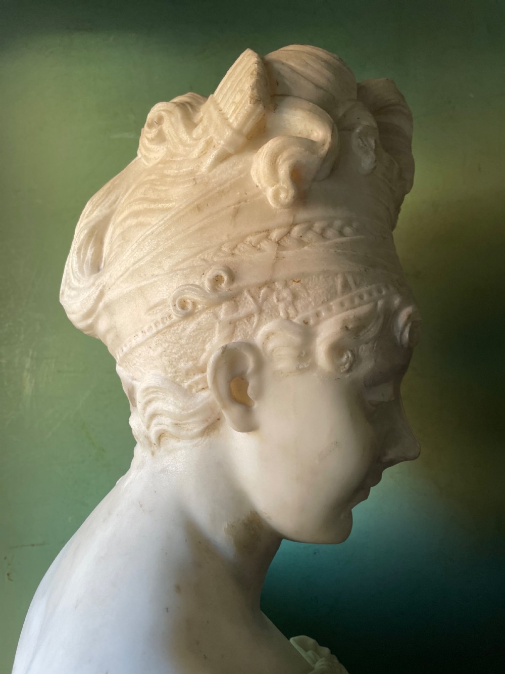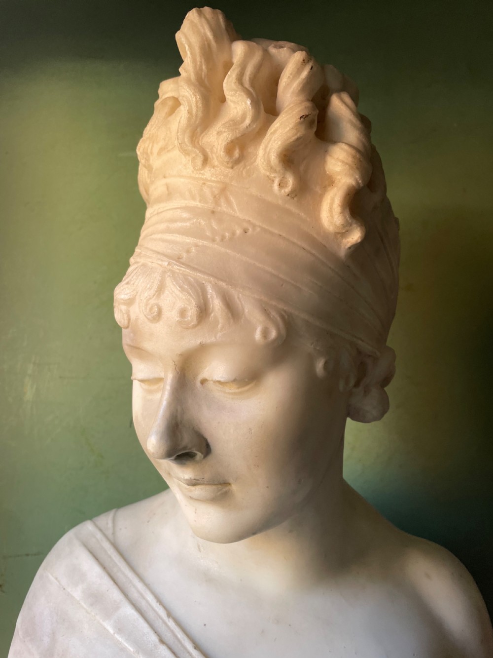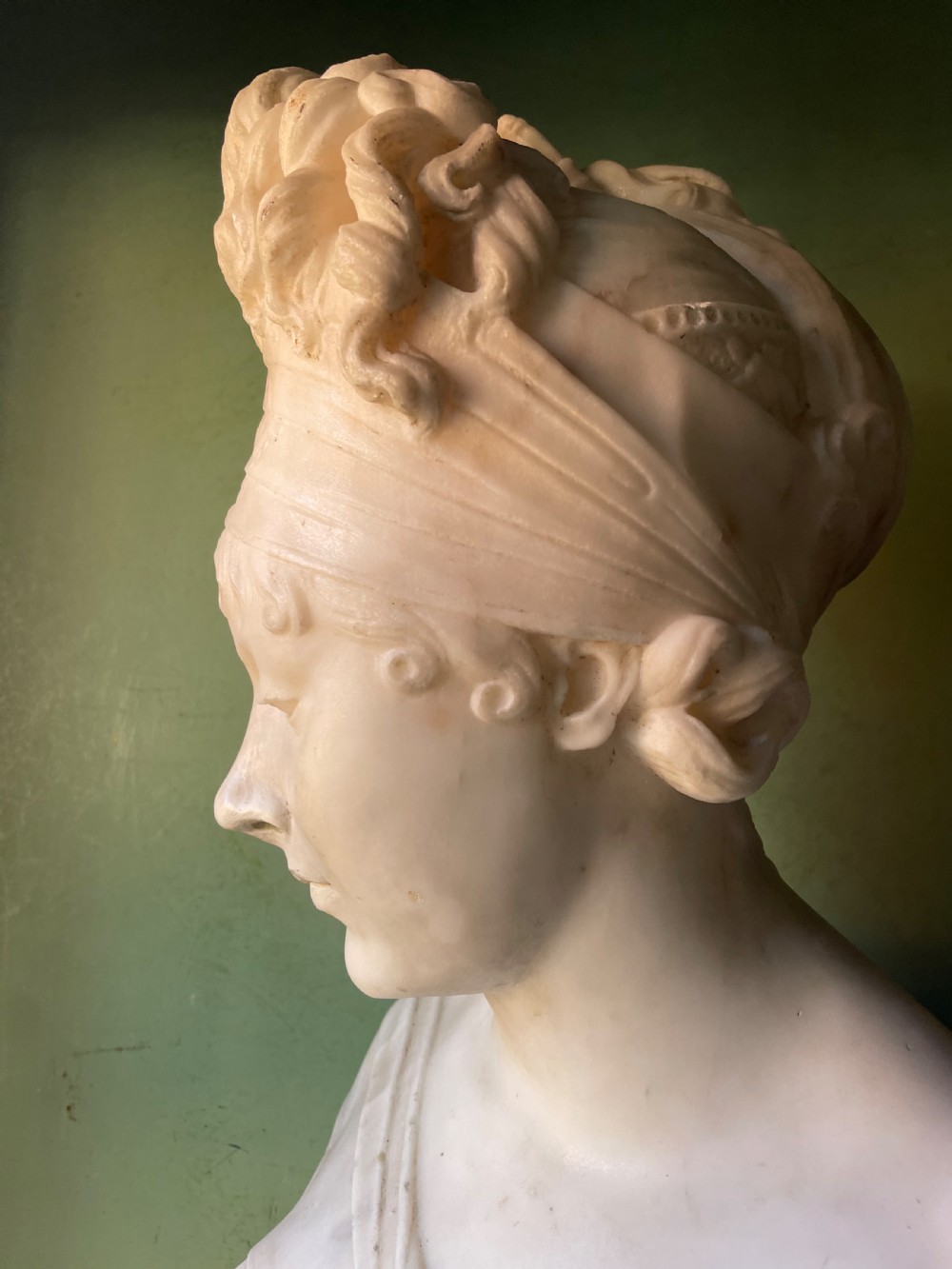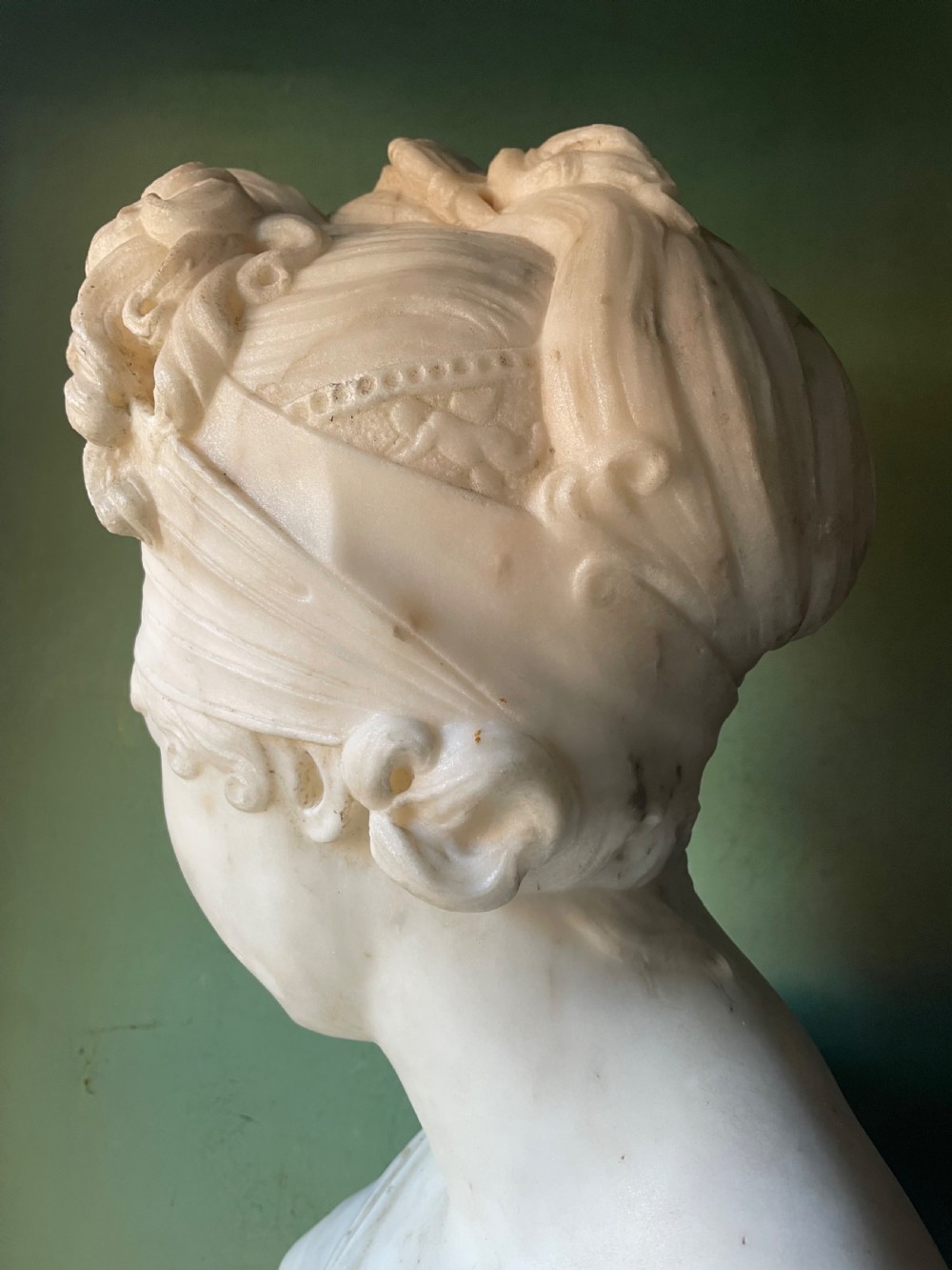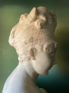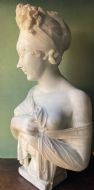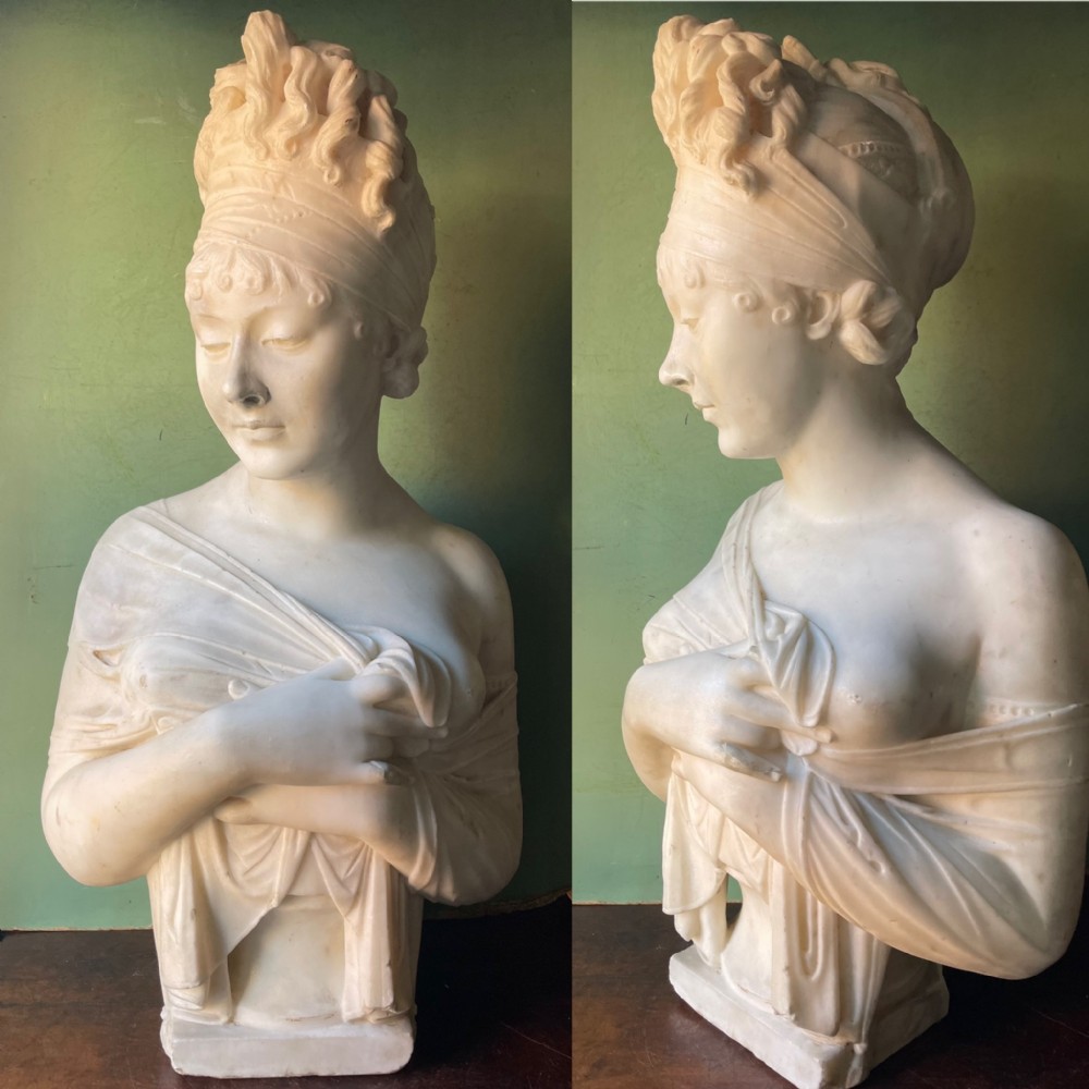 Large late C19th French carved statuary marble bust study of Madame Juliette Recamier after Joseph Chinard .