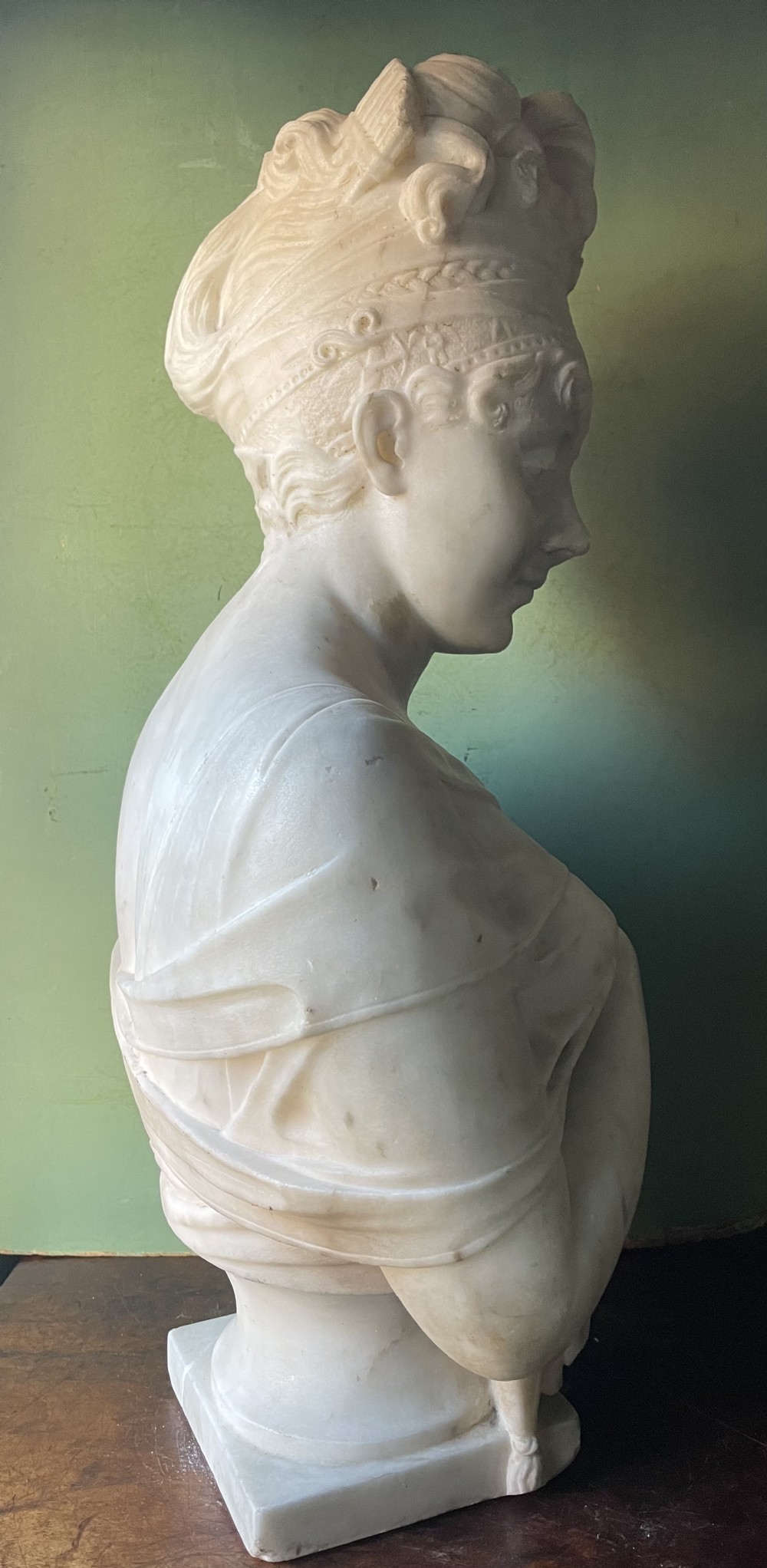 This large scale marble sculpture having great presence and decorative quality, in addition to the intriguing back-story of the subject.