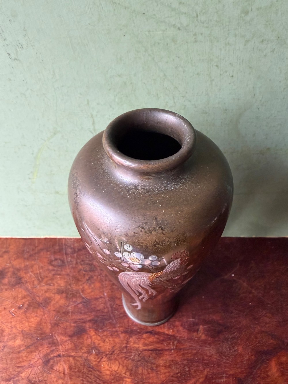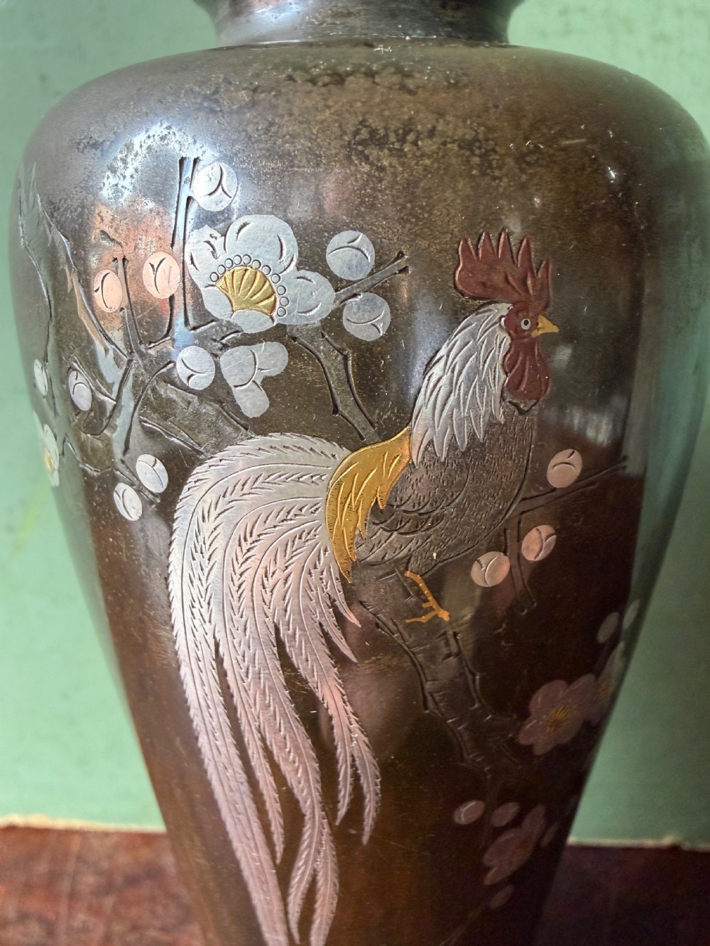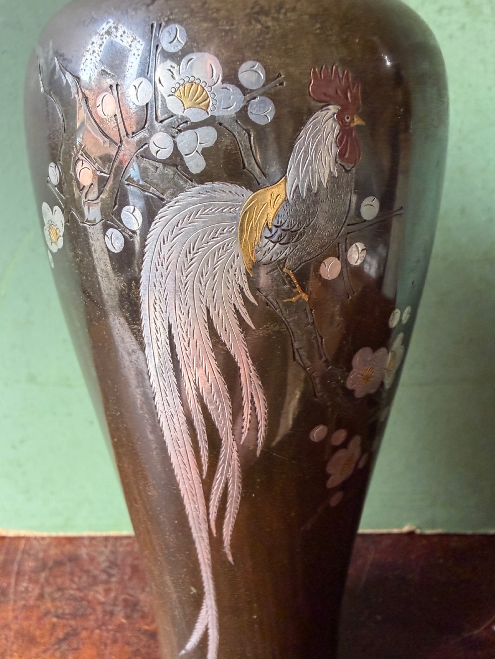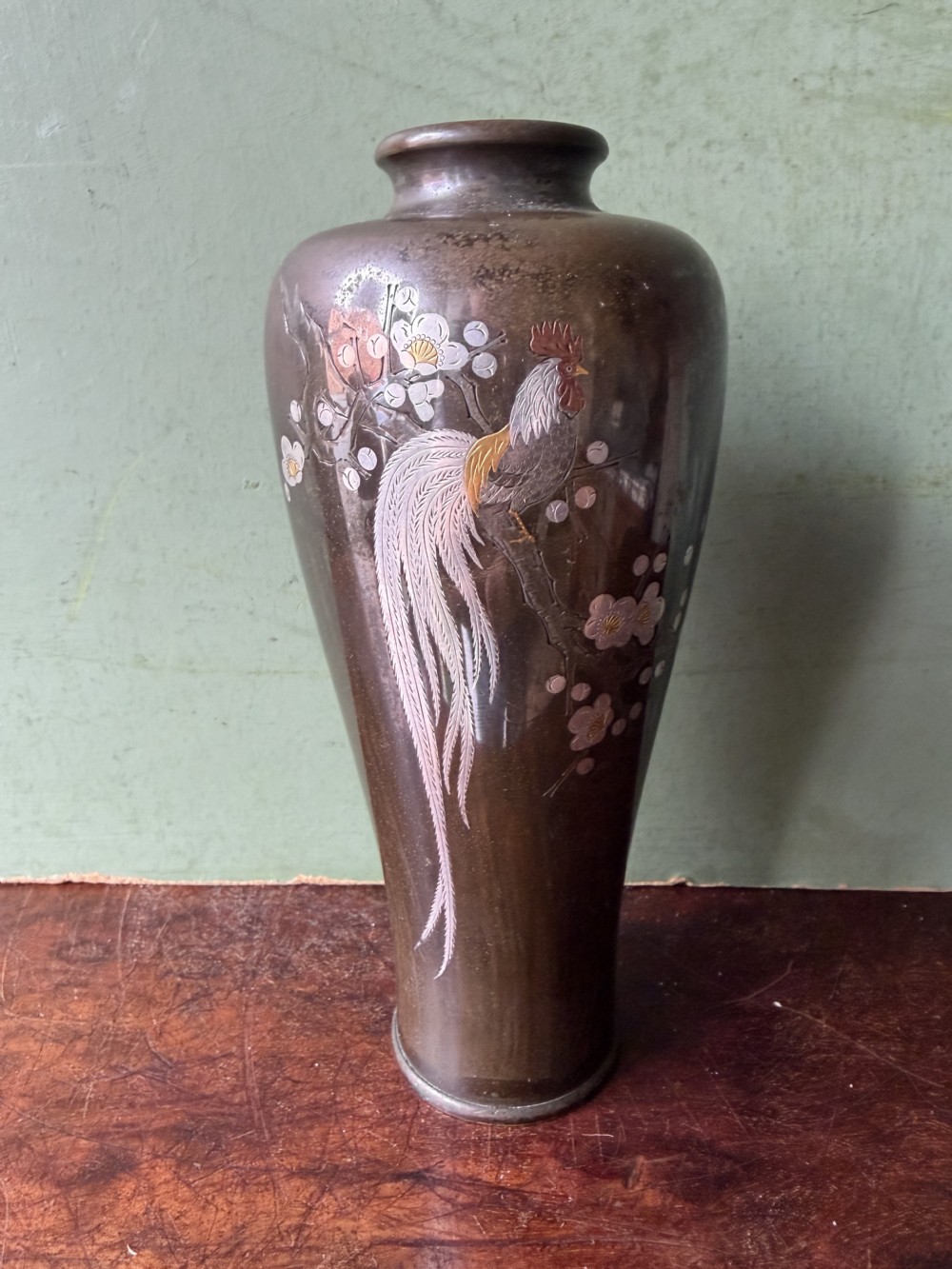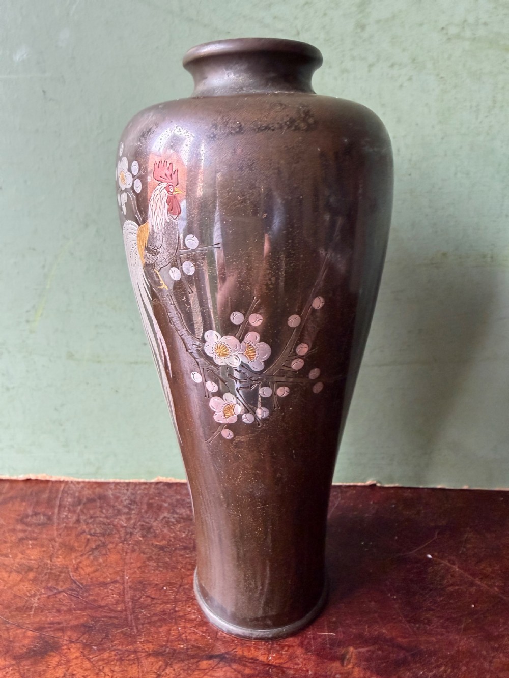 Slender tapering ovoid body patinated bronze vase attractively inlaid with a cockerel and floral design, with engraved silver ,copper and brass inlay . The reverse of the vase with a twin character engraved signature.