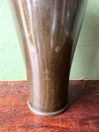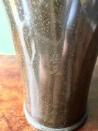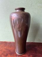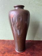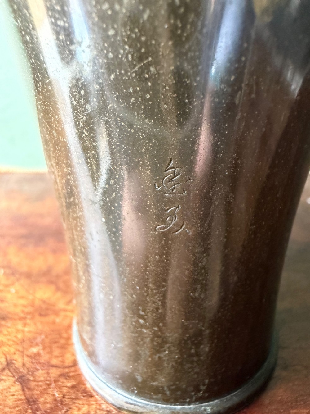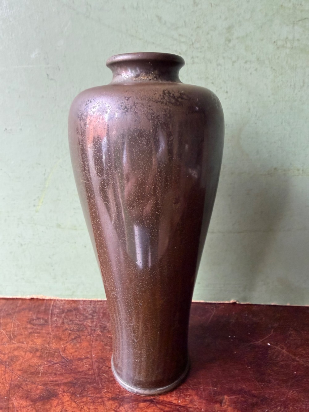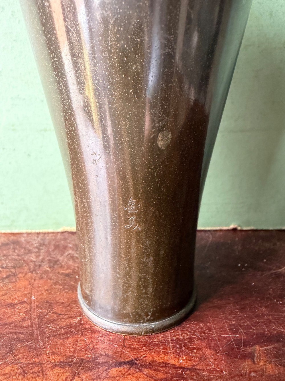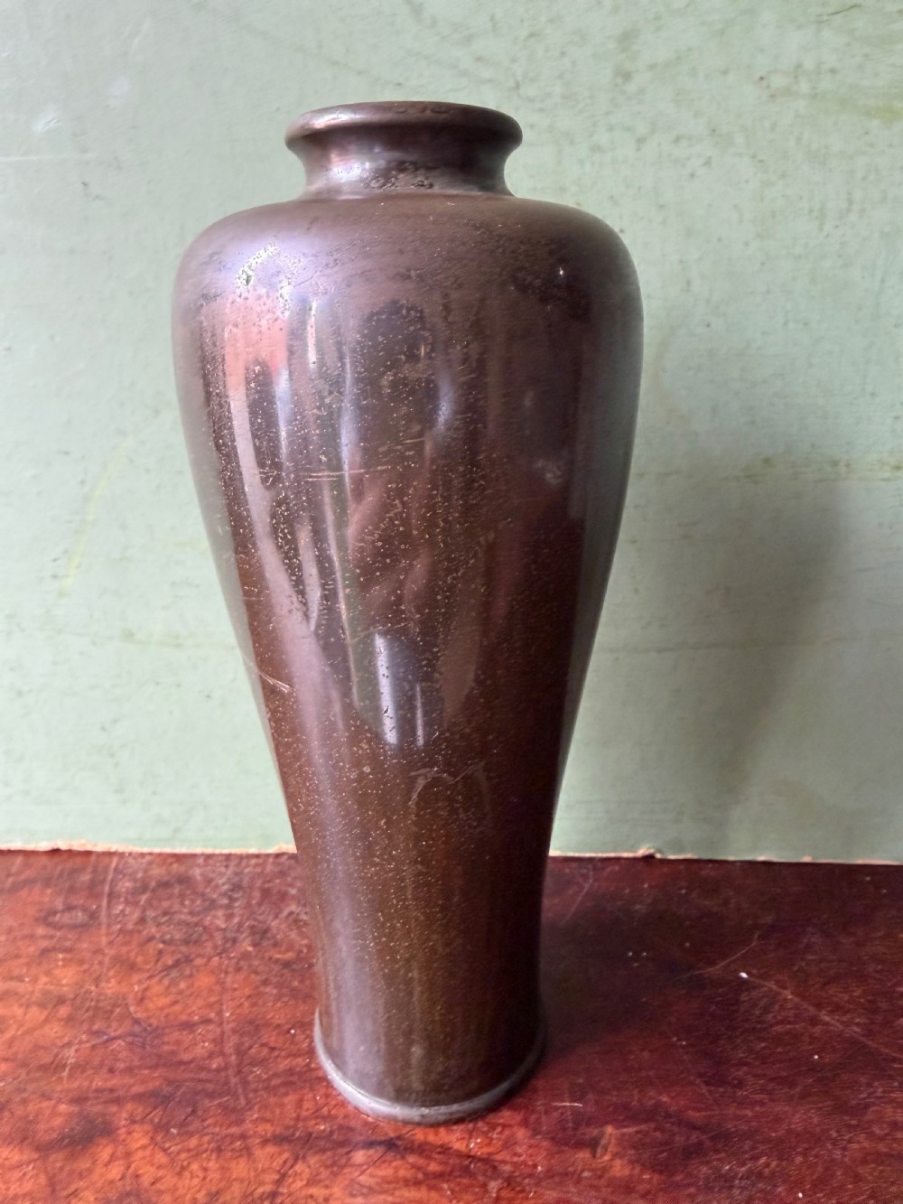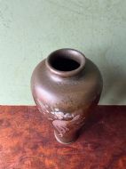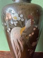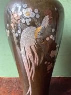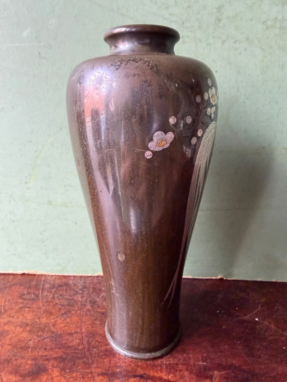 Slender tapering ovoid body patinated bronze vase attractively inlaid with a cockerel and floral design, with engraved silver ,copper and brass inlay . The reverse of the vase with a twin character engraved signature.