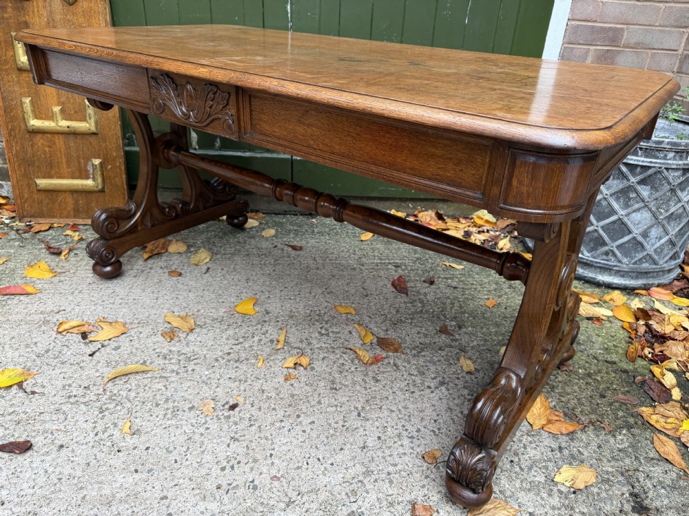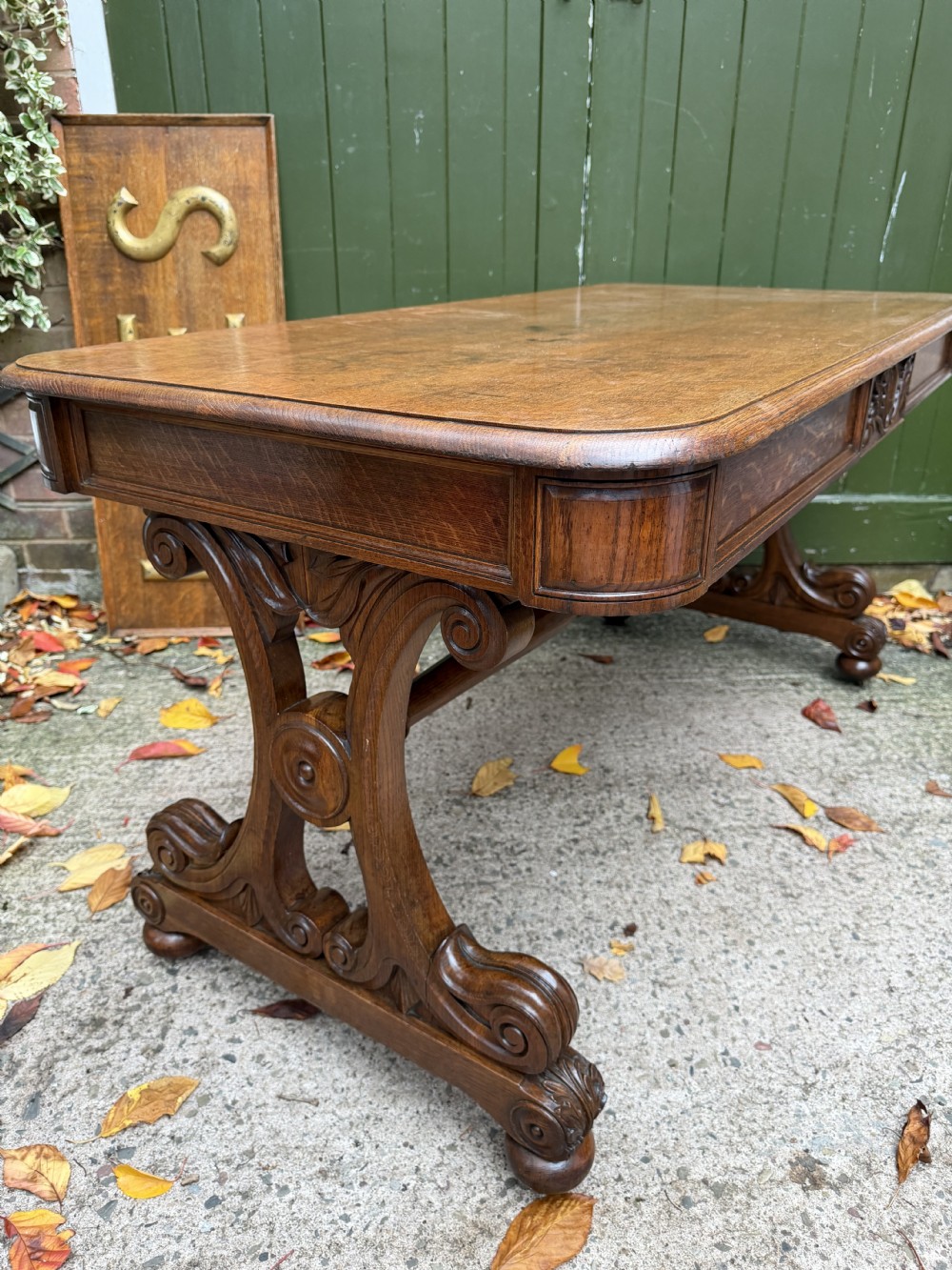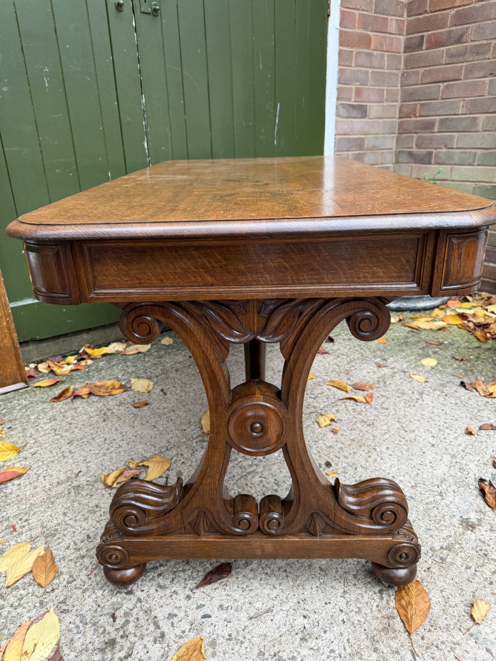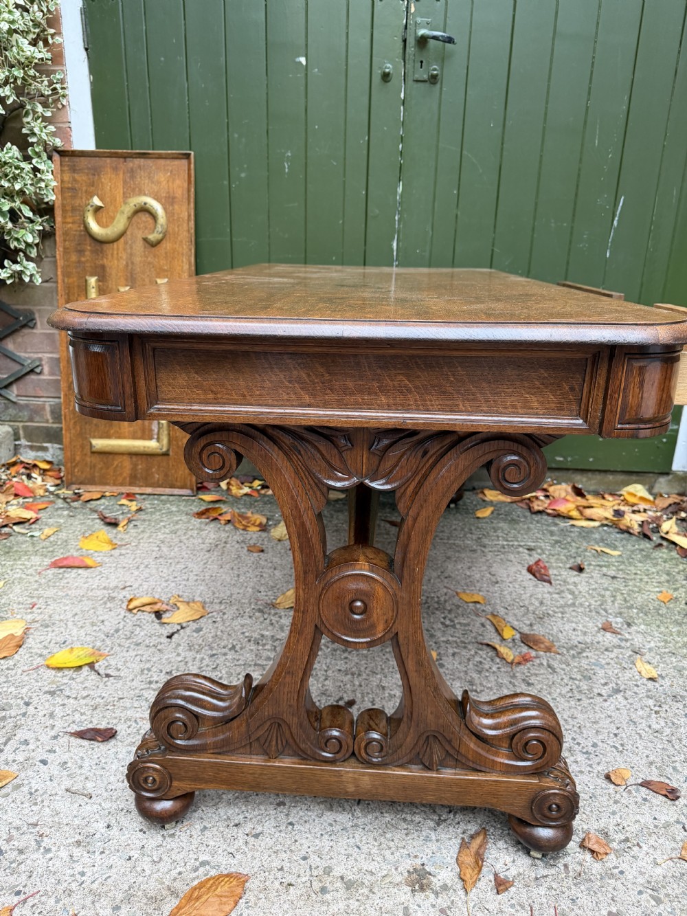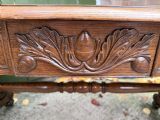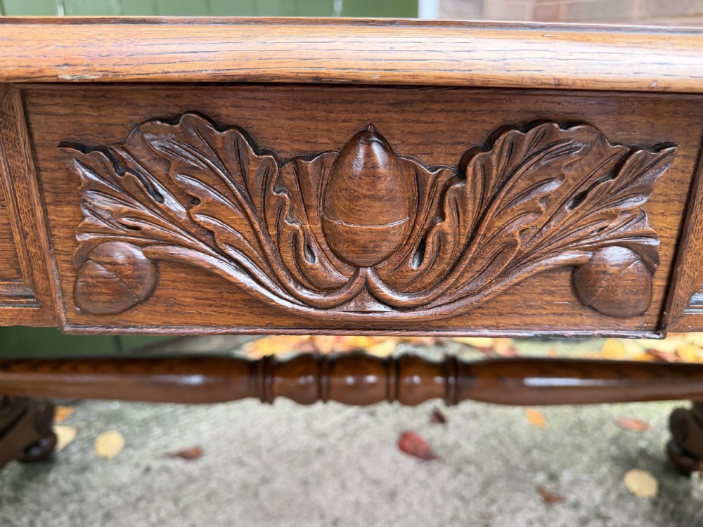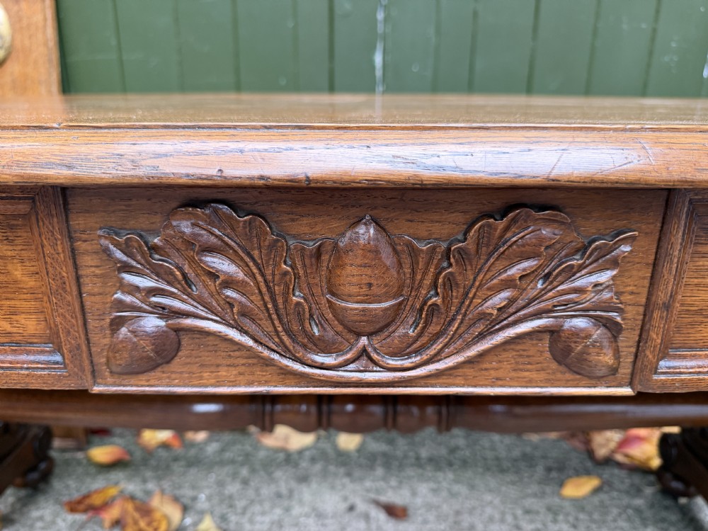 The frieze to one side fitted two ‘blind’ drawers with a central rectangular tablet carved with an acorn and oak leaves . The verso of corresponding design with panelled ‘dummy’ drawers. The ends of the friezes with reserve panels, the moulded edge top with rounded corners.