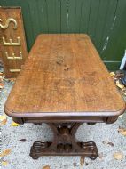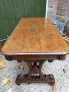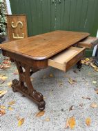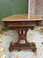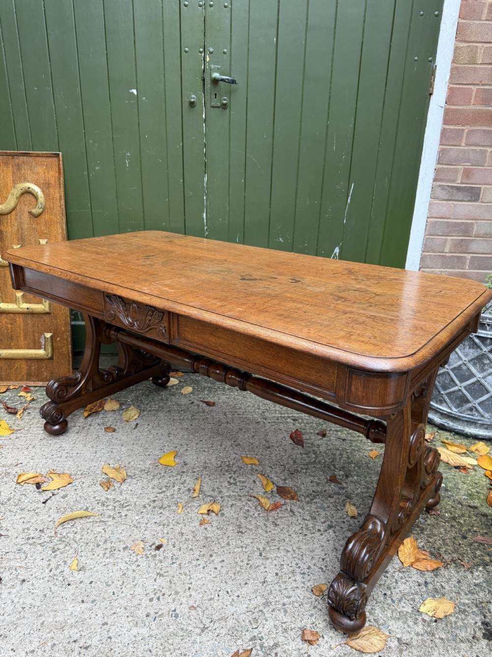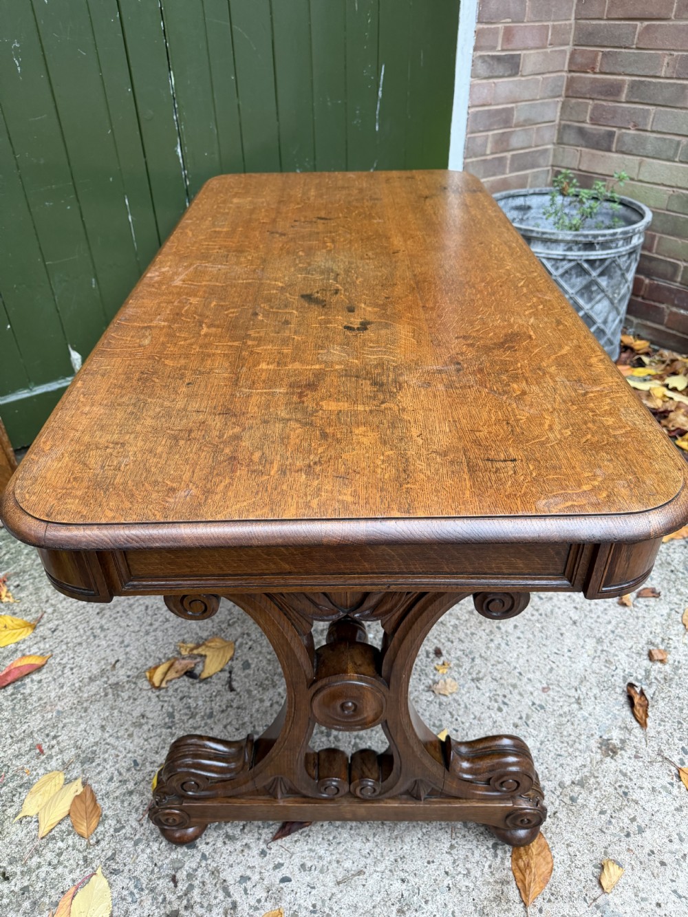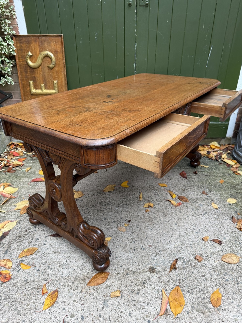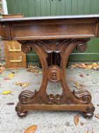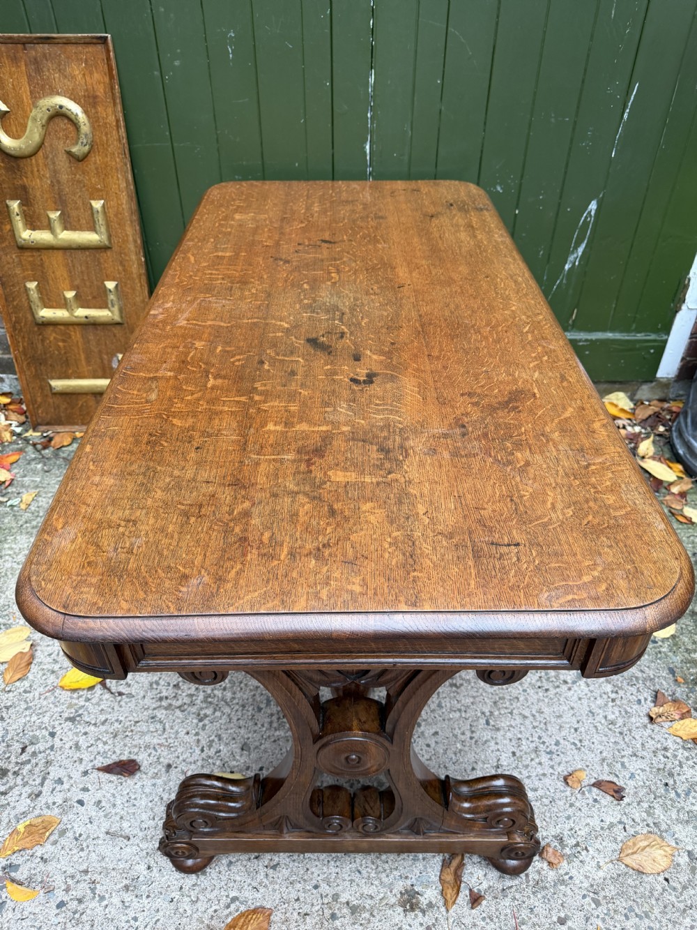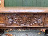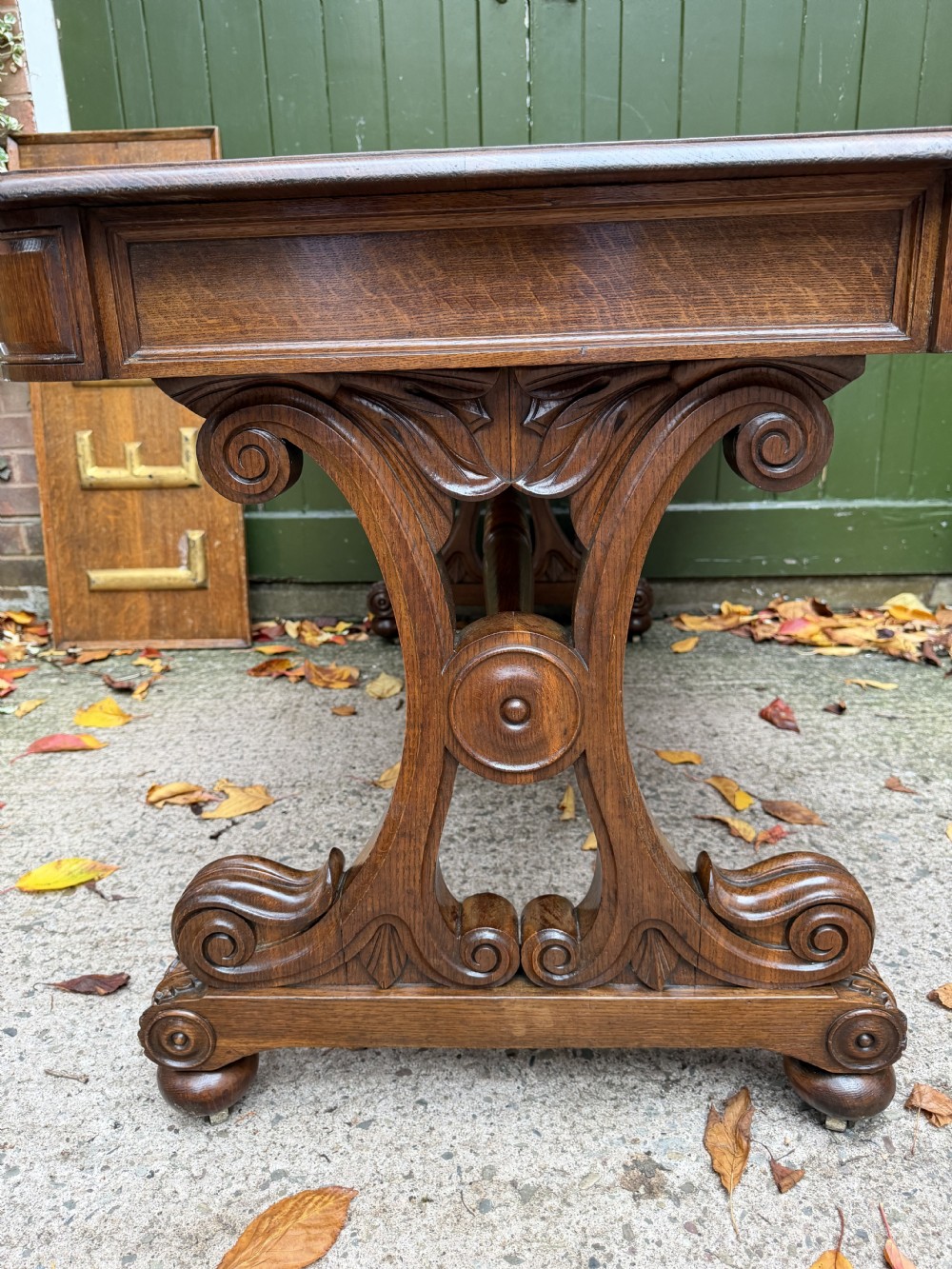 The frieze to one side fitted two ‘blind’ drawers with a central rectangular tablet carved with an acorn and oak leaves . The verso of corresponding design with panelled ‘dummy’ drawers. The ends of the friezes with reserve panels, the moulded edge top with rounded corners.