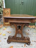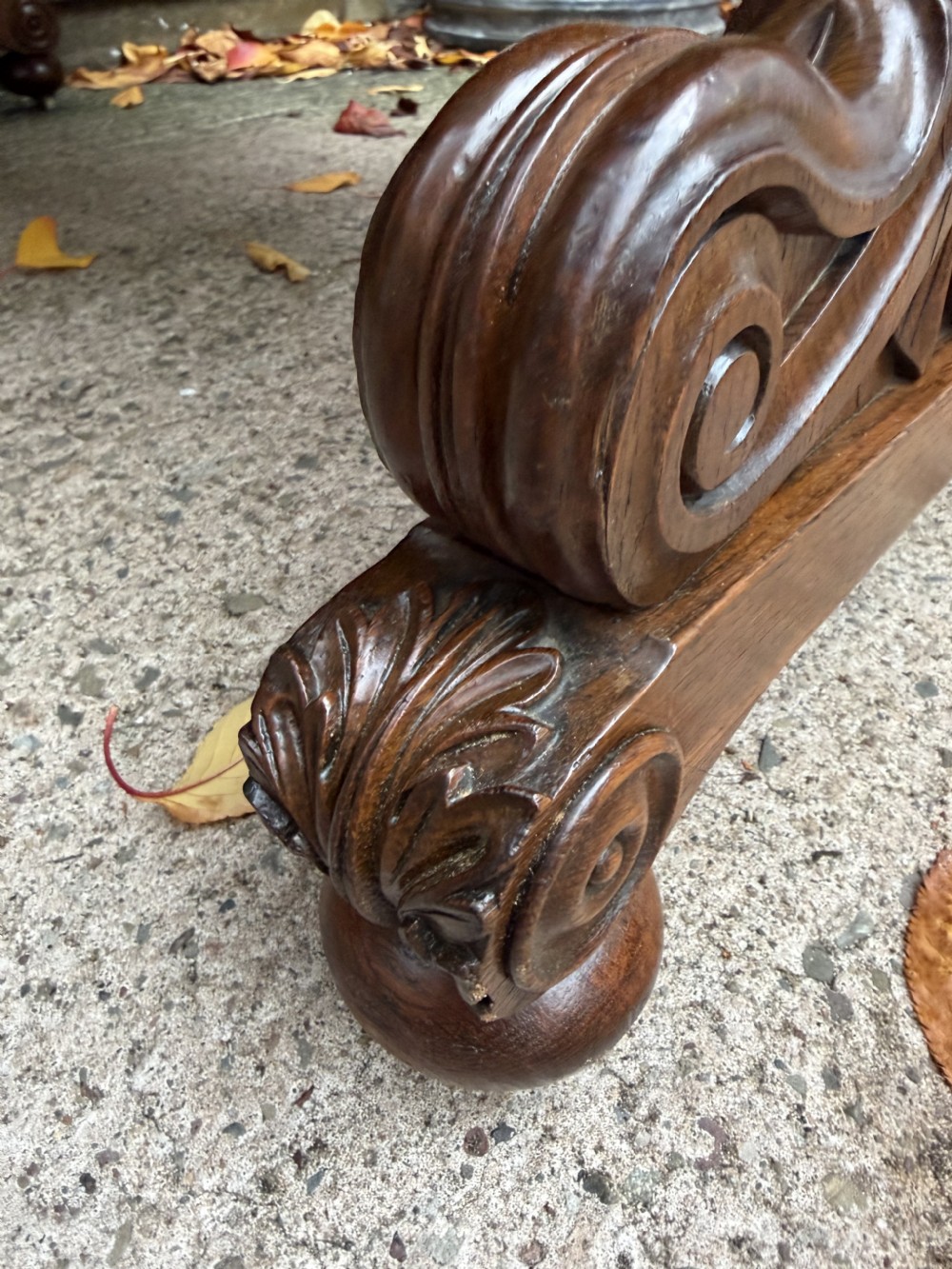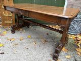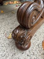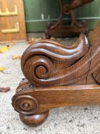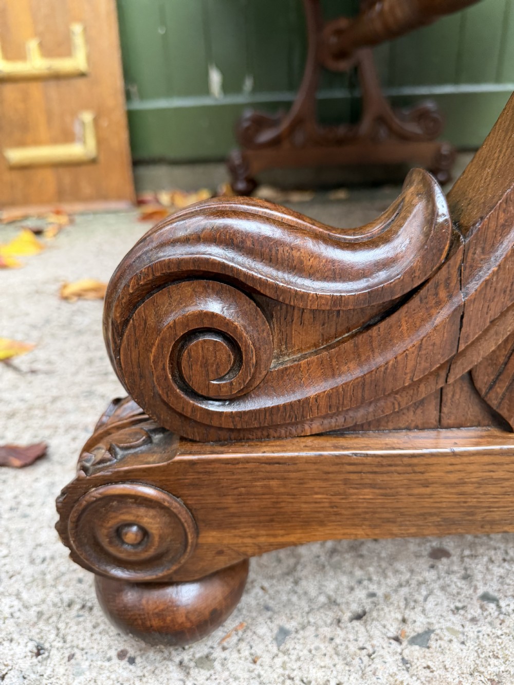 Raised on scroll leaf-carved end supports joined by a turned stretcher, having compressed bun feet with concealed brass castors beneath.