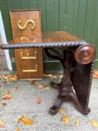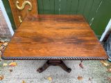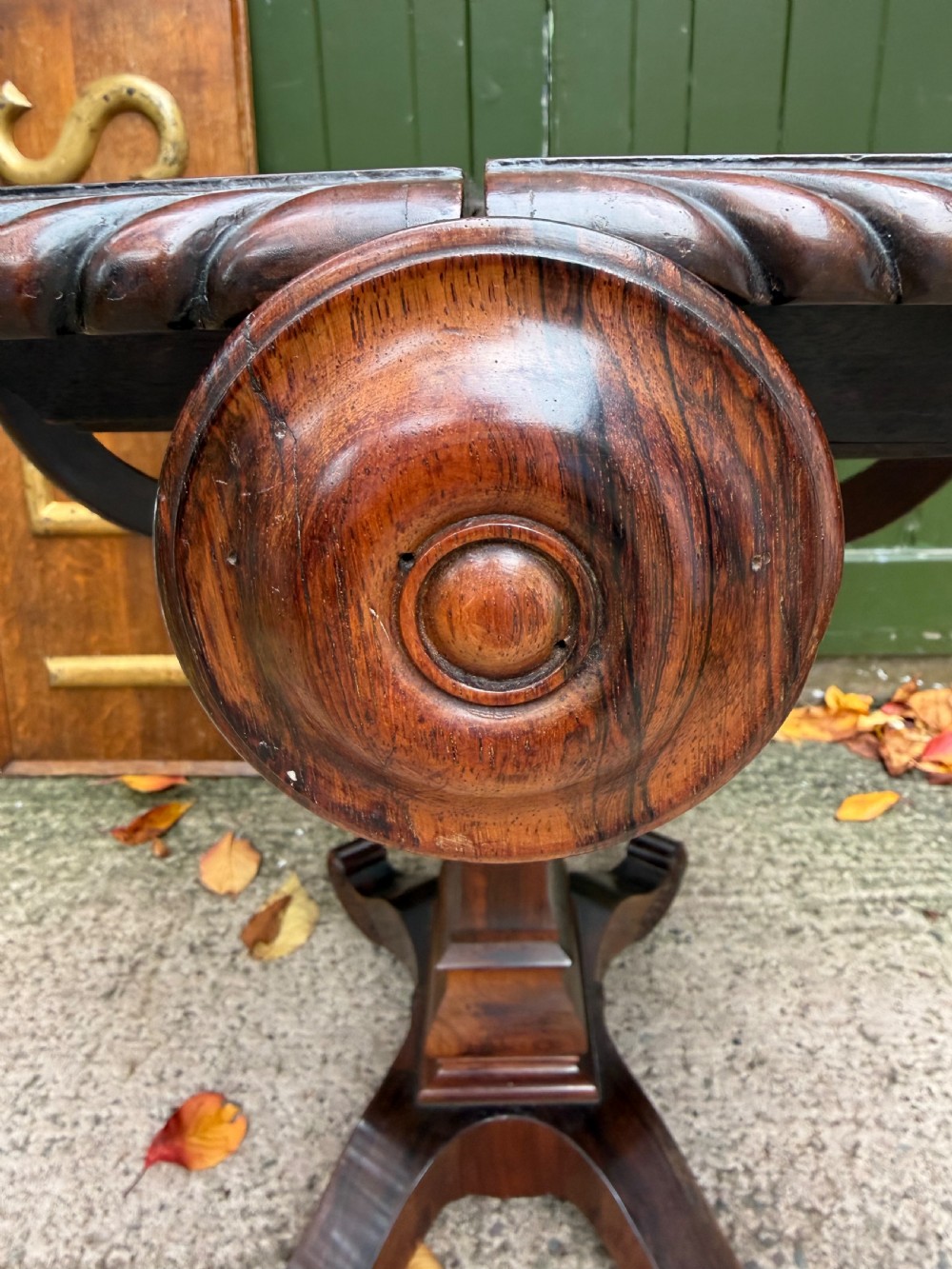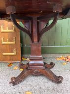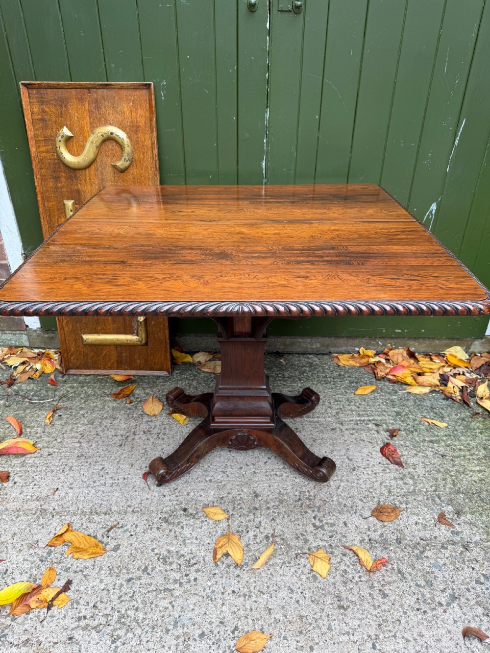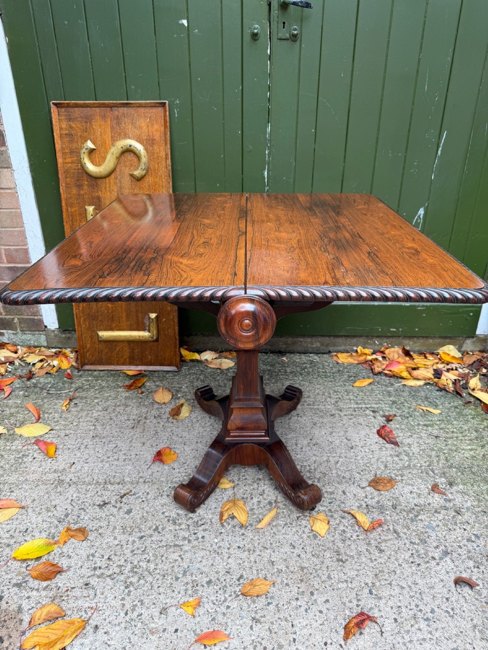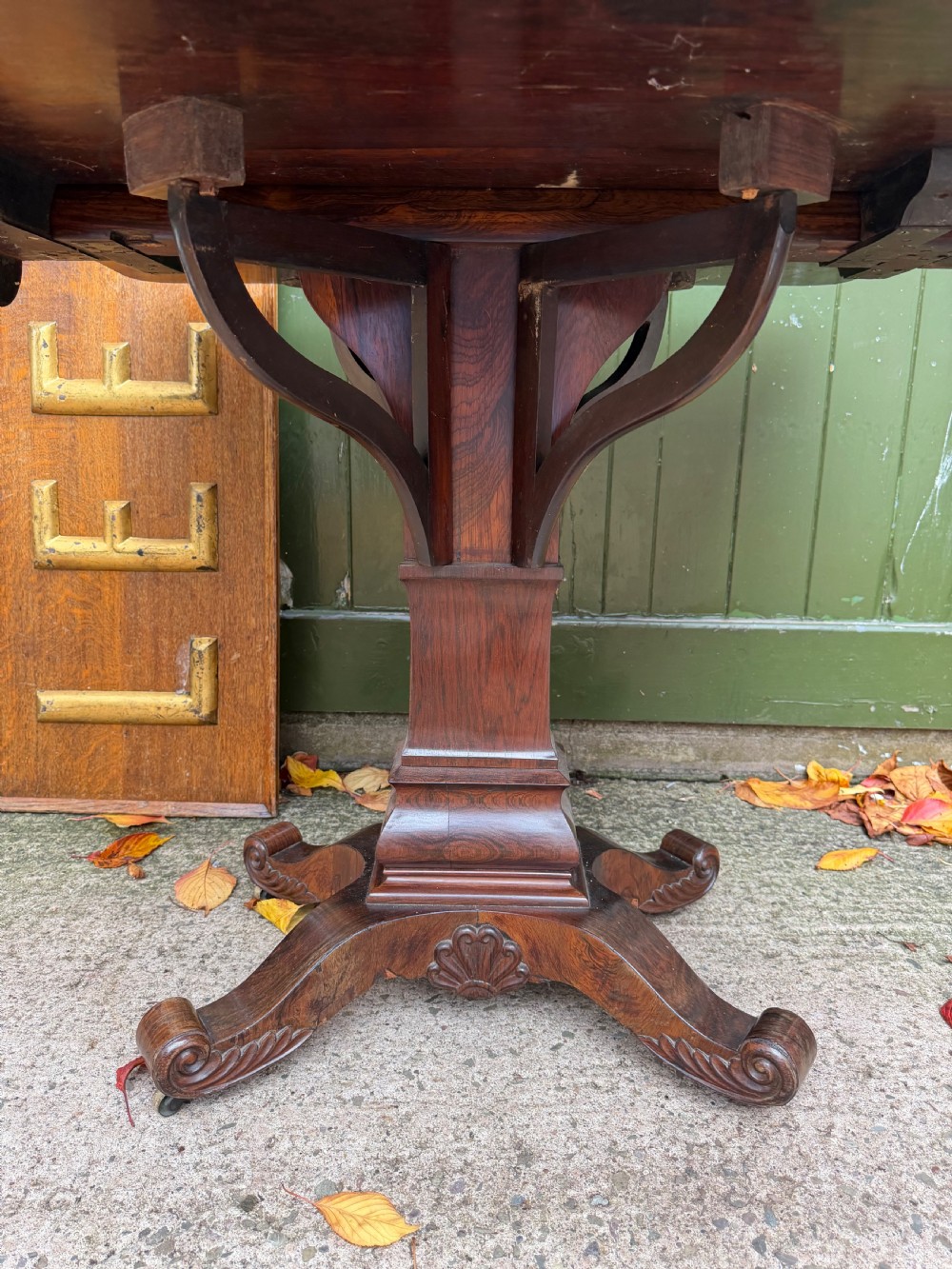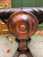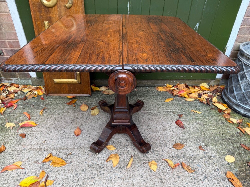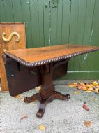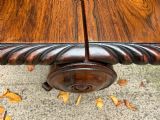 Being of very narrow proportions when folded down, the centre being a circular roll-bar action with carved paterae ends . The twin drop leaves with a gadrooned carved edge , each supported on two shaped fold-out brackets when raised. The table raised on a vase-shaped central pillar with 4 scroll feet having concealed brass castors beneath, and leaf carved detail. The centre of the base of the pillar support with a carved anthemion motif .
