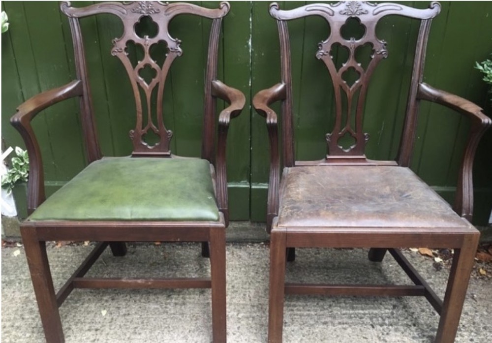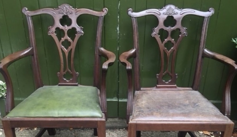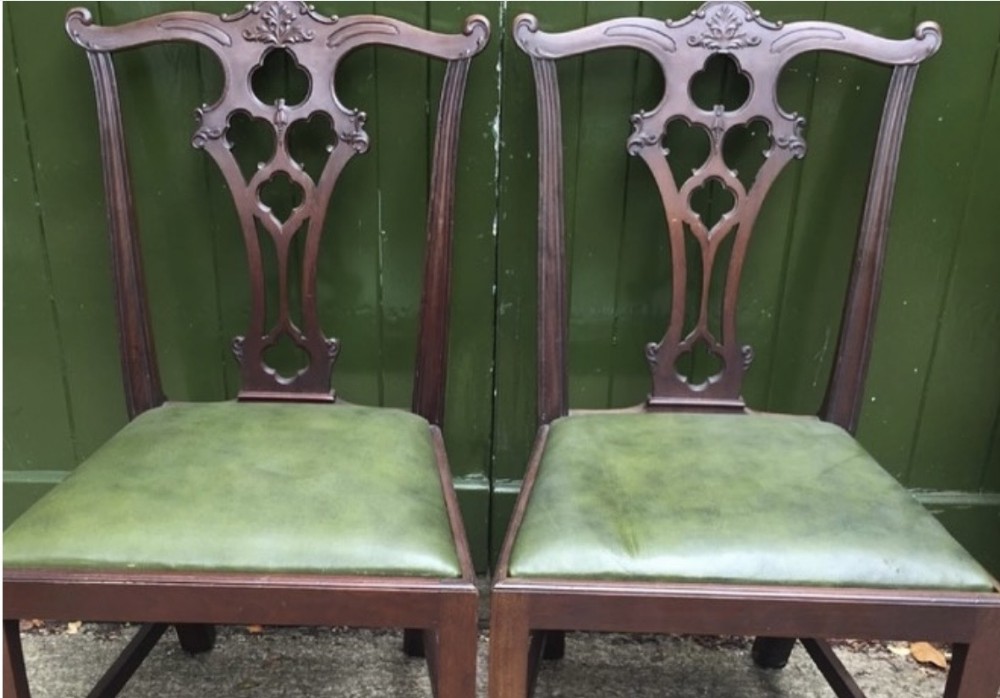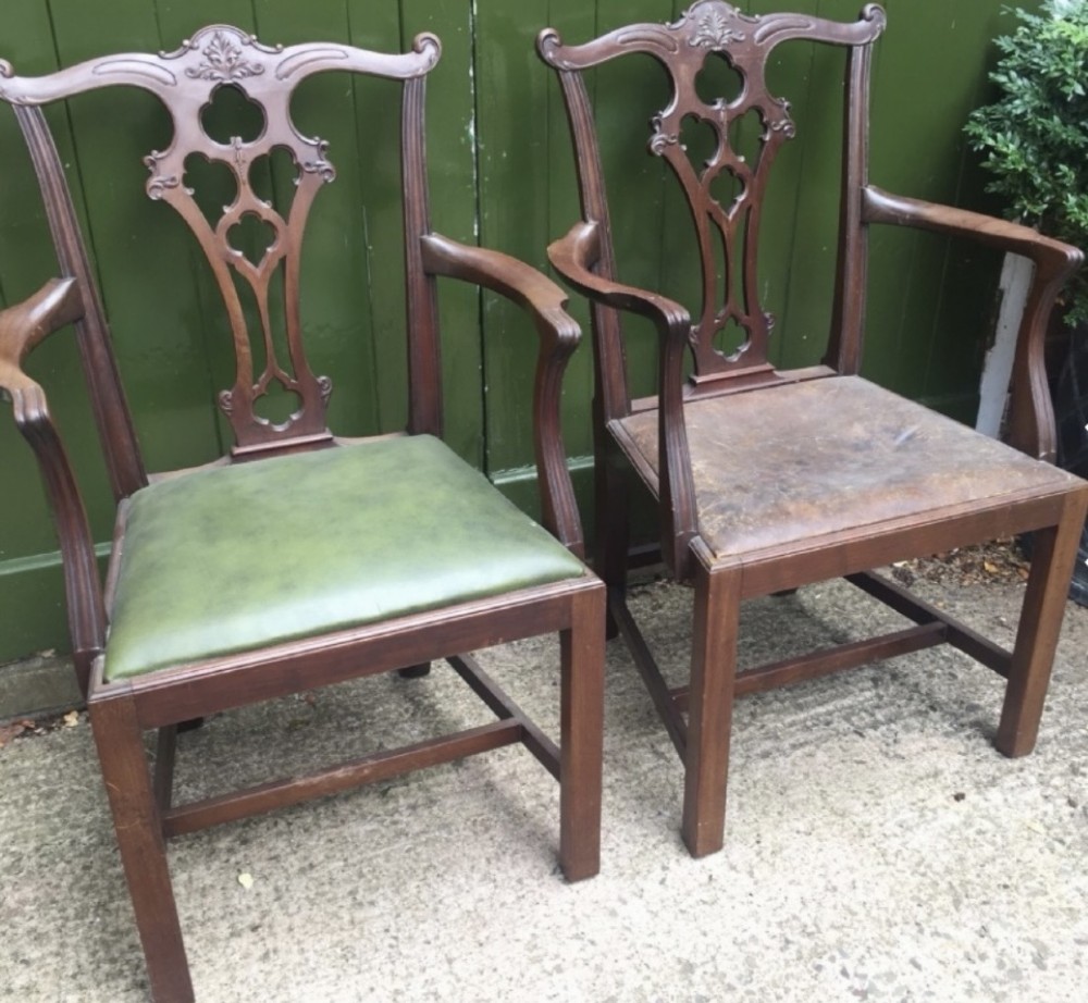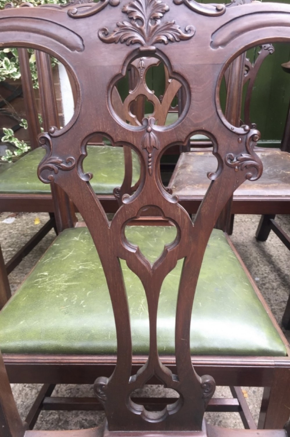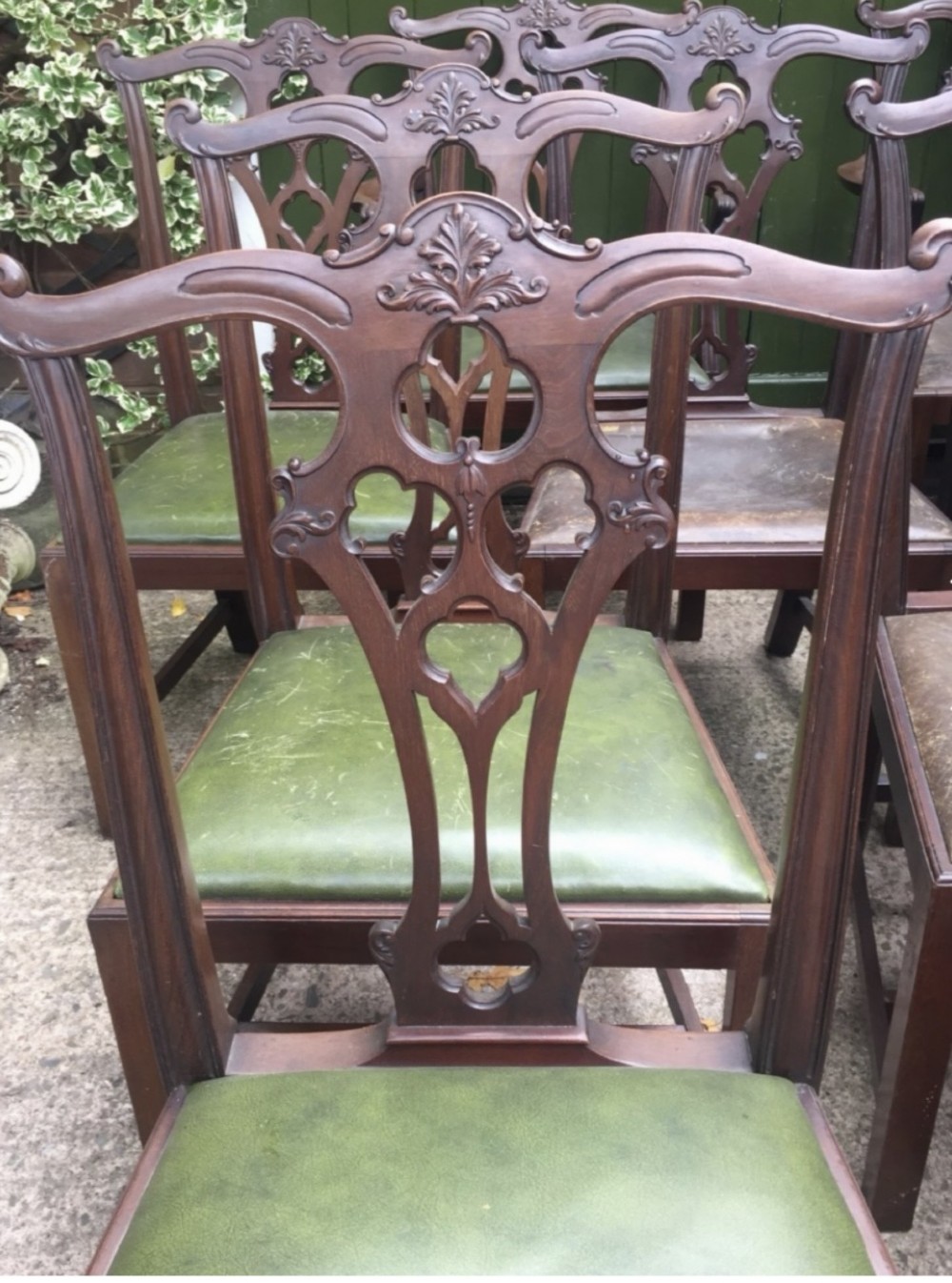 The selected grade of mahogany having achieved a rich colour and patina, the surface having the appearance of a set of C18th period chairs .The frames in excellent condition with no breaks , damage or repairs. The leather-covered seats in need of re-upholstering, which could be completed to client’s specification and choice of leather or fabric at cost price (ie .not included in price) .