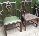 Quality set of 12 carved mahogany dining chairs comprising 10 single chairs and a pair of matching arm or ‘carver’ chairs. Authentic copies of C18th Chippendale period chairs with carved detail interlaced splats below shaped top rails , raised on square section “Marlborough’ legs joined by H-stretchers and having ‘drop-in’ upholstered seats .