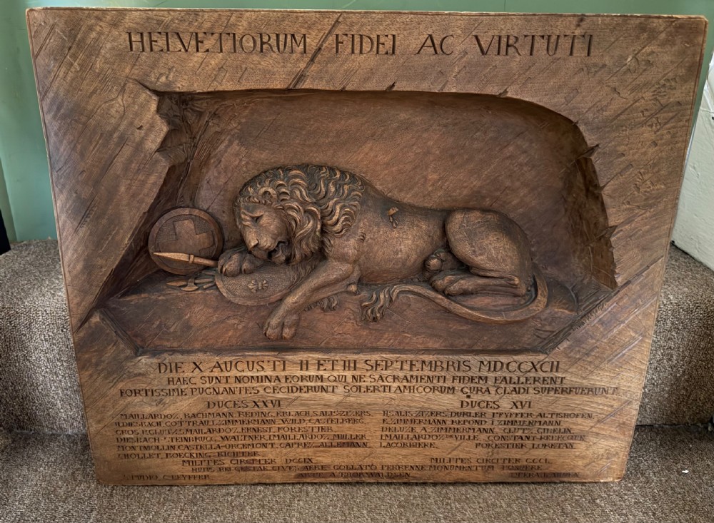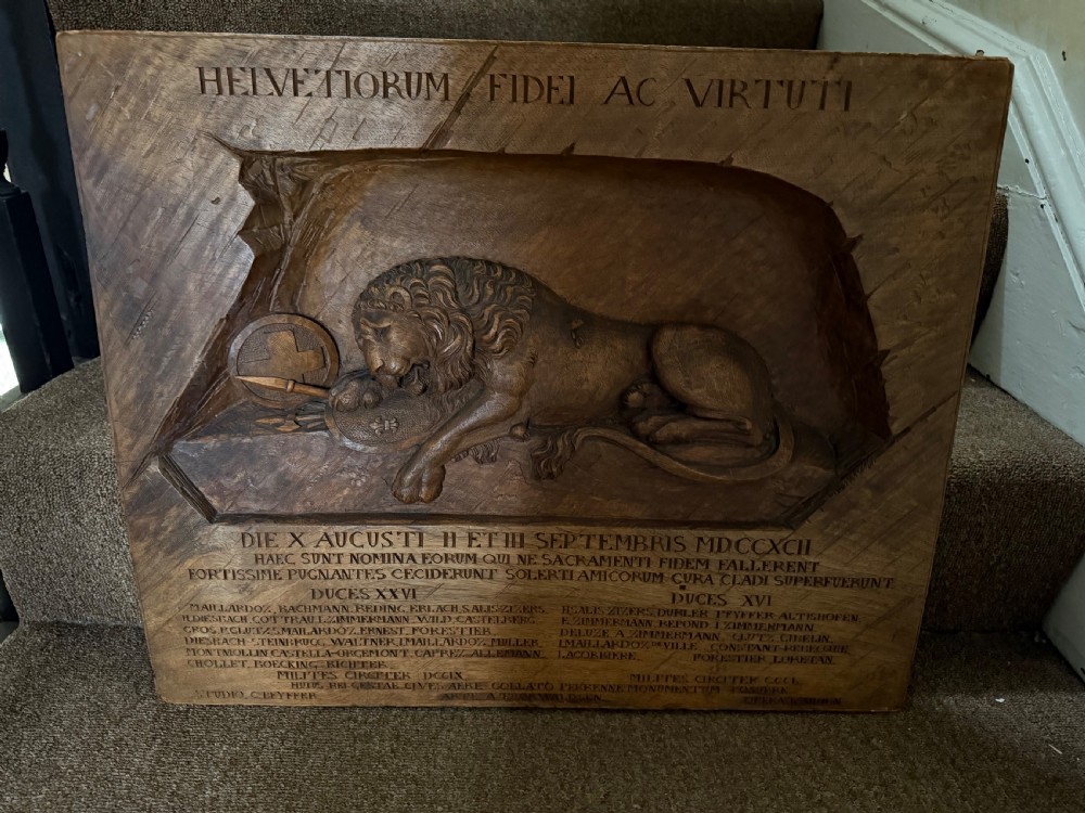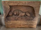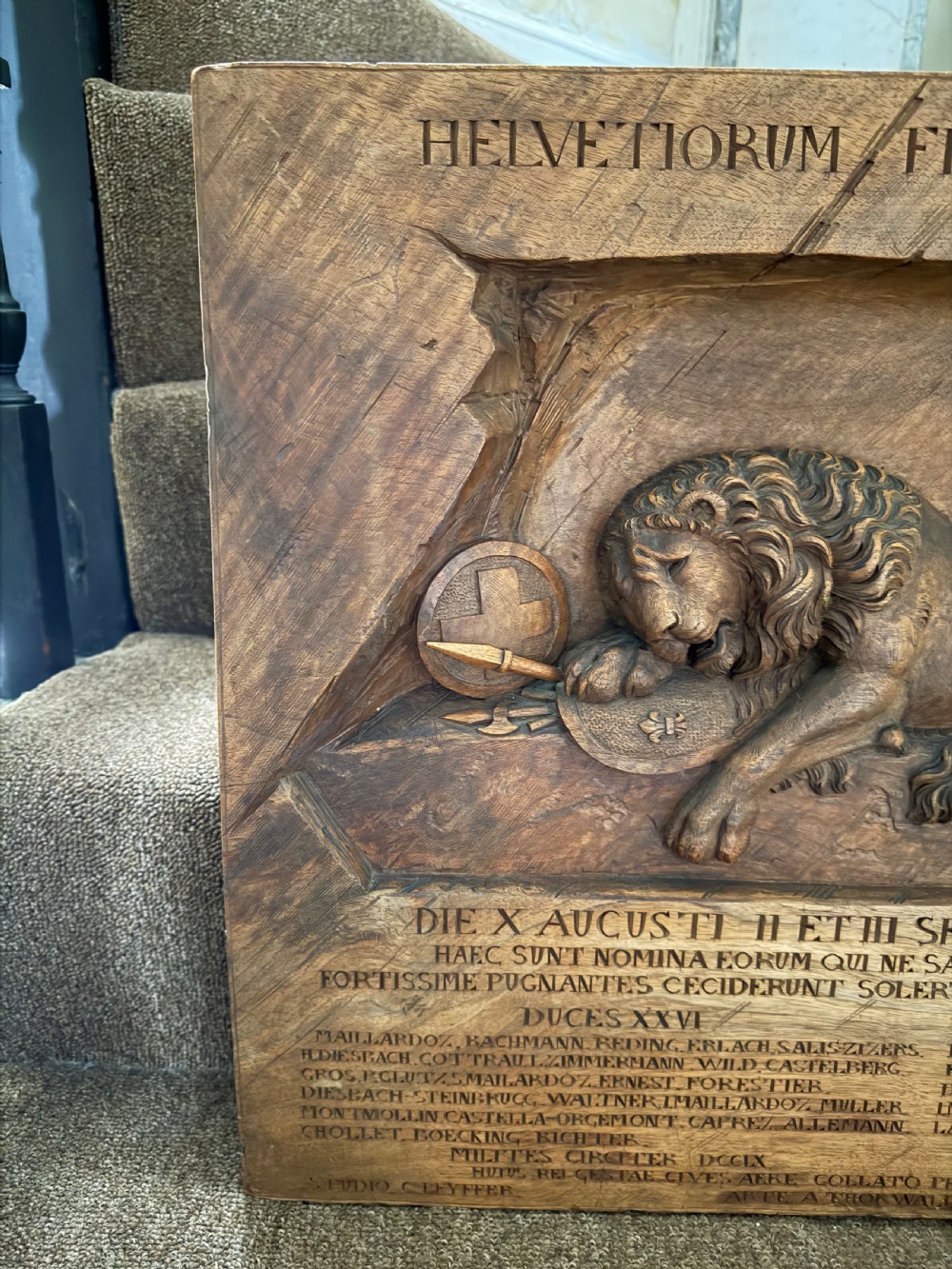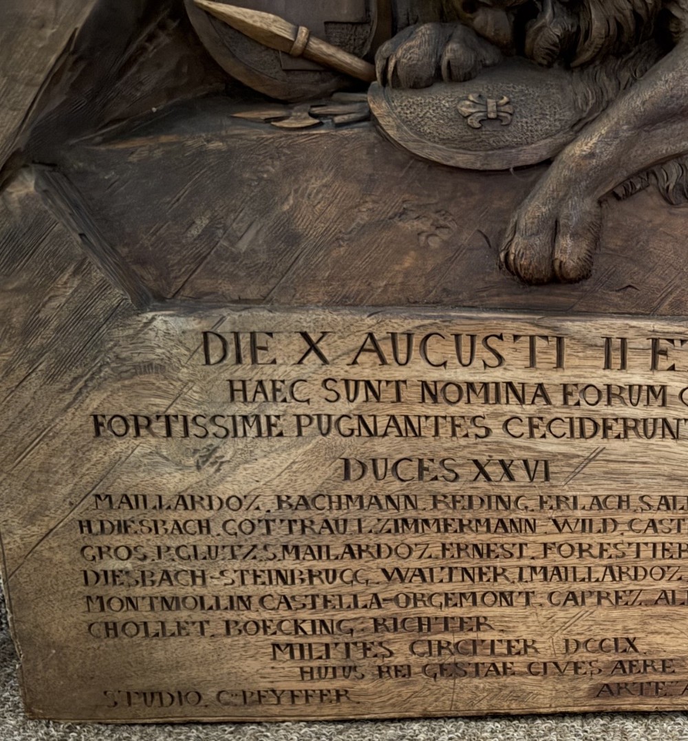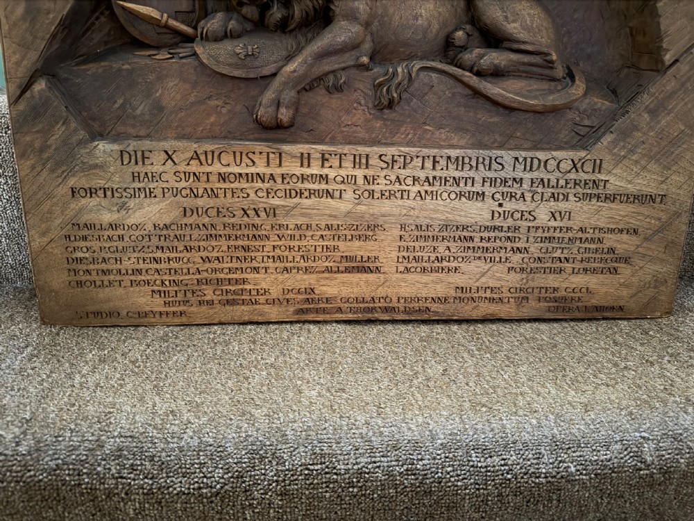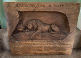Part of the inscription to the base of the panel ( STUDIO C.PYFFER ARTE THORVALDSEN OPERA L .AHORN ) relates to the genesis of the work, conceived from the idea of a local patrician , Karl Pyffer von Altishofen , a model was produced by Thorwaldsen in 1819 , and reproduced and sculpted on a grand scale by a local man Lukas Ahorn . The carved inscriptions below the lion , show the dates of the events together with a list of names.