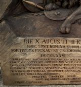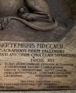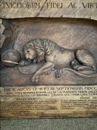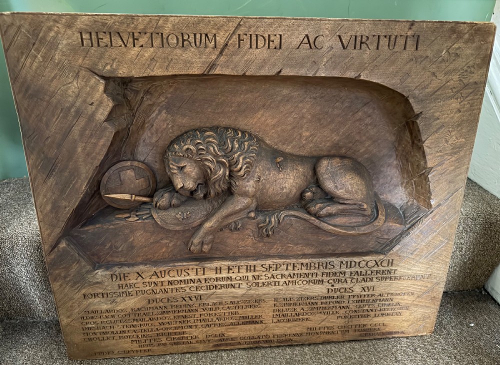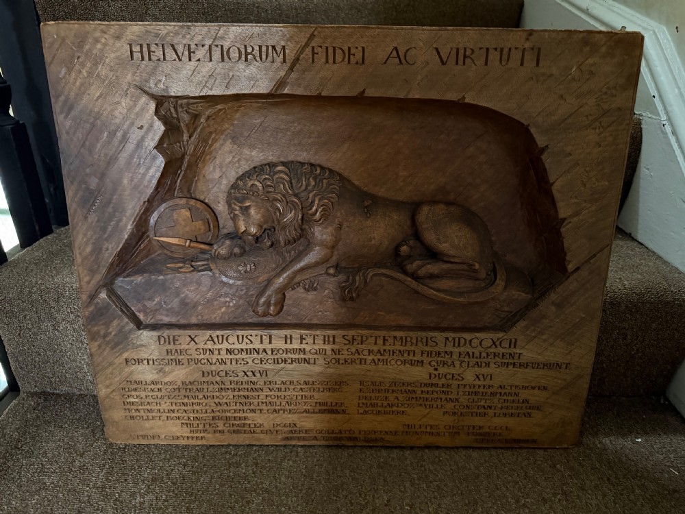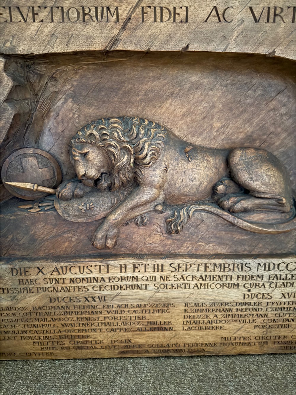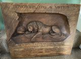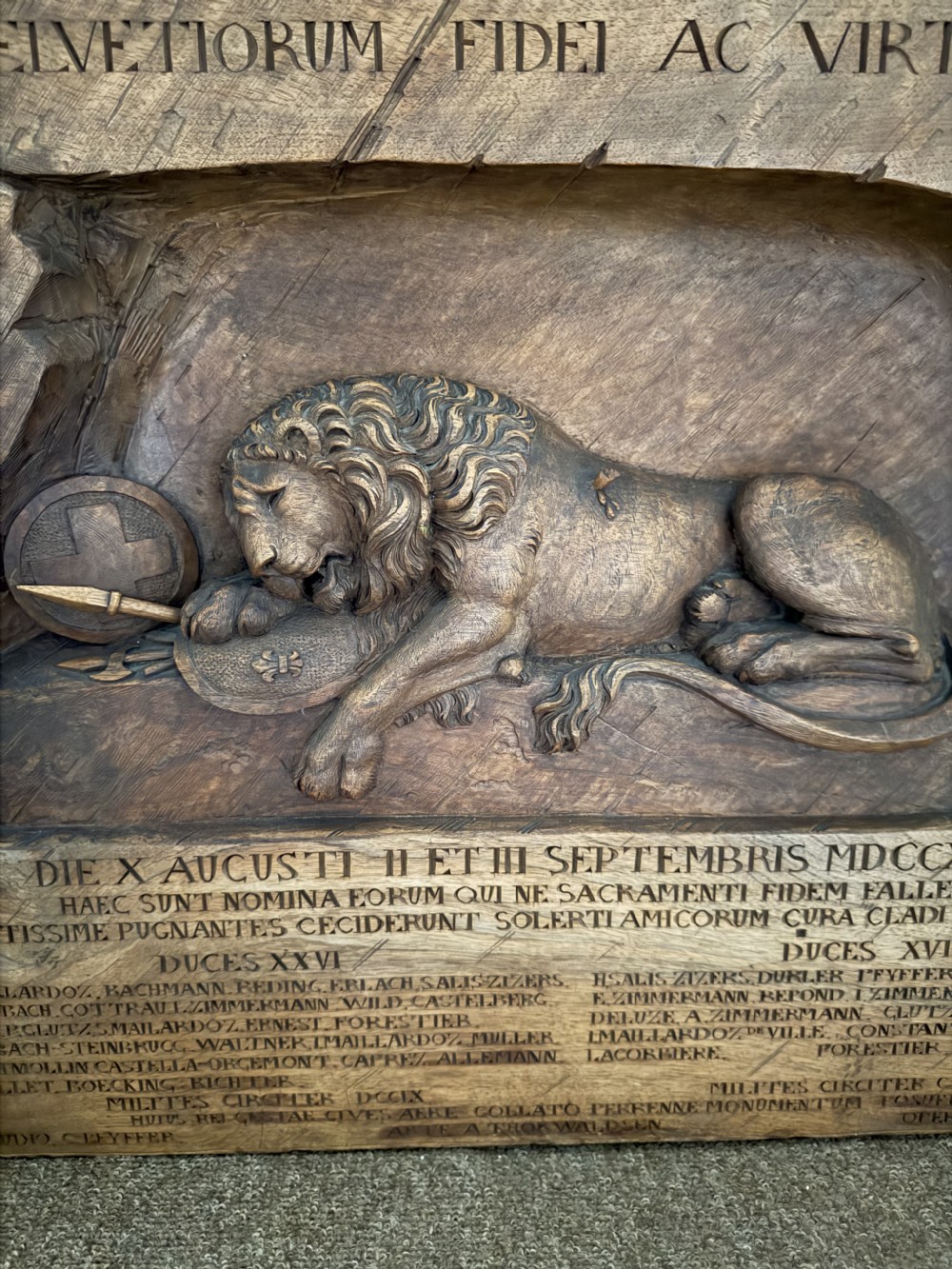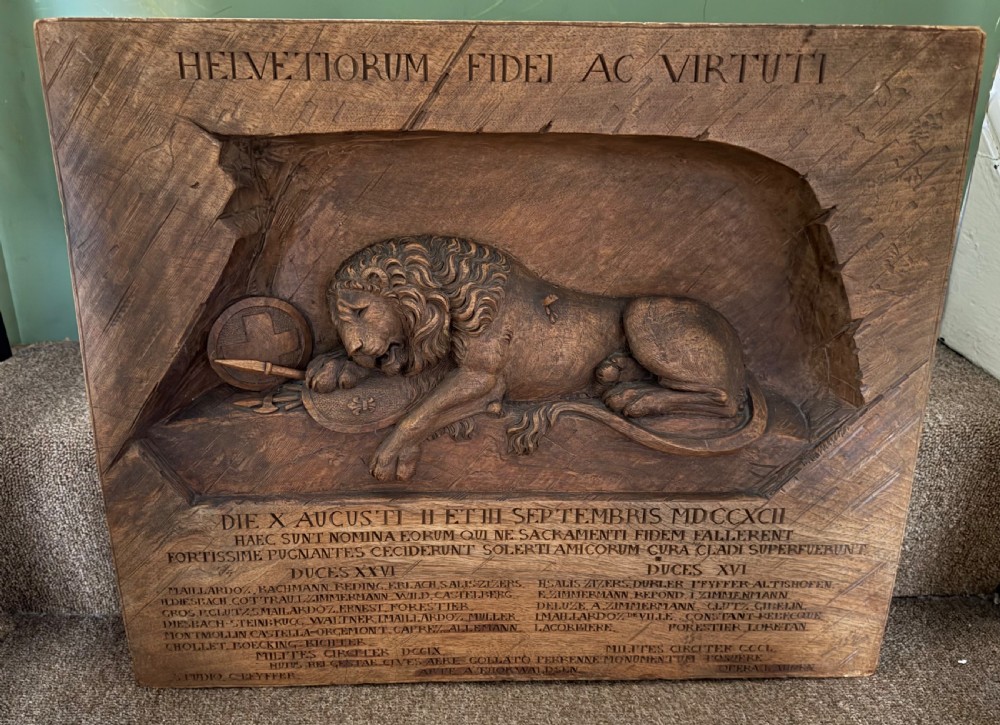 Part of the inscription to the base of the panel ( STUDIO C.PYFFER ARTE THORVALDSEN OPERA L .AHORN ) relates to the genesis of the work, conceived from the idea of a local patrician , Karl Pyffer von Altishofen , a model was produced by Thorwaldsen in 1819 , and reproduced and sculpted on a grand scale by a local man Lukas Ahorn . The carved inscriptions below the lion , show the dates of the events together with a list of names.