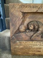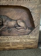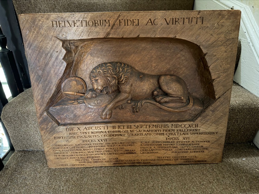 Well-executed carved panel of Bertel Thorvaldsen’s limestone monument inscribed in Latin “Helvetiorum Fidei Ac Virtuti “ ( The Loyalty and Virtue of the Swiss) commemorating the Royal Swiss Guards who died trying to protect Louis XVI in 1792 when the Tuileries, Paris, were stormed.