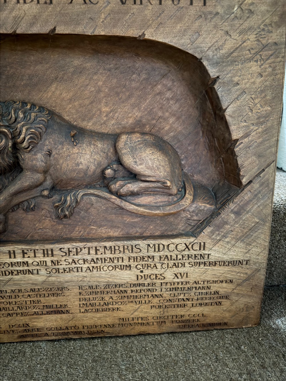 Large late C19th / early C20th Swiss or ‘Black Forest’ relief carved walnut or linden wood panel depicting “The Lion of Lucerne” .