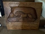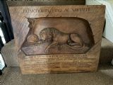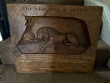 In excellent original condition with a pleasing dry surface and pale colour. The lion deeply and skilfully carved with naturalistic fur and mane , and the whole with extensive carved scripted lettering. The verso fitted with a wall-hanging wire .