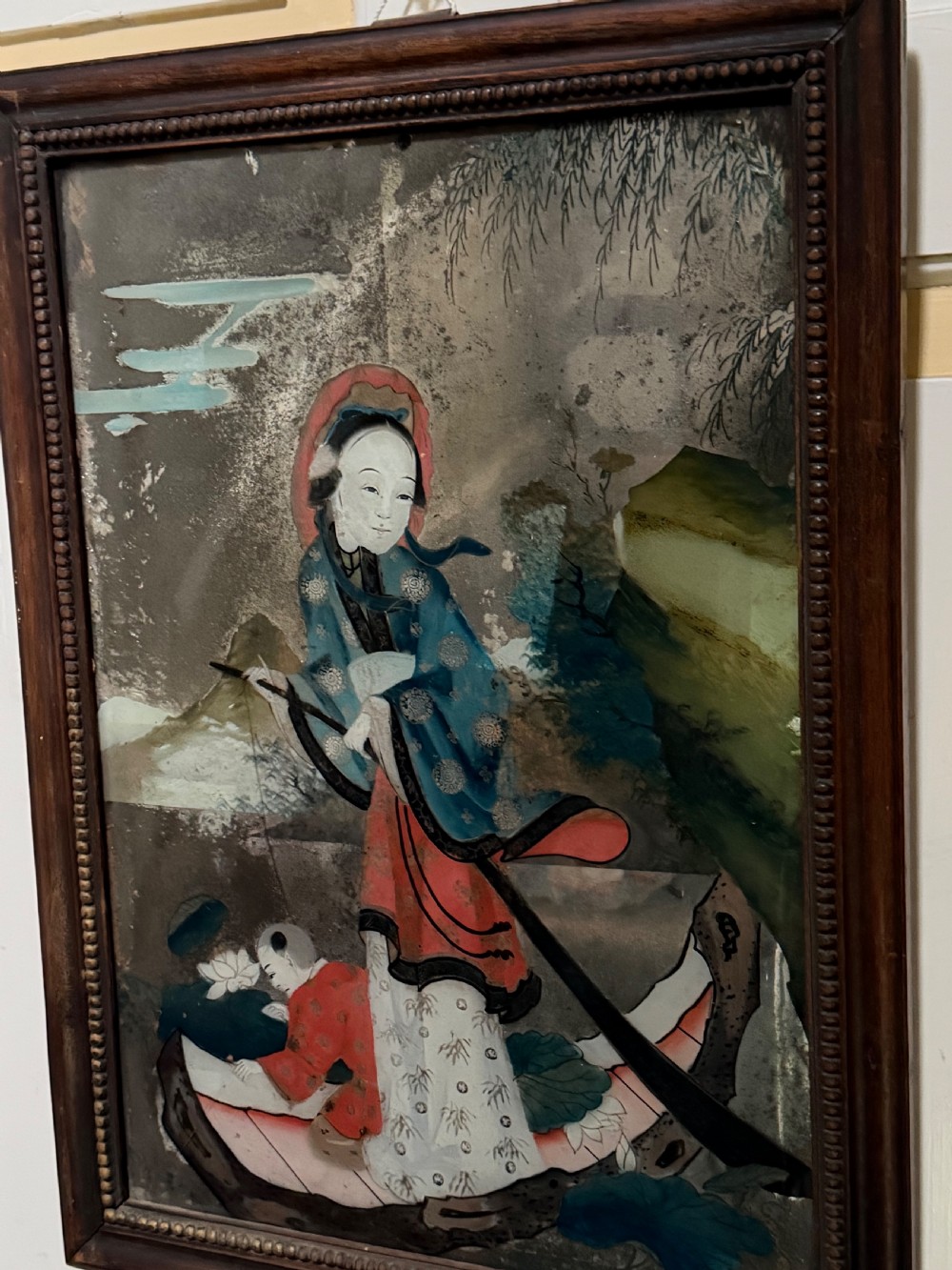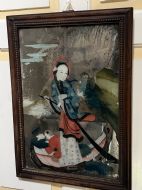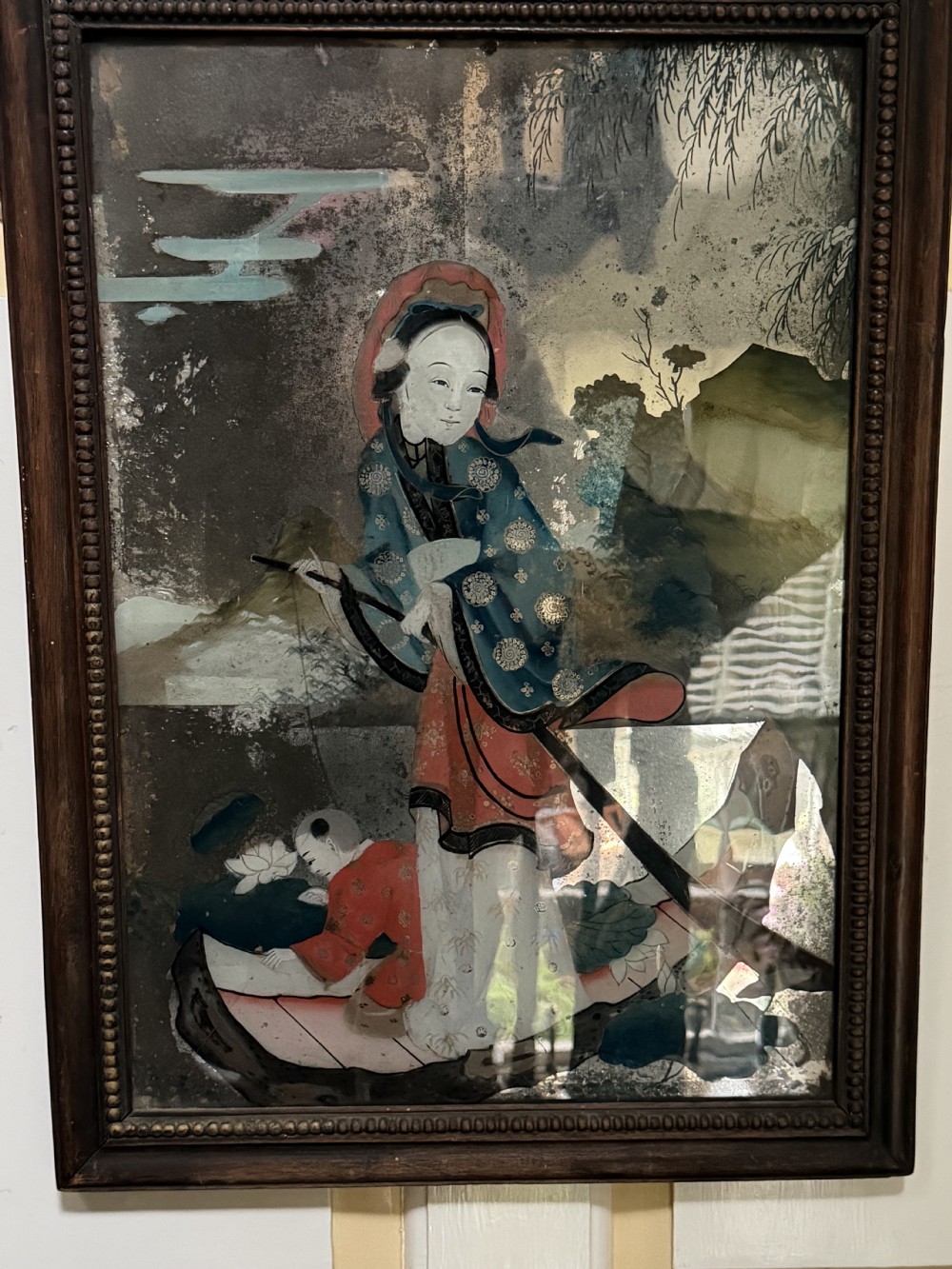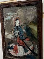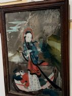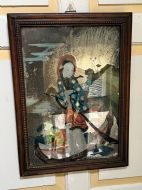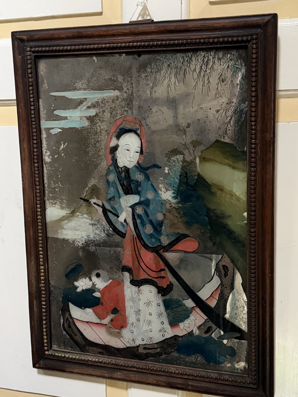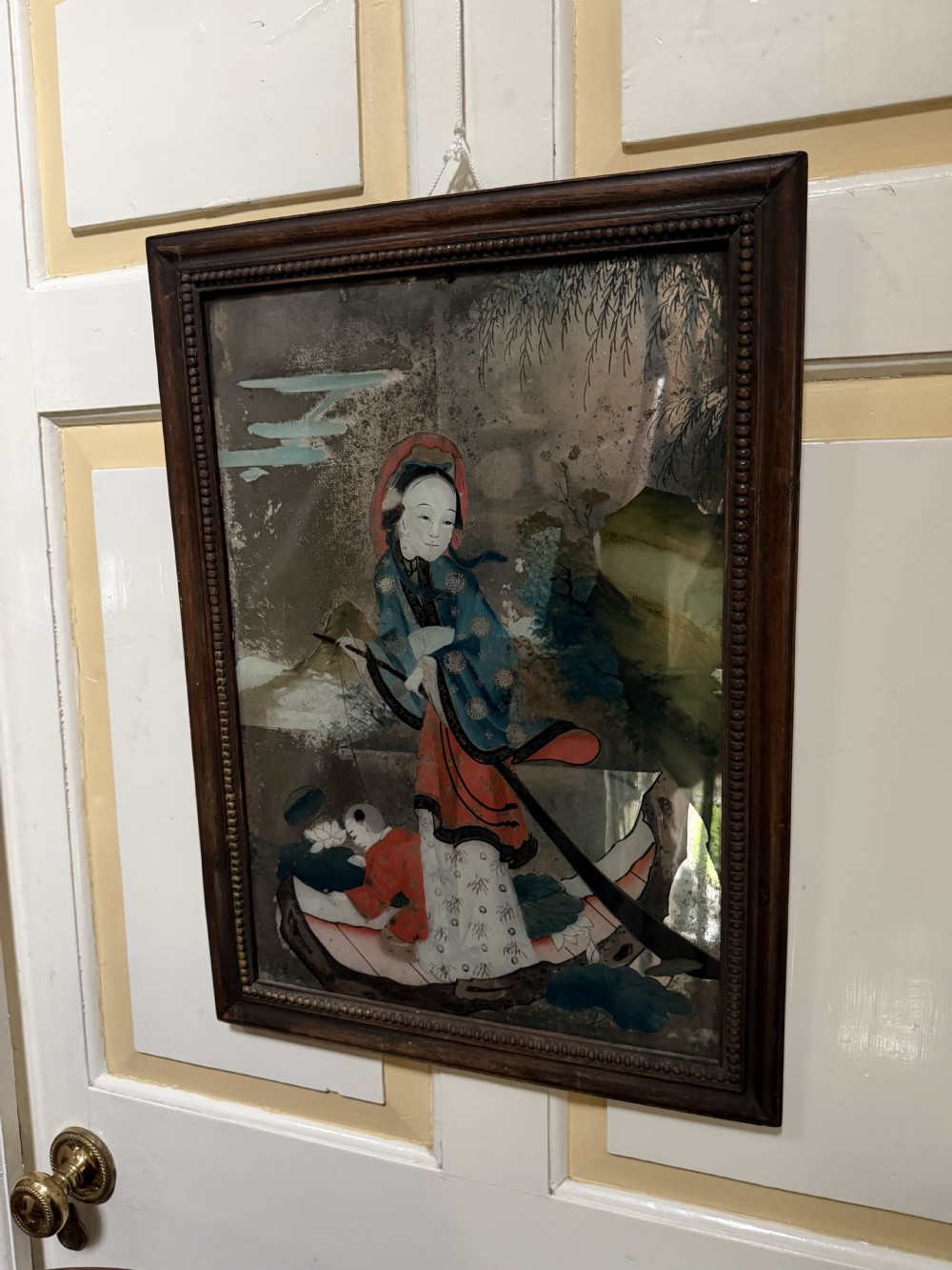 Depicting a female figure , probably a deity , in a boat with a child or attendant with a landscape behind. The silvered mirror plate with some atmospheric degradation and wear , the painting retaining its strong colours. The rectangular painting mounted in the original carved detail hardwood frame.