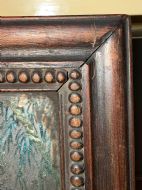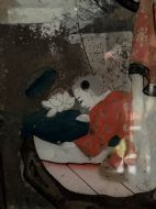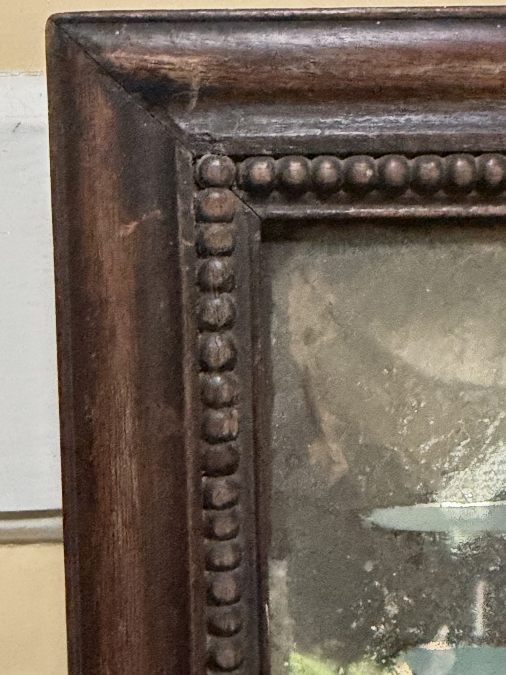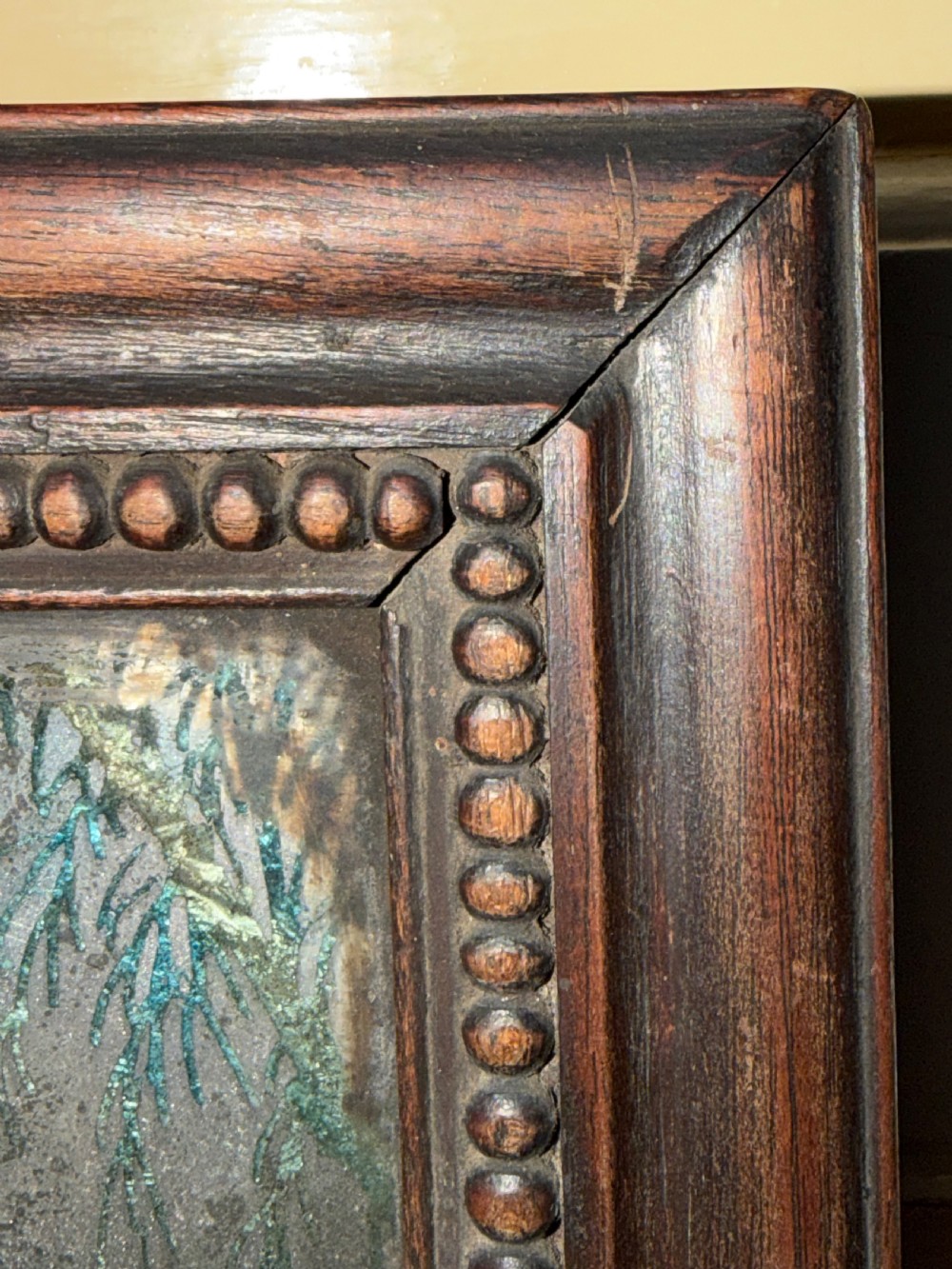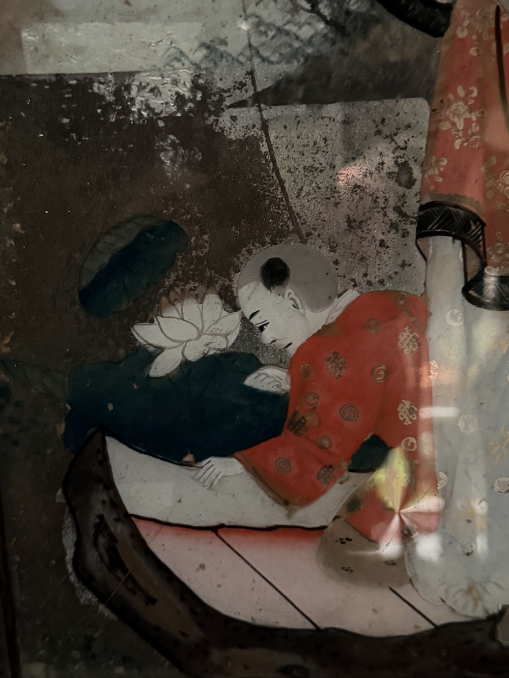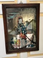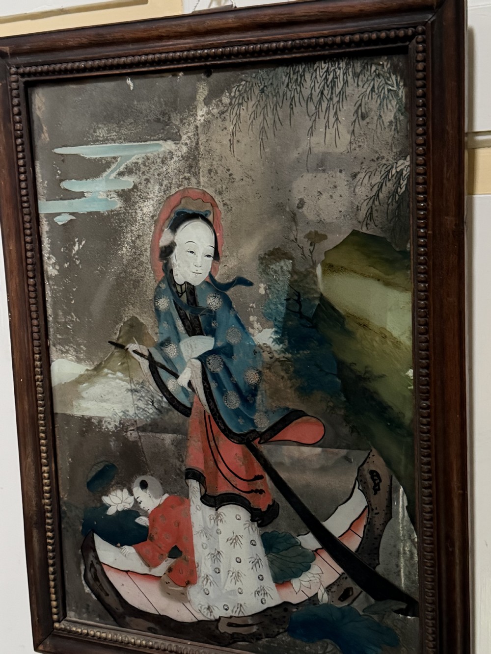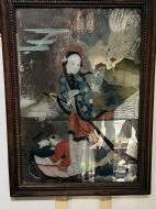 Depicting a female figure , probably a deity , in a boat with a child or attendant with a landscape behind. The silvered mirror plate with some atmospheric degradation and wear , the painting retaining its strong colours. The rectangular painting mounted in the original carved detail hardwood frame.