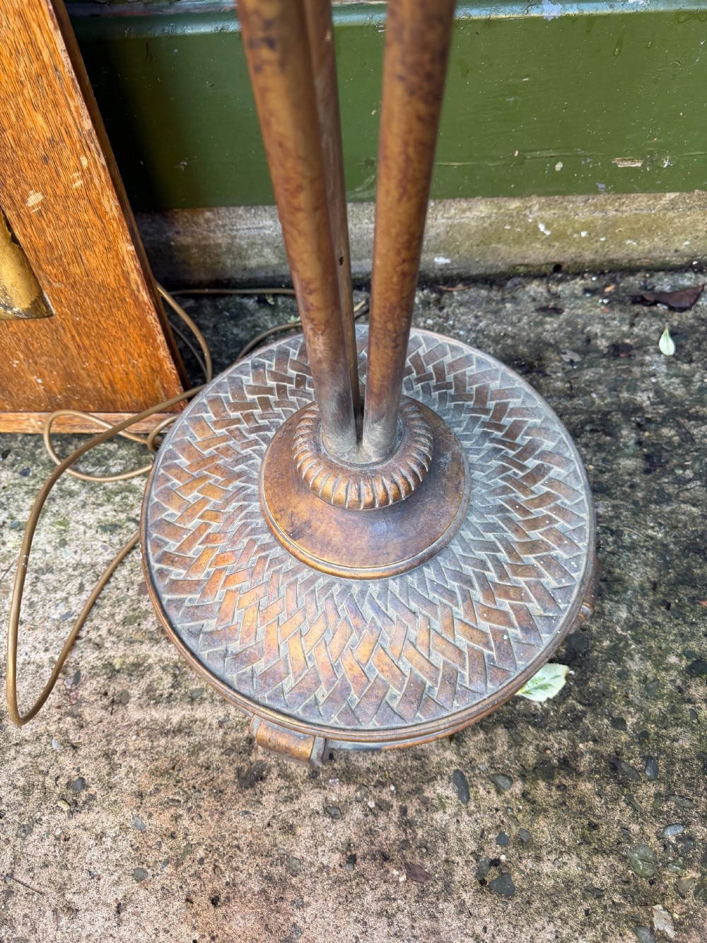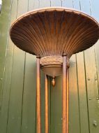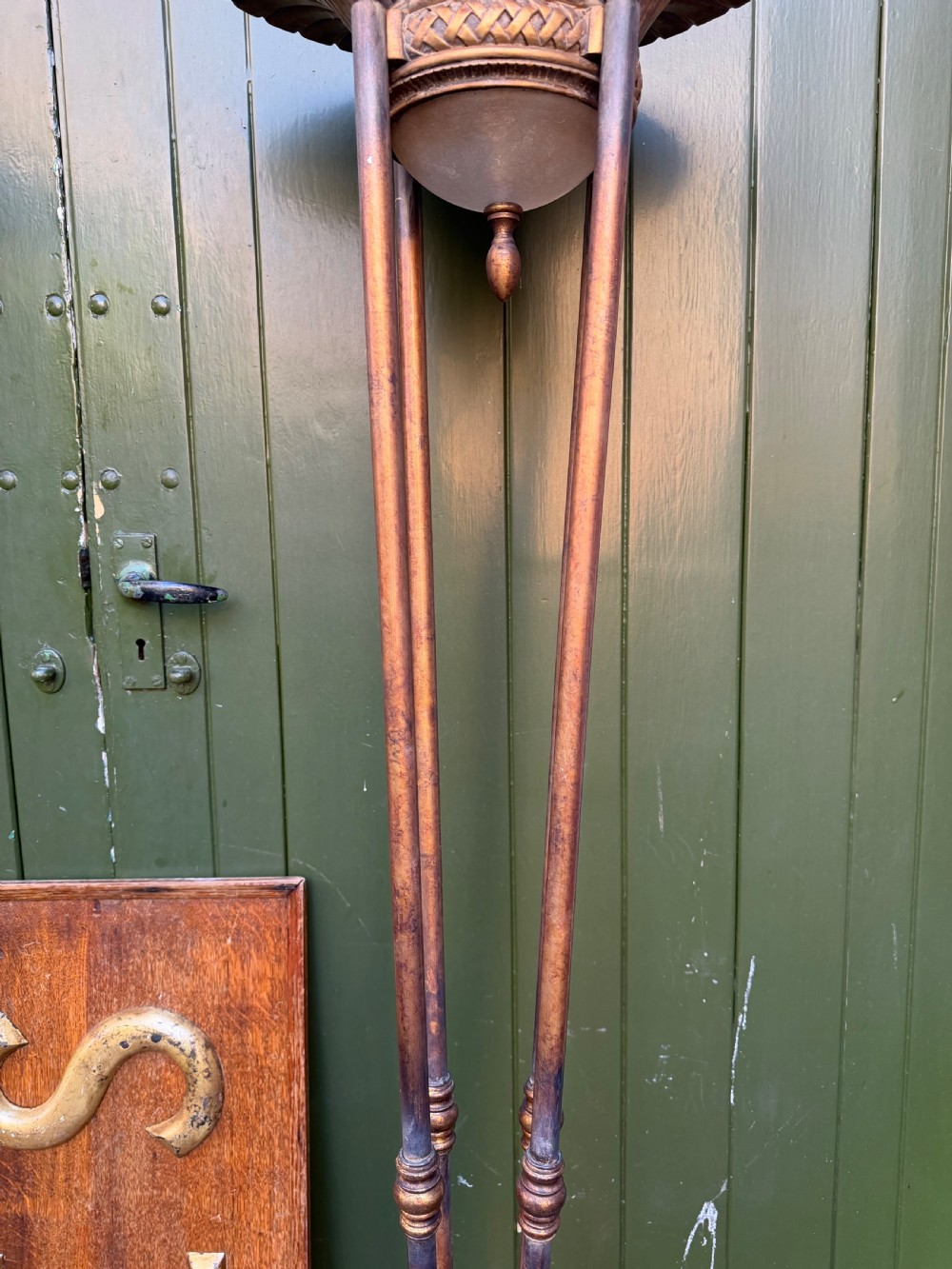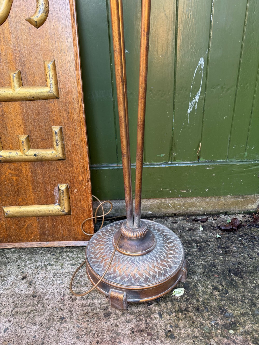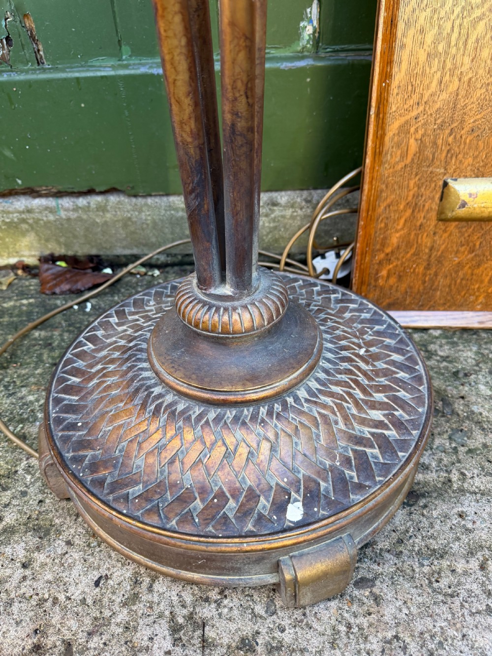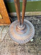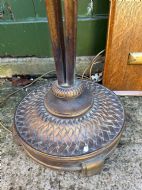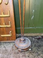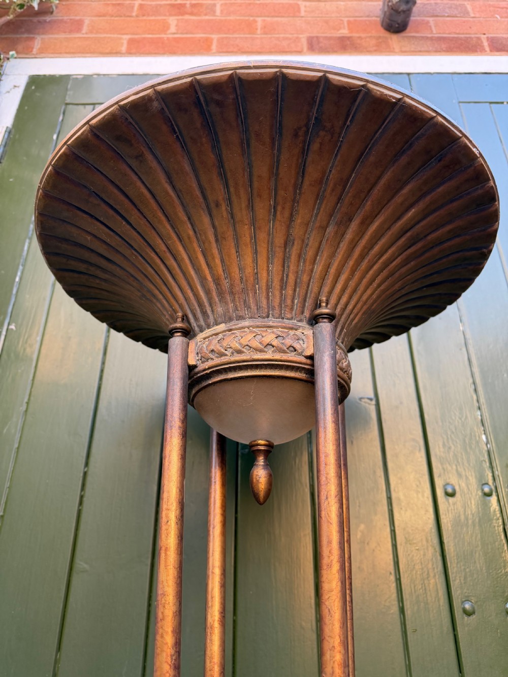 Dramatic tall pair of gilded brass and gilt composition uplighters , raised on quadruple patinated brass column supports of classical ‘Athenienne’ inspiration. The circular flared tops with moulded decoration and frosted glass bases . The circular bases with similar decoration and being weighted to provide stability.