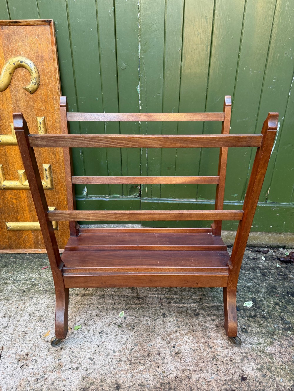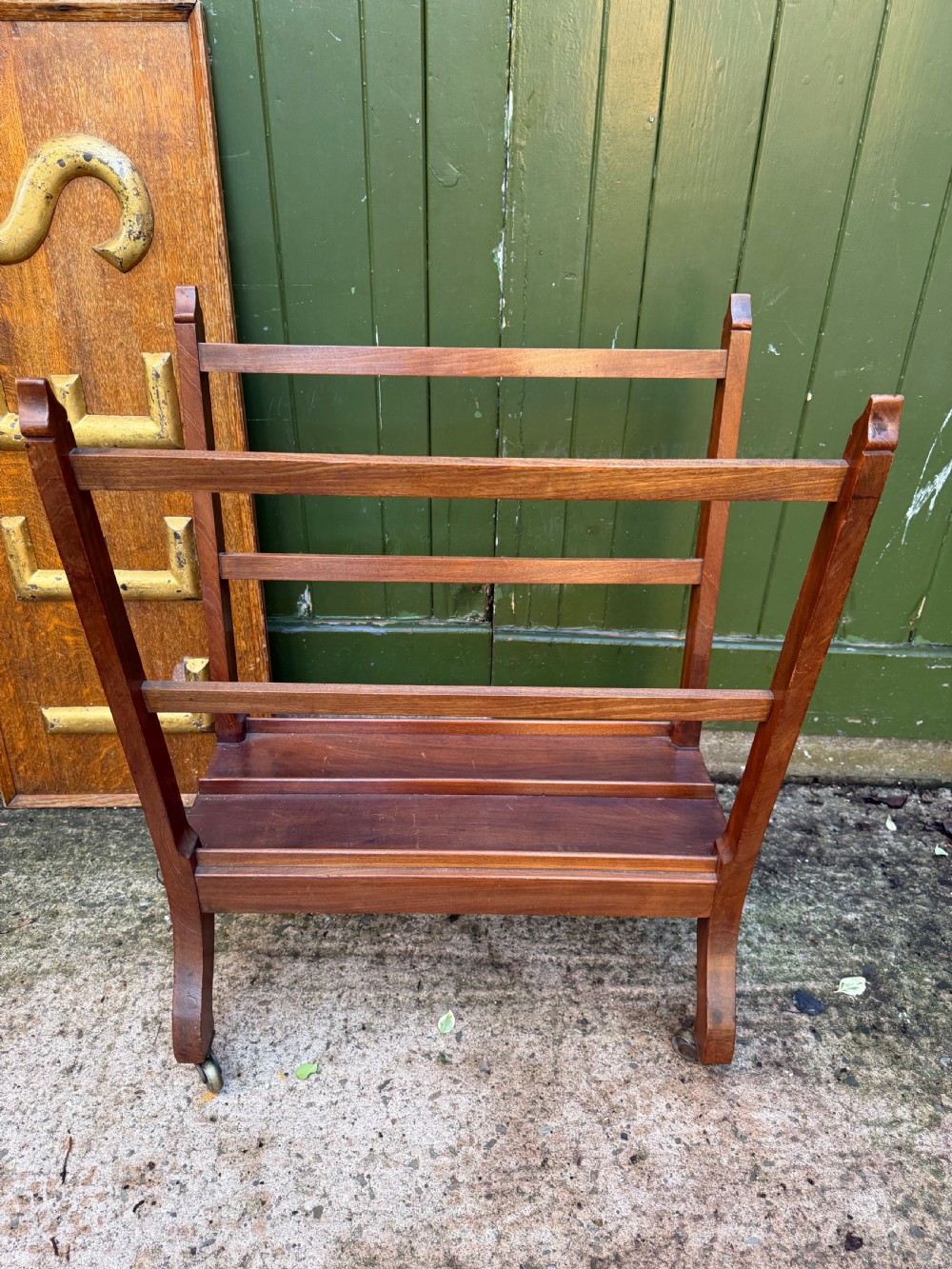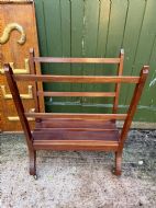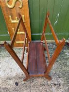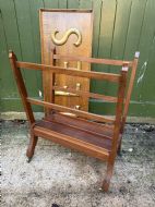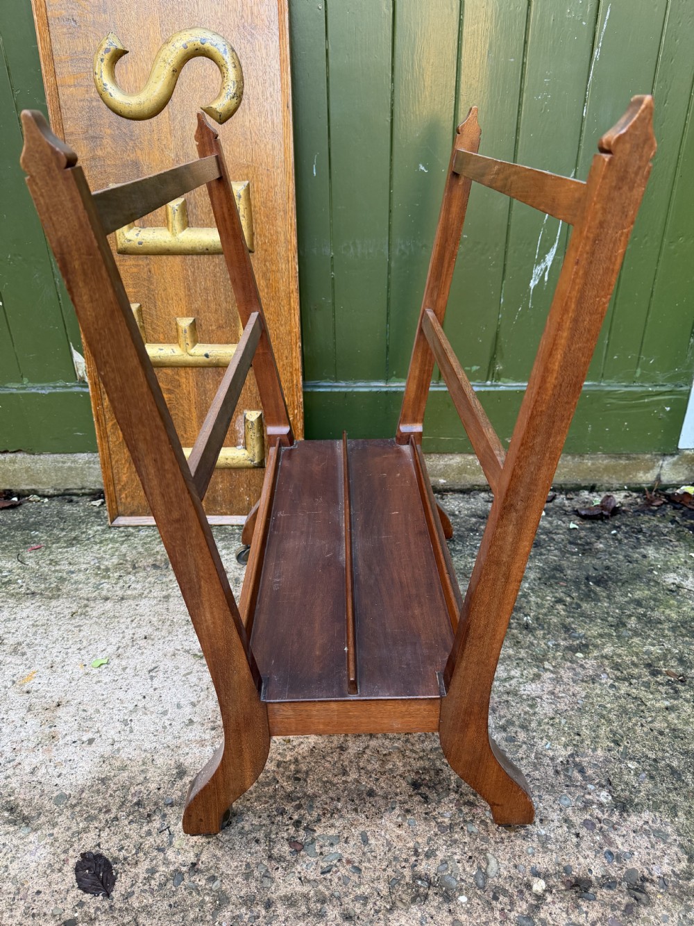 Mahogany framed folio stand of restrained design, the uprights with shaped carved tops, having a square section frame with lateral slats. The centre of the base divided into two sections by a low raised moulding .