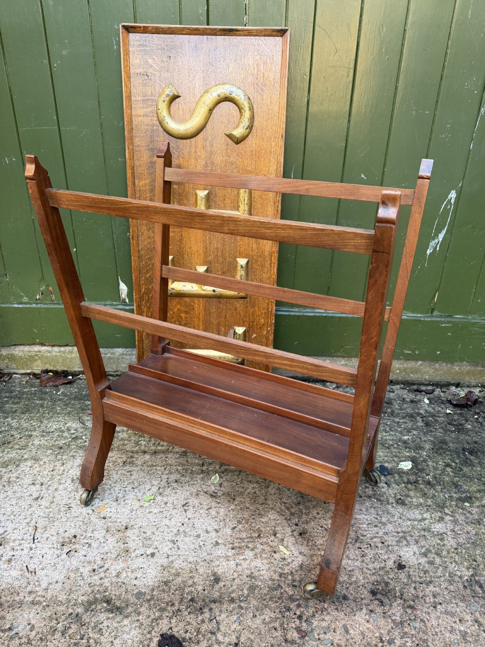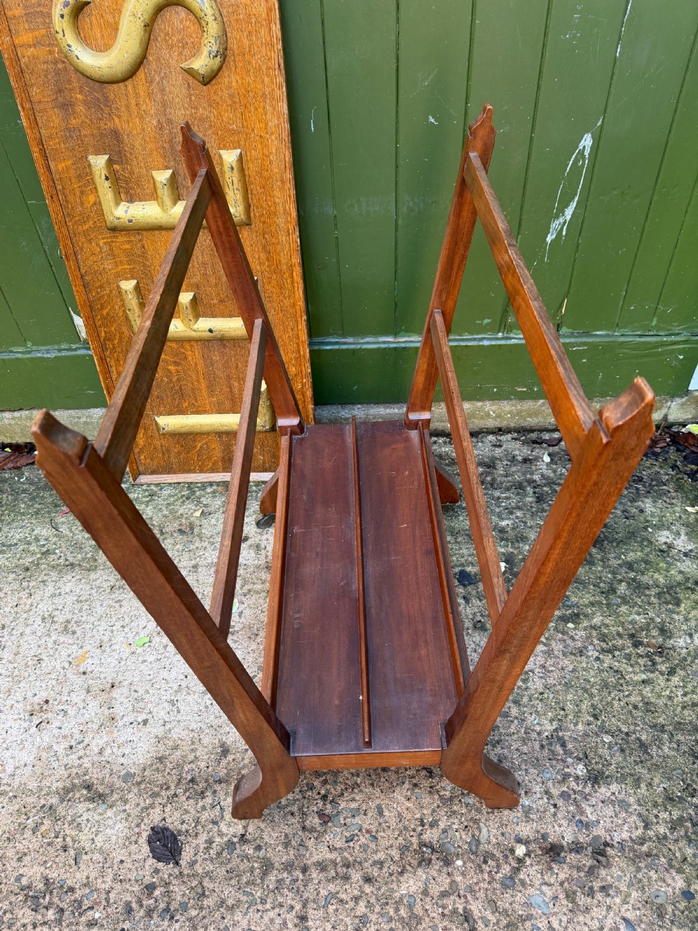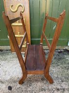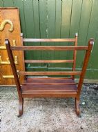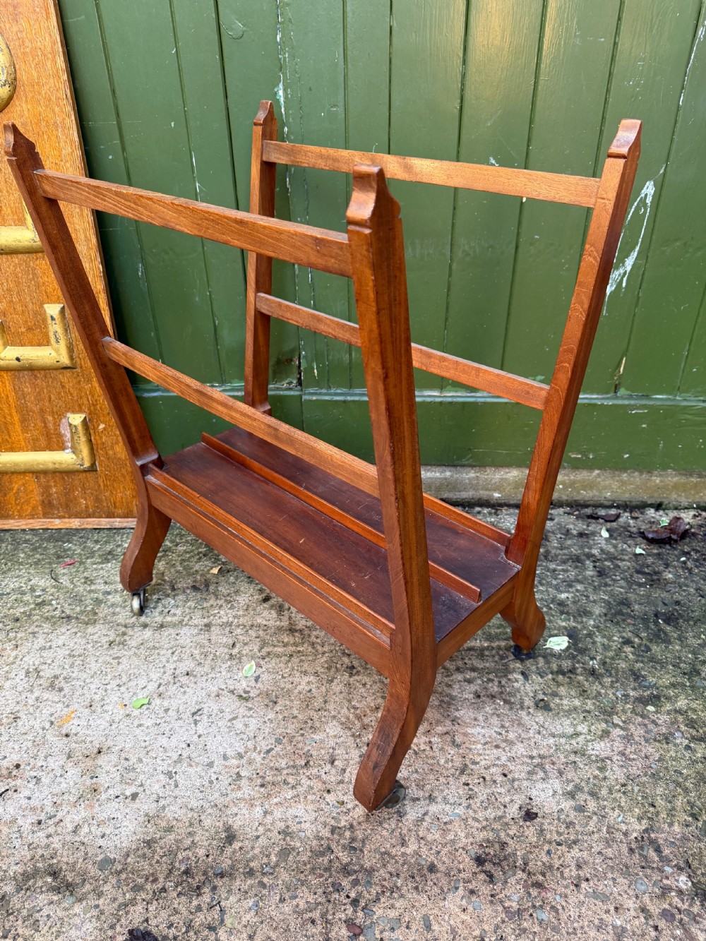 Mahogany framed folio stand of restrained design, the uprights with shaped carved tops, having a square section frame with lateral slats. The centre of the base divided into two sections by a low raised moulding .