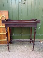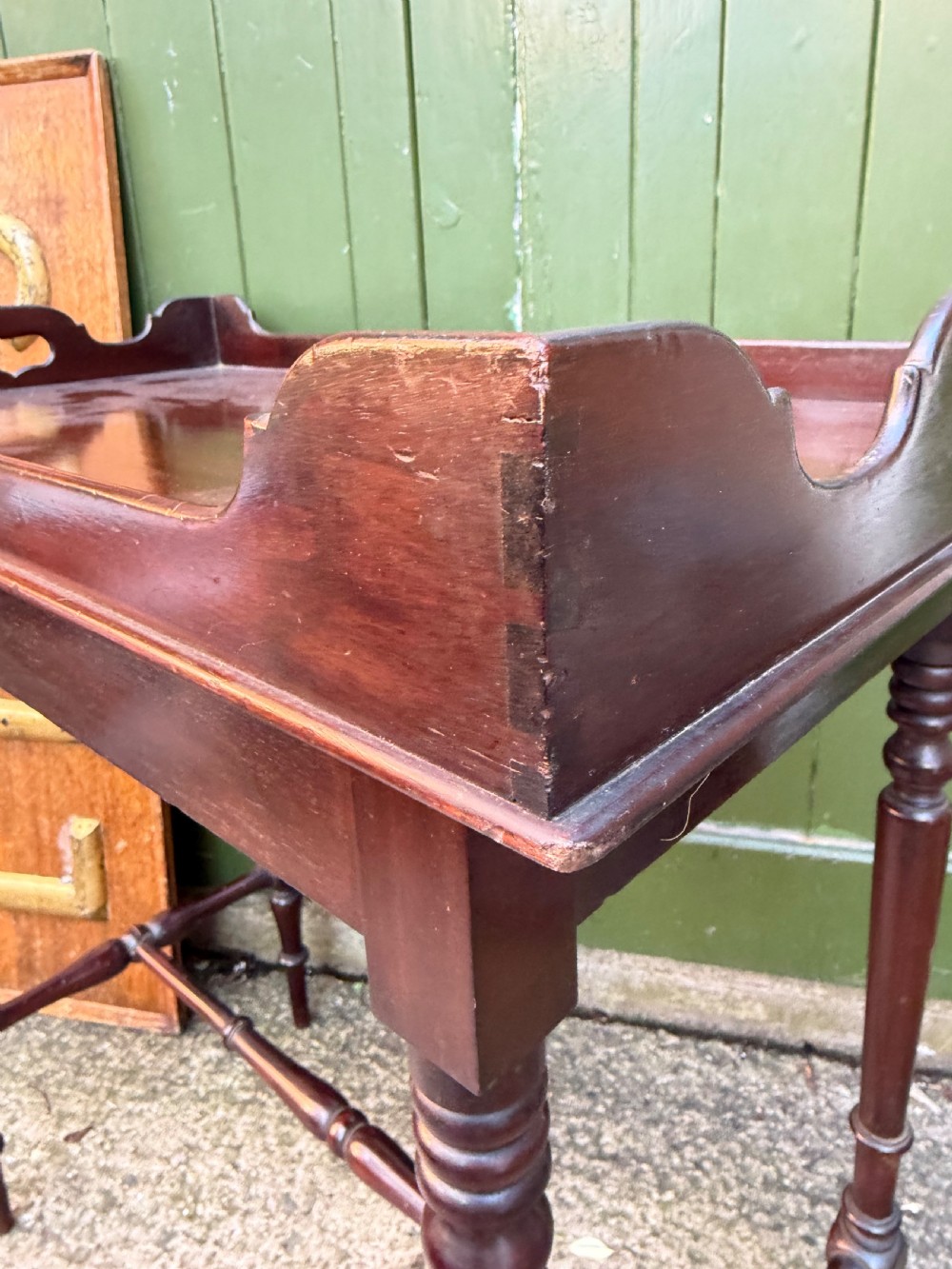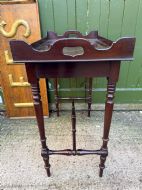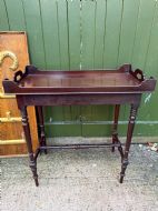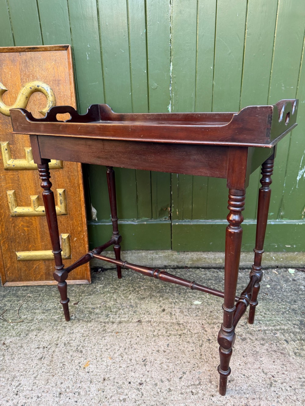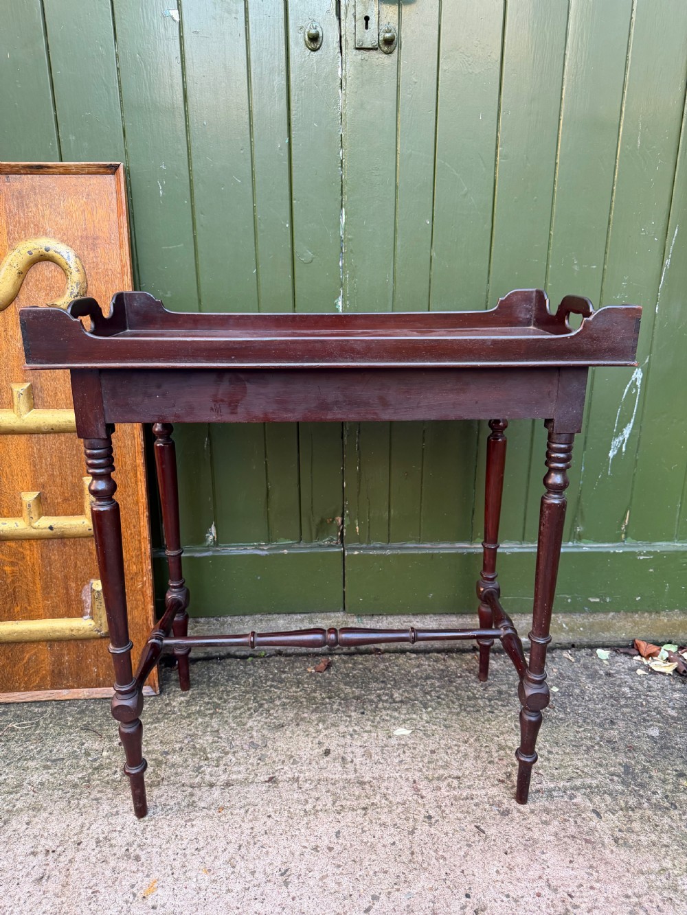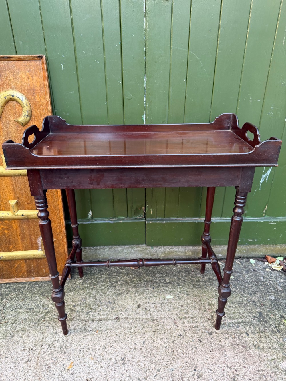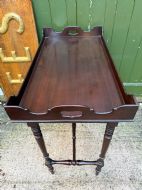 Smart quality mahogany Georgian style ‘butler’s’ tray on a turned mahogany base . The lift-off tray having raised gallery sides , shaped corners, and with integral carved carrying handles to the ends . The base with elegant turned supports and joined by a stretcher.