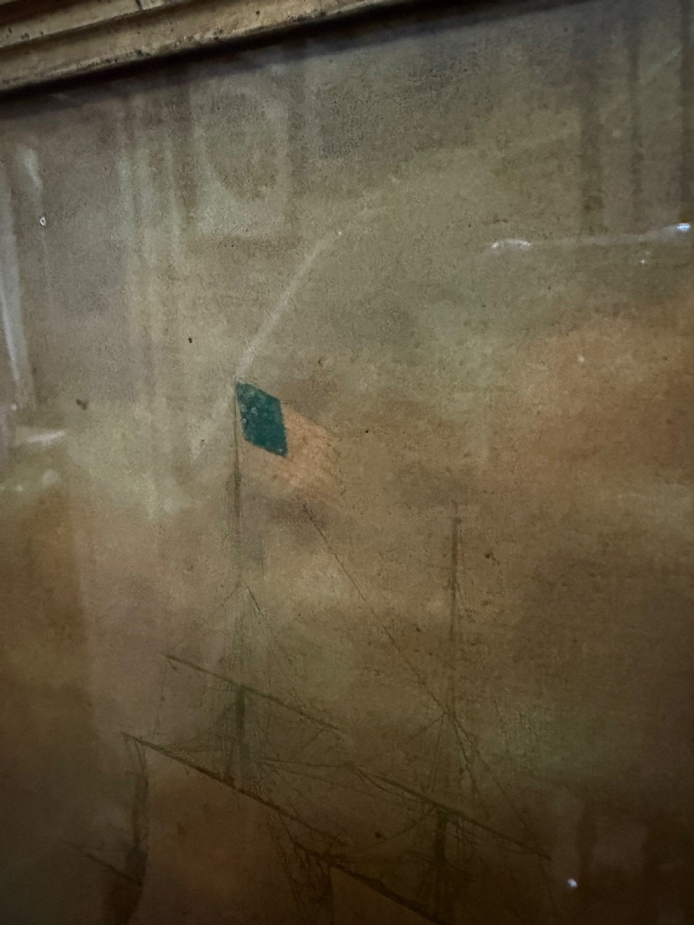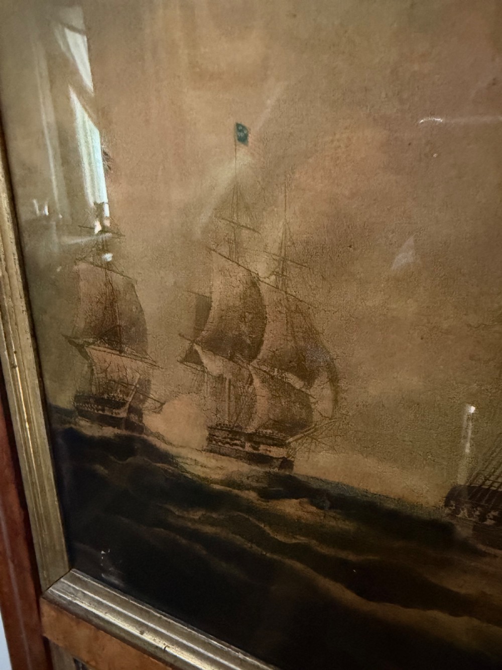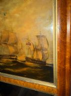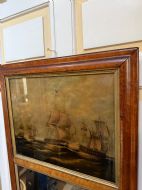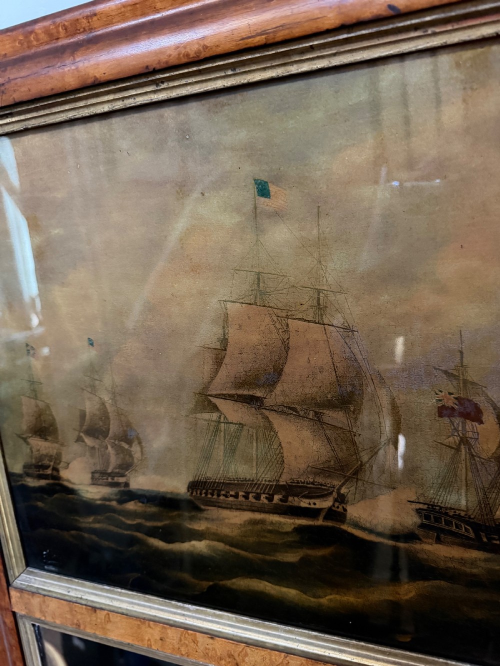The silvered mirror plate within the figured burr maple moulded-profile frame surrounded by gilt slips . The top panel with a reverse glass print depicting naval ‘Men o’ War’ ships in full sail ,engaged in battle, flying the ‘The Stars and Stripes’ flag and the British Ensign respectively.