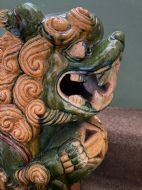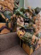 Highly decorative pair of glazed pottery Foo Dogs which could be utilised in either an interior or exterior scheme to add an exotic Oriental element .