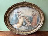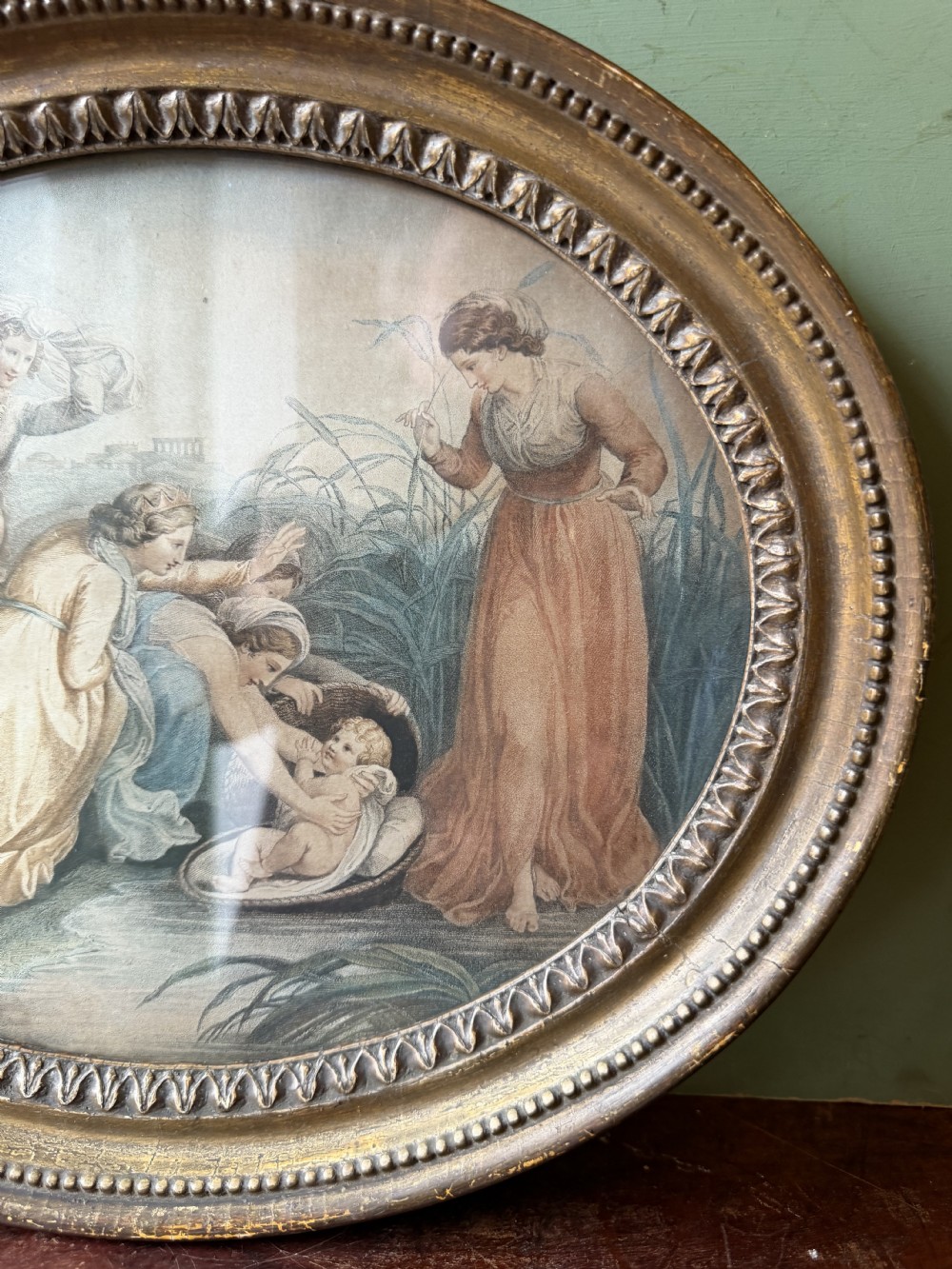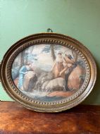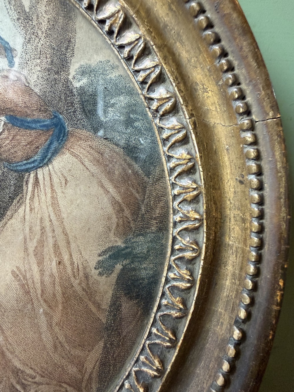 Decorative pair of classical style coloured engravings in their original carved gilt-wood glazed oval frames . The top edge of the frames fitted with original brass hanging rings .