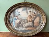 Pair of early C19th oval gilt-wood framed coloured engravings in the manner of Francesco Bartolozzi .