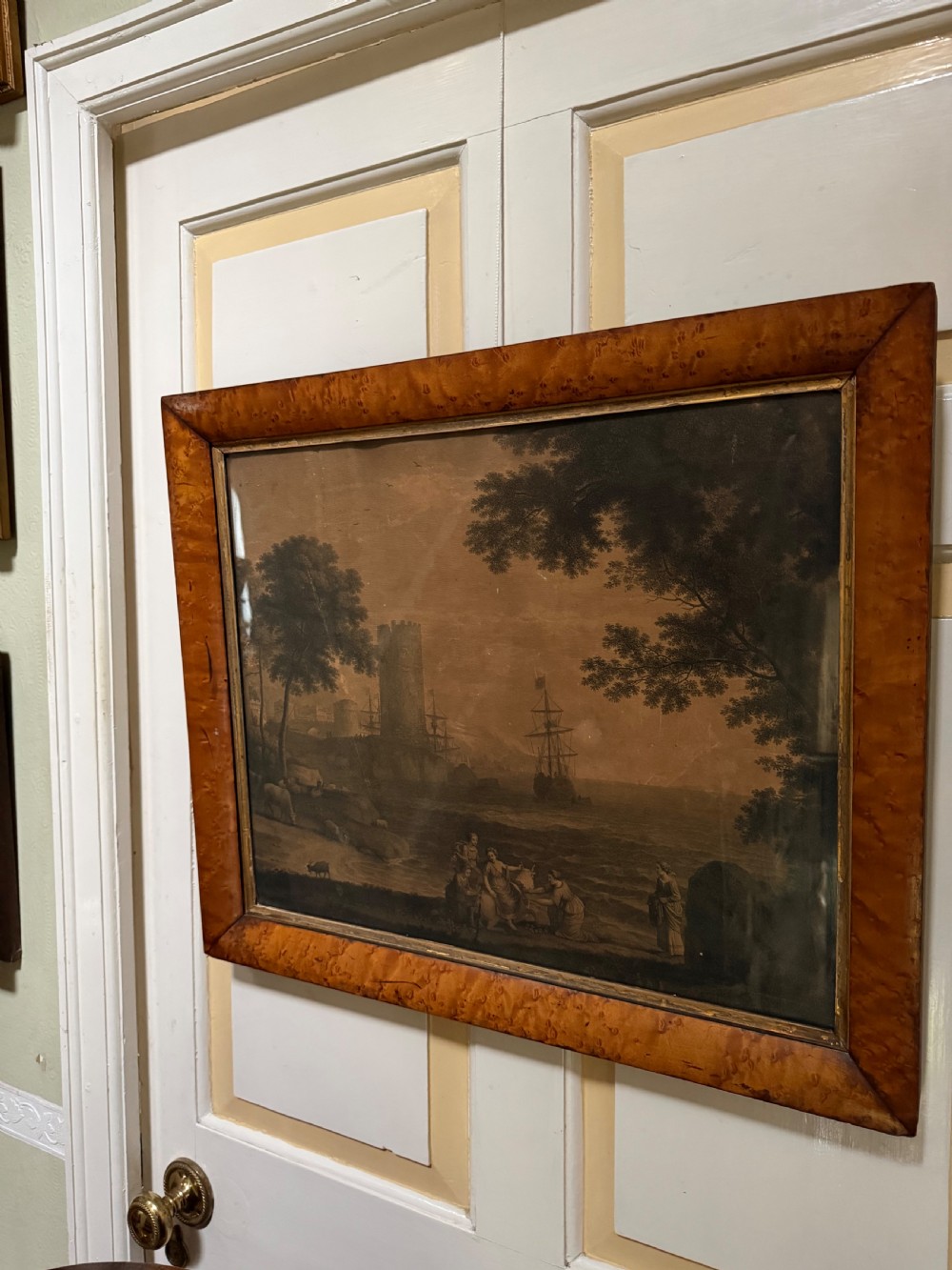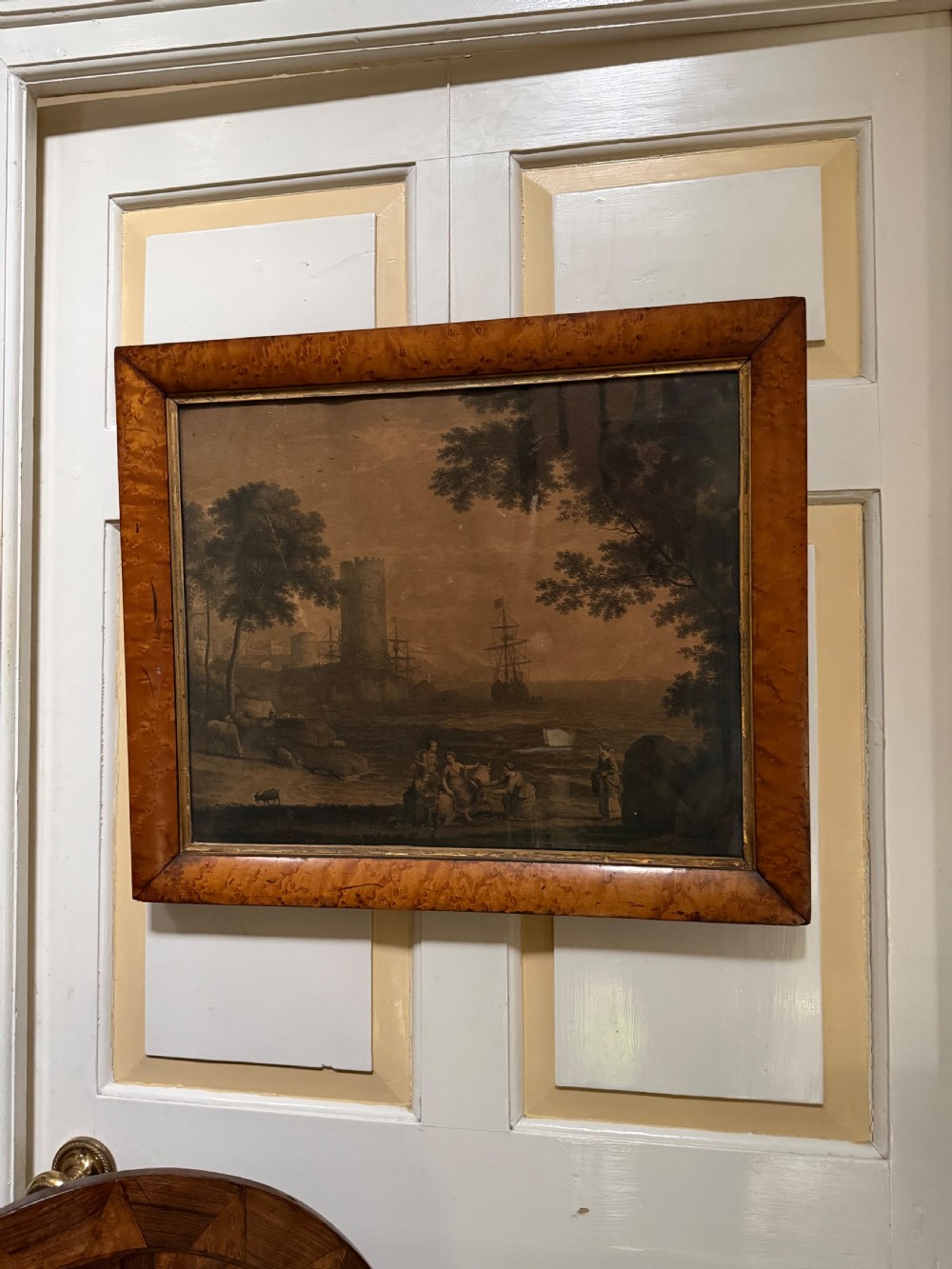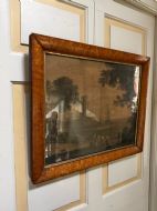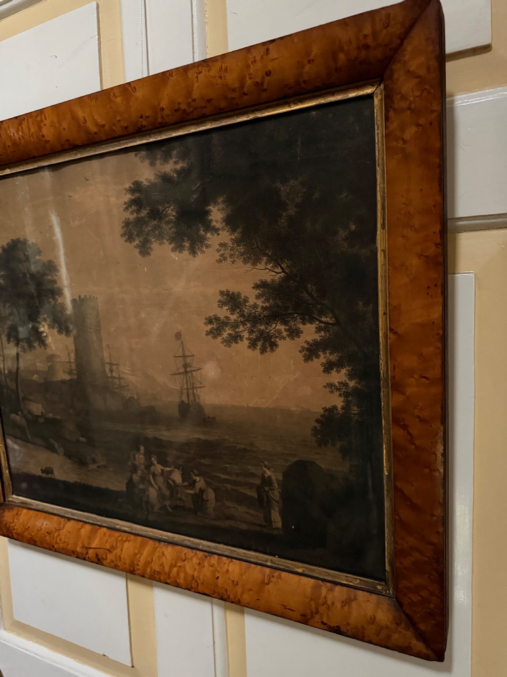 Early C19th classical engraving after Claude Lorrain “Coast view with the Abduction of Europa “ in original glazed burr maple frame .