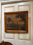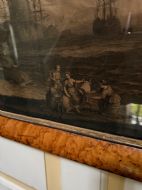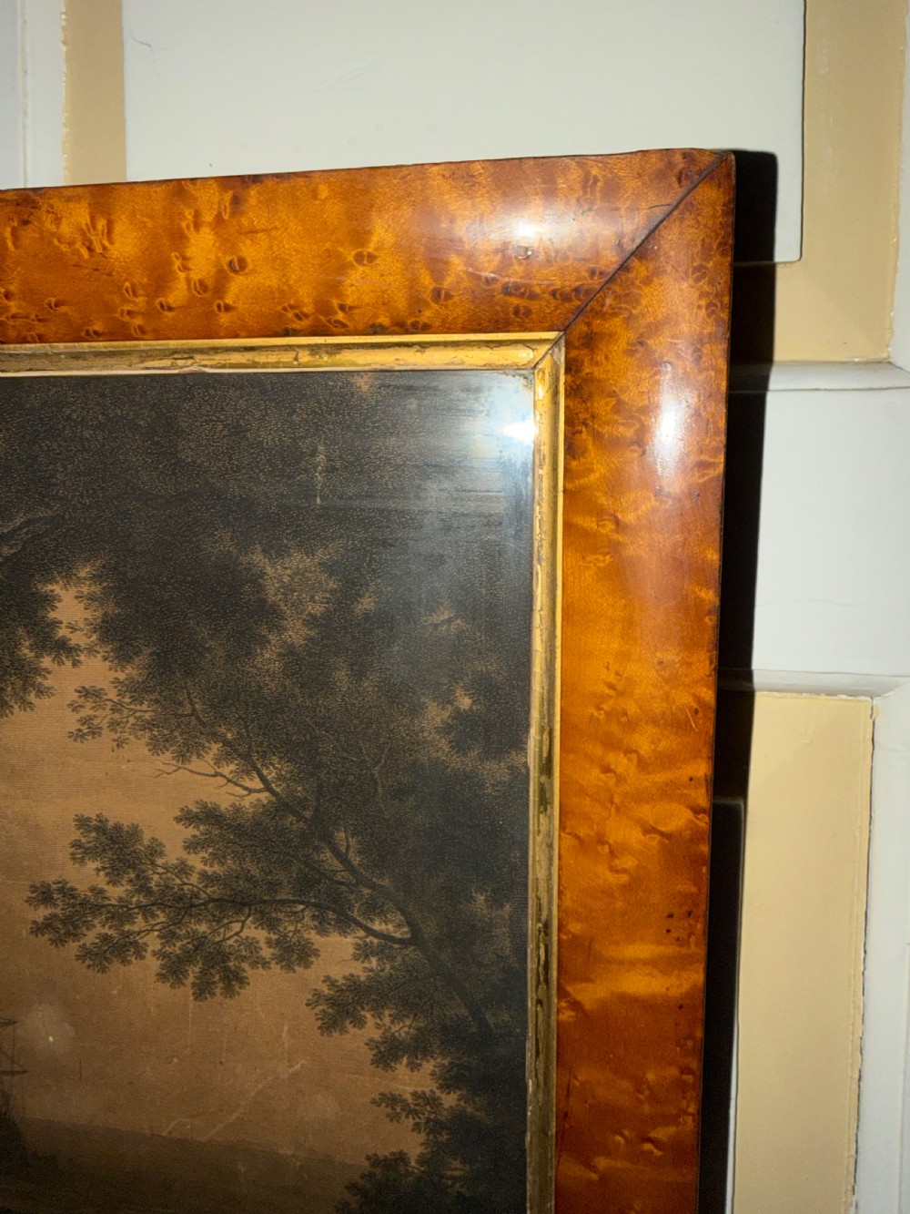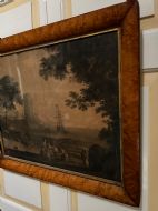 Early C19th classical engraving after Claude Lorraine “Coast view with the Abduction of Europa” in original glazed burr maple frame .