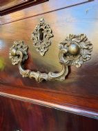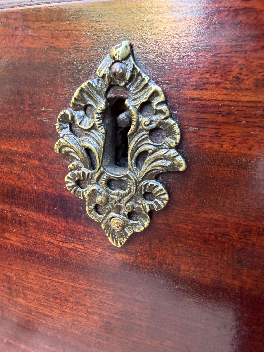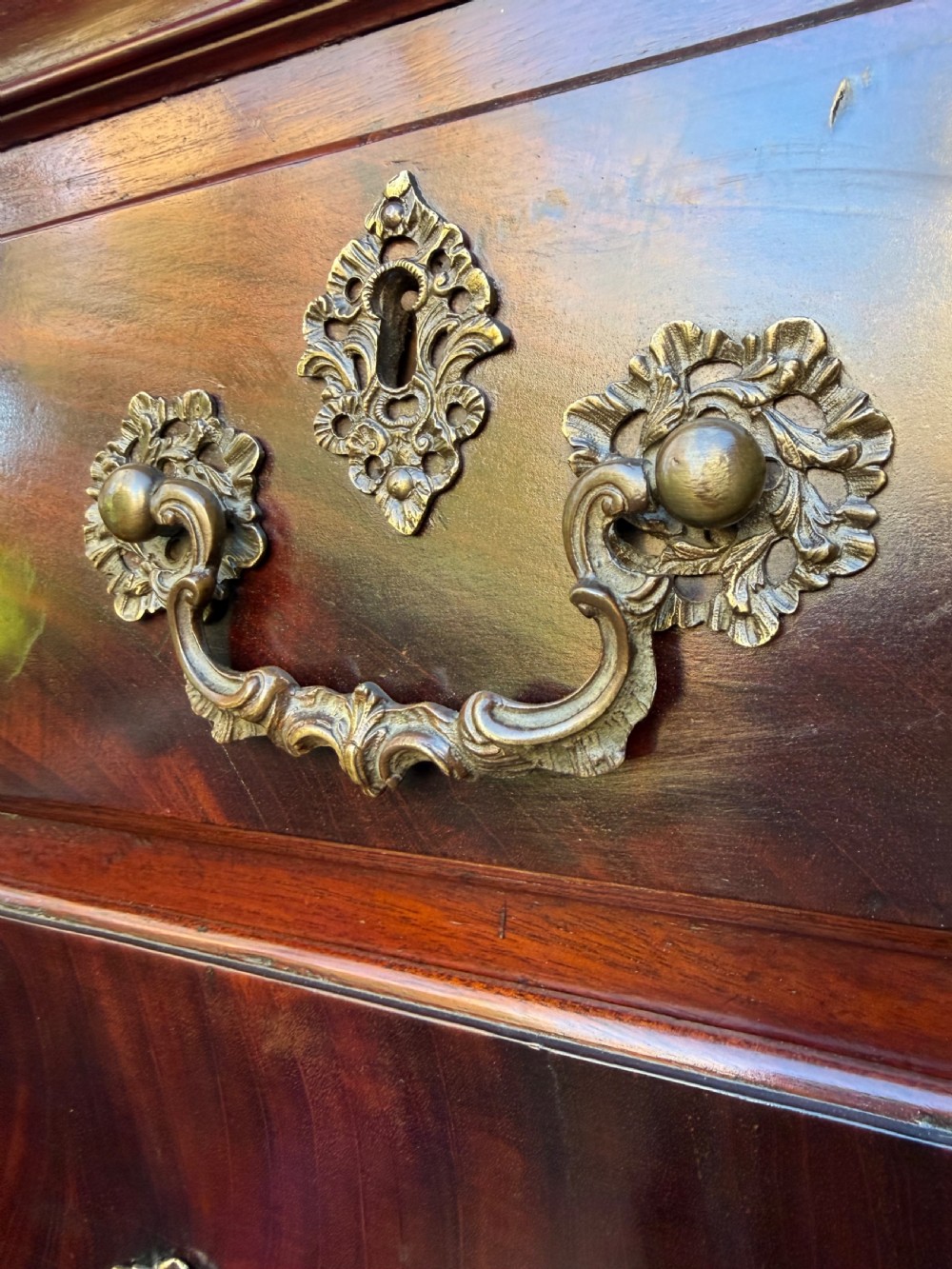 Raised on bold ogee bracket feet, the base section fitted with 3 long graduated depth drawers . The upper section fitted with 3 short drawers across the top with 3 graduated depth long drawers below. The oak-lined drawers all fitted with cast brass rococo design handles and key escutcheons, retaining the original brass locks ( no key ) .