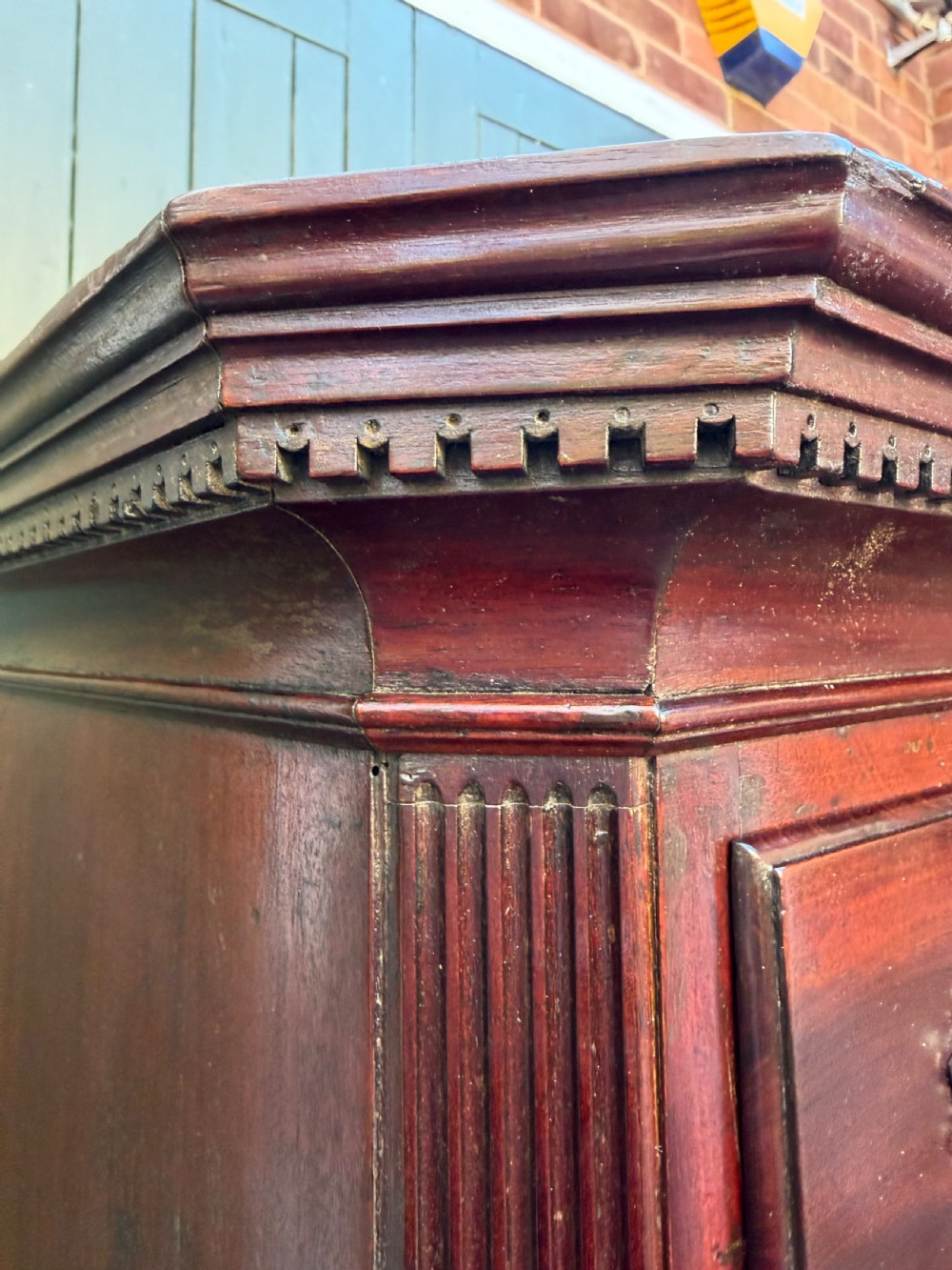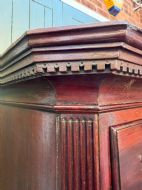 The flat boarded top above a projecting moulded cornice with carved dentil detail and having canted corners with reeded uprights.