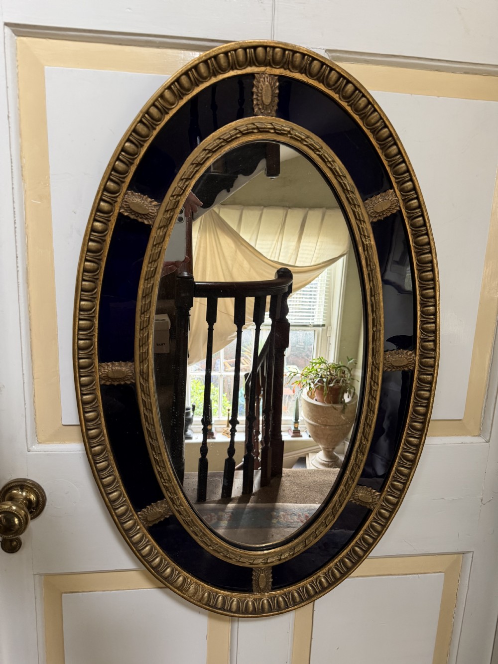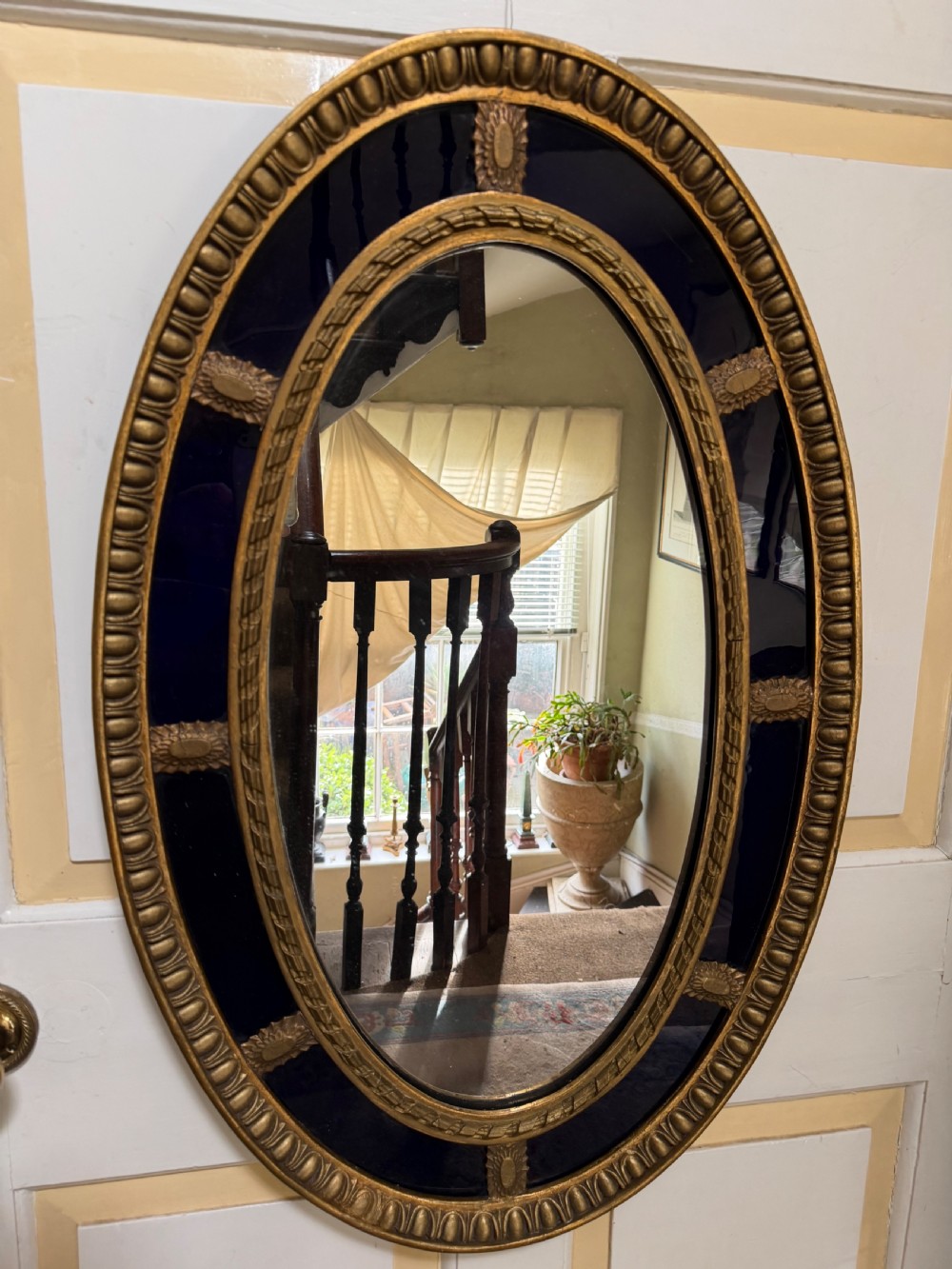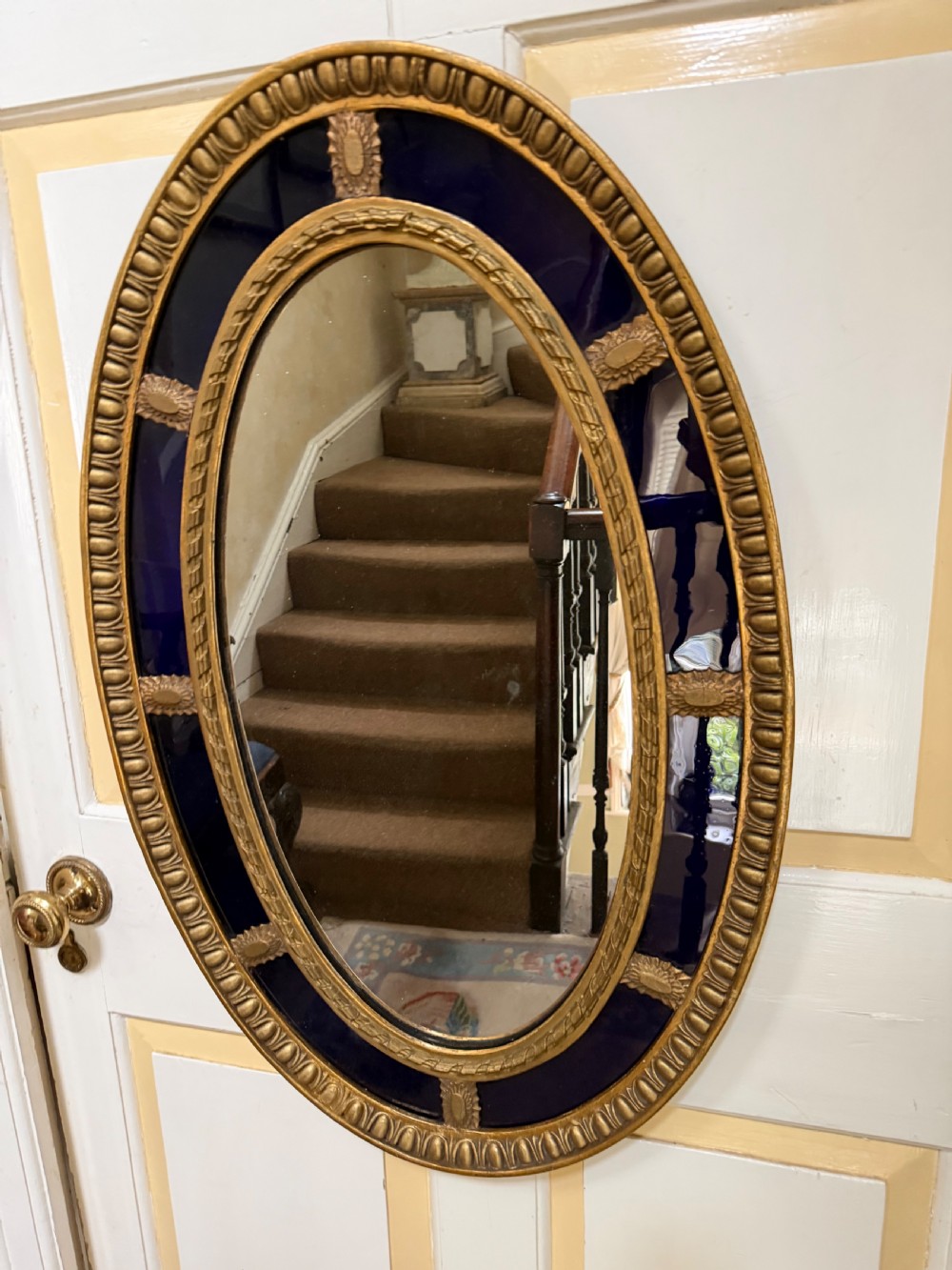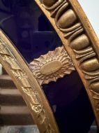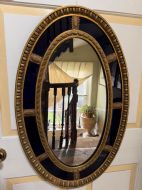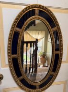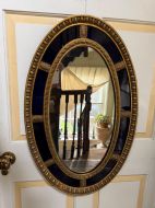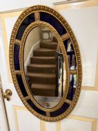 A smart gilded oval mirror with deep colbalt blue glass panels in the manner of Robert Adam . The ovolo or ‘egg and dart’ edge with ovoid paterae dividing the blue border surround , the mirror plate with a carved giltwood framed moulding.