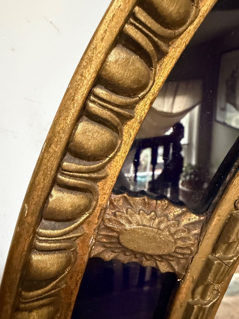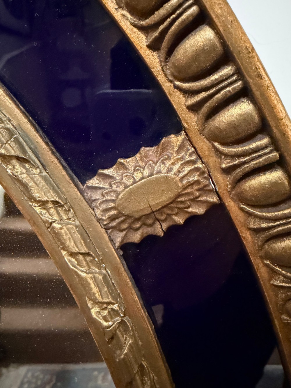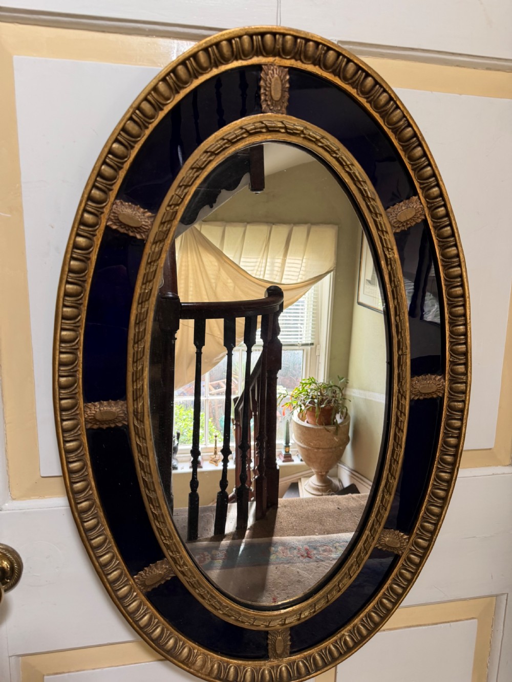 A smart gilded oval mirror with deep colbalt blue glass panels in the manner of Robert Adam . The ovolo or ‘egg and dart’ edge with ovoid paterae dividing the blue border surround , the mirror plate with a carved giltwood framed moulding.