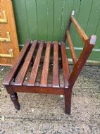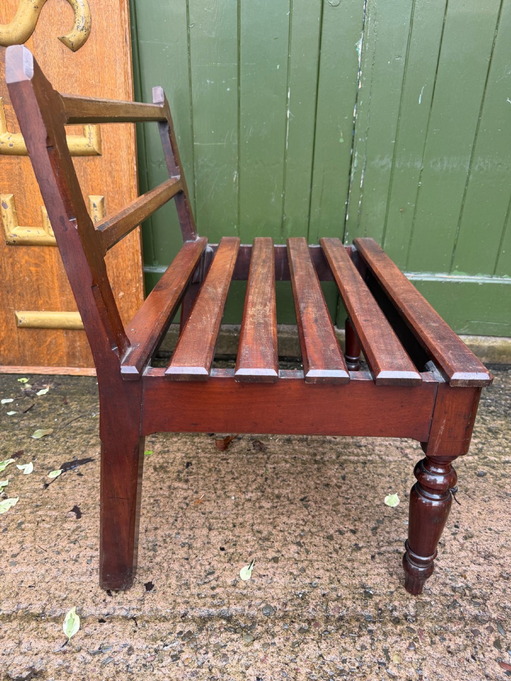 The broad rectangular platform with slatted lateral luggage supports and raised on elegantly turned forelegs . The rear raked upstand with gently chamfered edges and subtle Gothic design influenced uprights, having two chamfered edge lateral bars . The rear square-section supports with a raked angle providing good stability and strength.