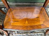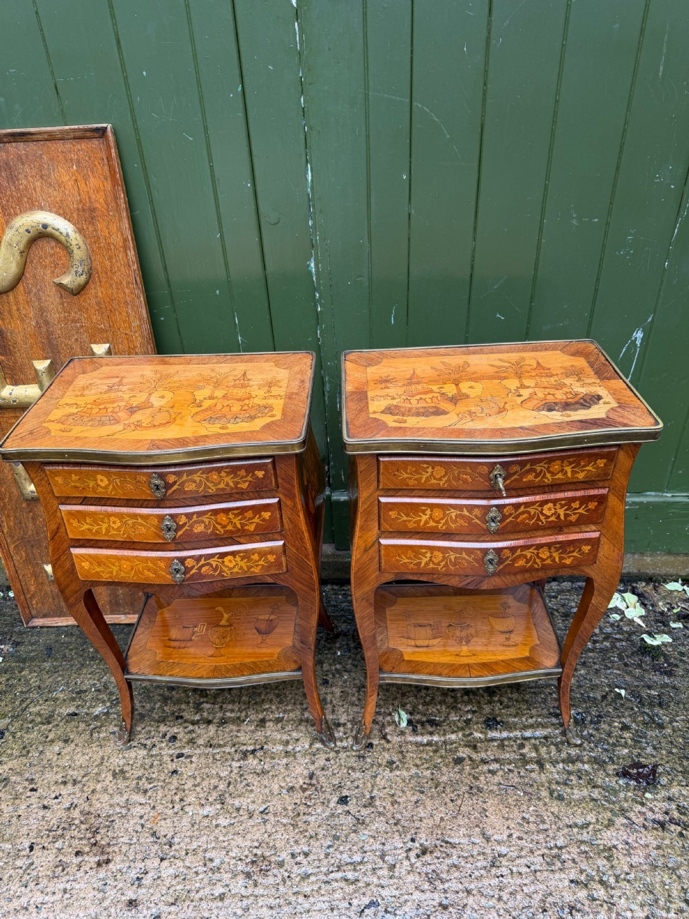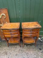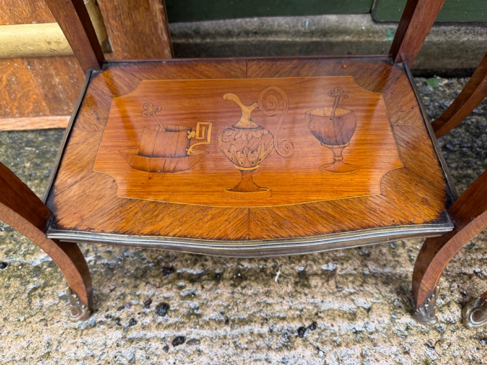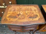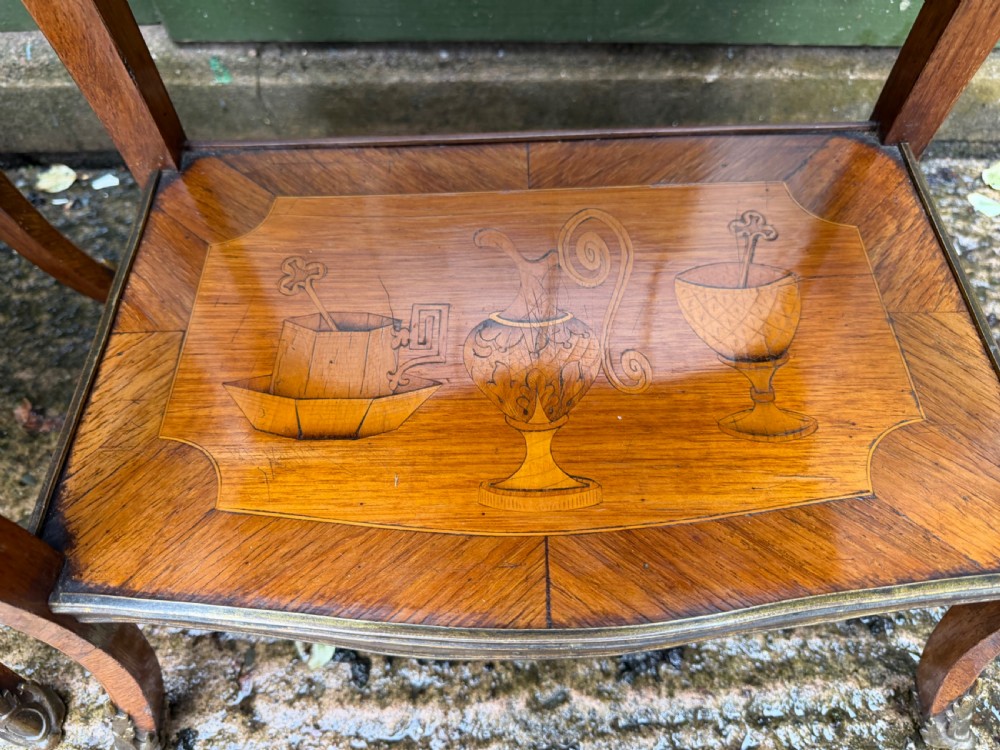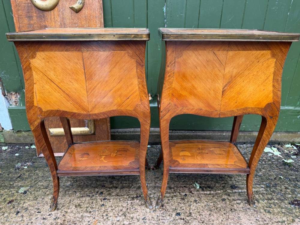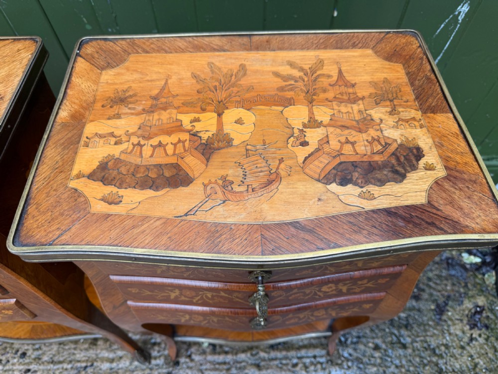 The serpentine outline tops having brass-banded edges and inlaid with Chinoiserie design marquetry panels depicting pagodas .a bridge and a Junk , in a fantastical landscape setting. The lower brass banded platforms inlaid with marquetry designs of precious objects in the manner of the celebrated French C18th ebeniste, Charles Topino .