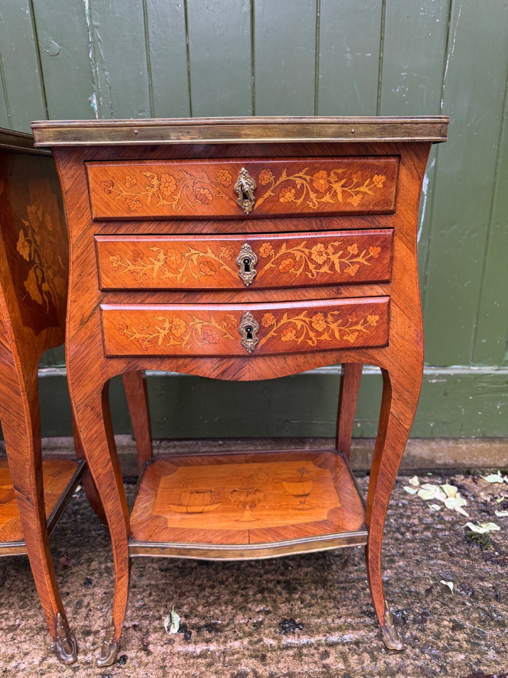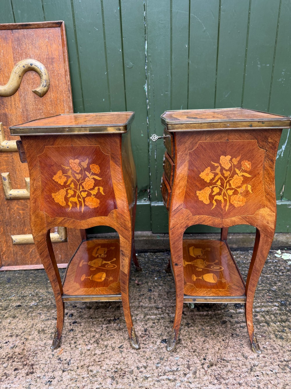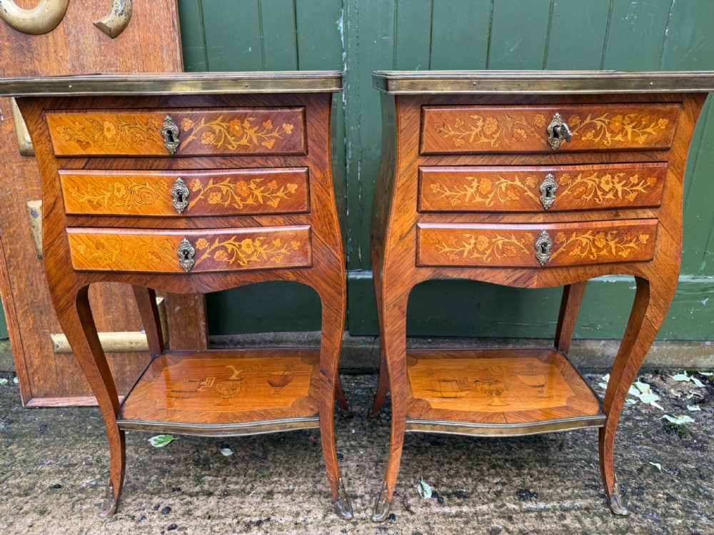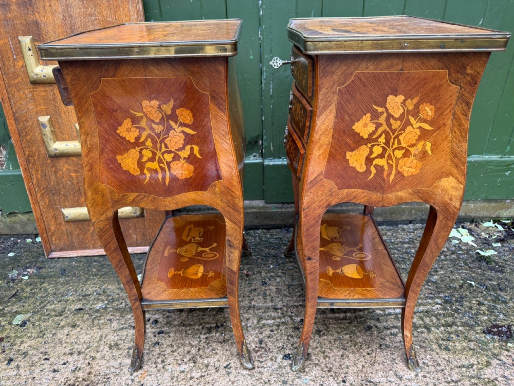 Of freestanding form , each fitted 3 floral marquetry inlaid drawers with ornate brass escutcheons, working locks and a single key . The sides with further panels of floral marquetry drawers, the versos veneered in opposing ‘chevroned’ panels . The shapely cabriole supports each fitted with brass sabots.