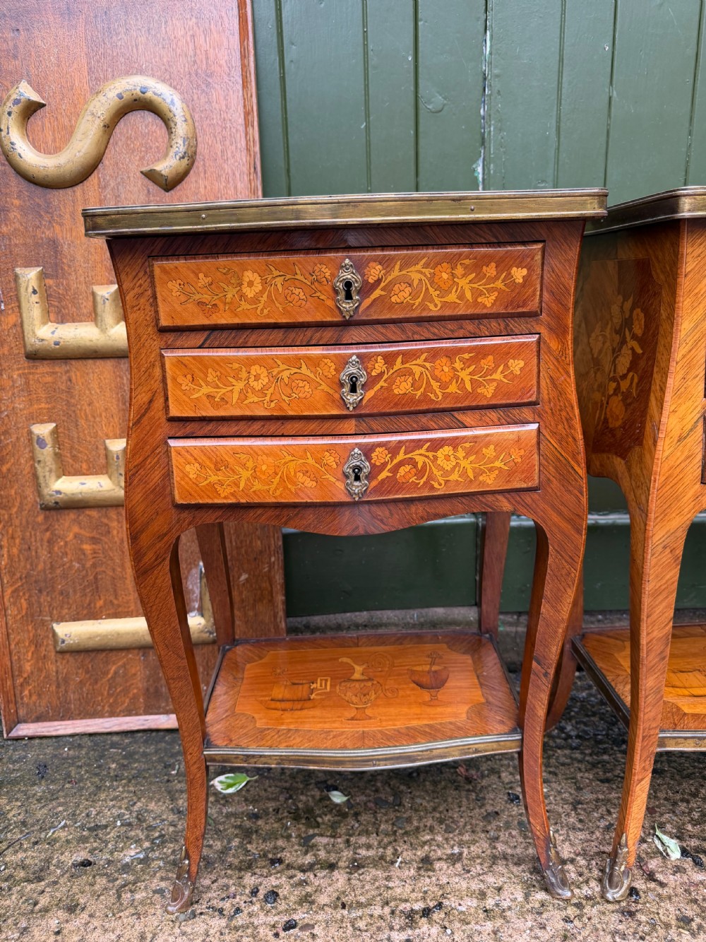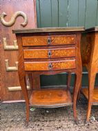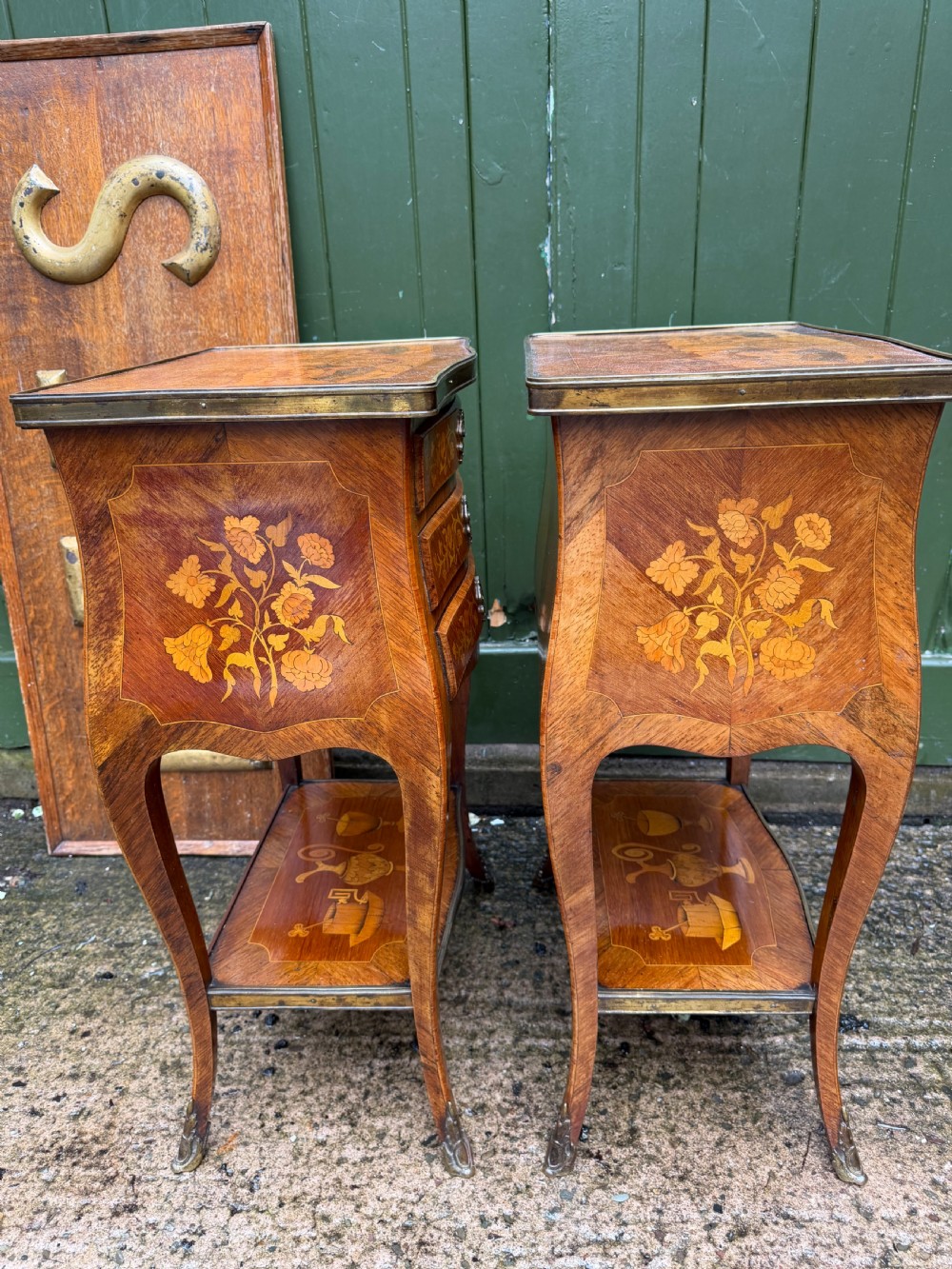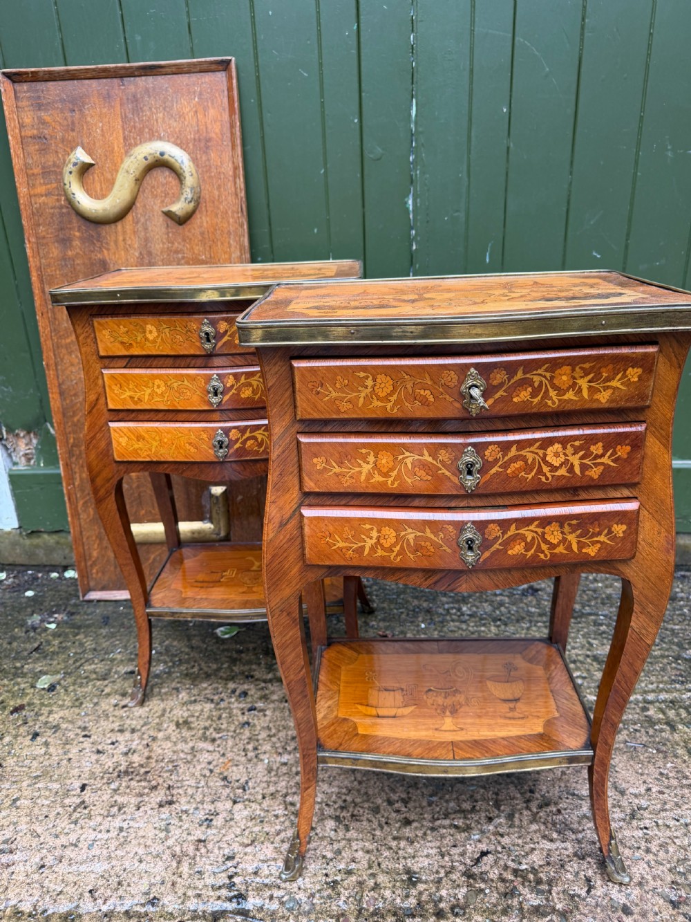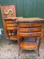 Of freestanding form , each fitted 3 floral marquetry inlaid drawers with ornate brass escutcheons, working locks and a single key . The sides with further panels of floral marquetry drawers, the versos veneered in opposing ‘chevroned’ panels . The shapely cabriole supports each fitted with brass sabots.