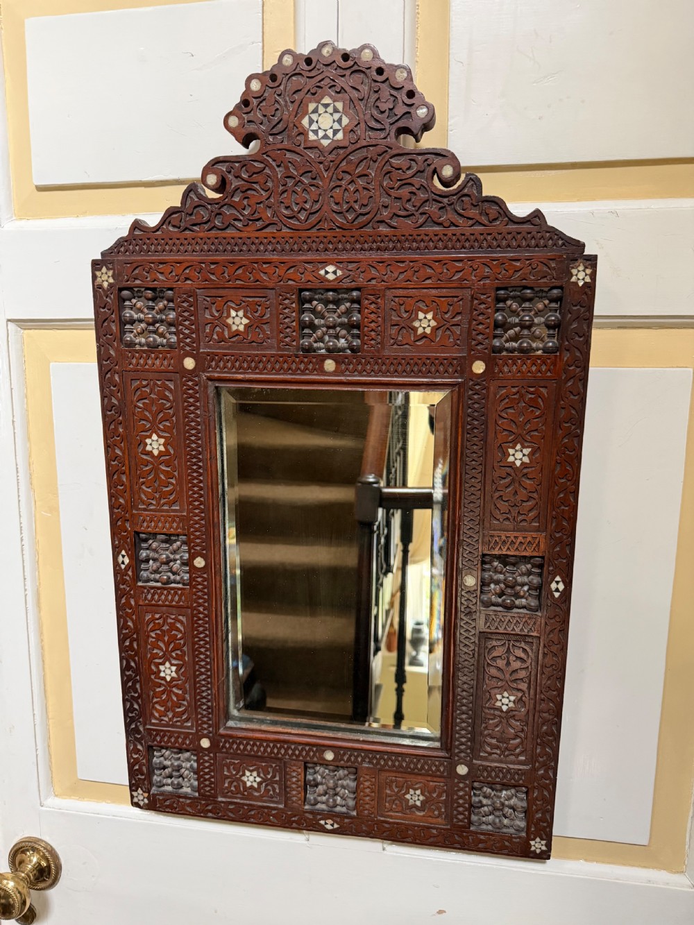 Late C19th Levantine carved frame mirror with nacre-shell inlay and mashrabiya turned panels.