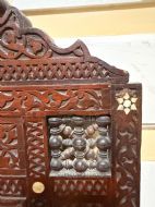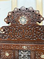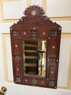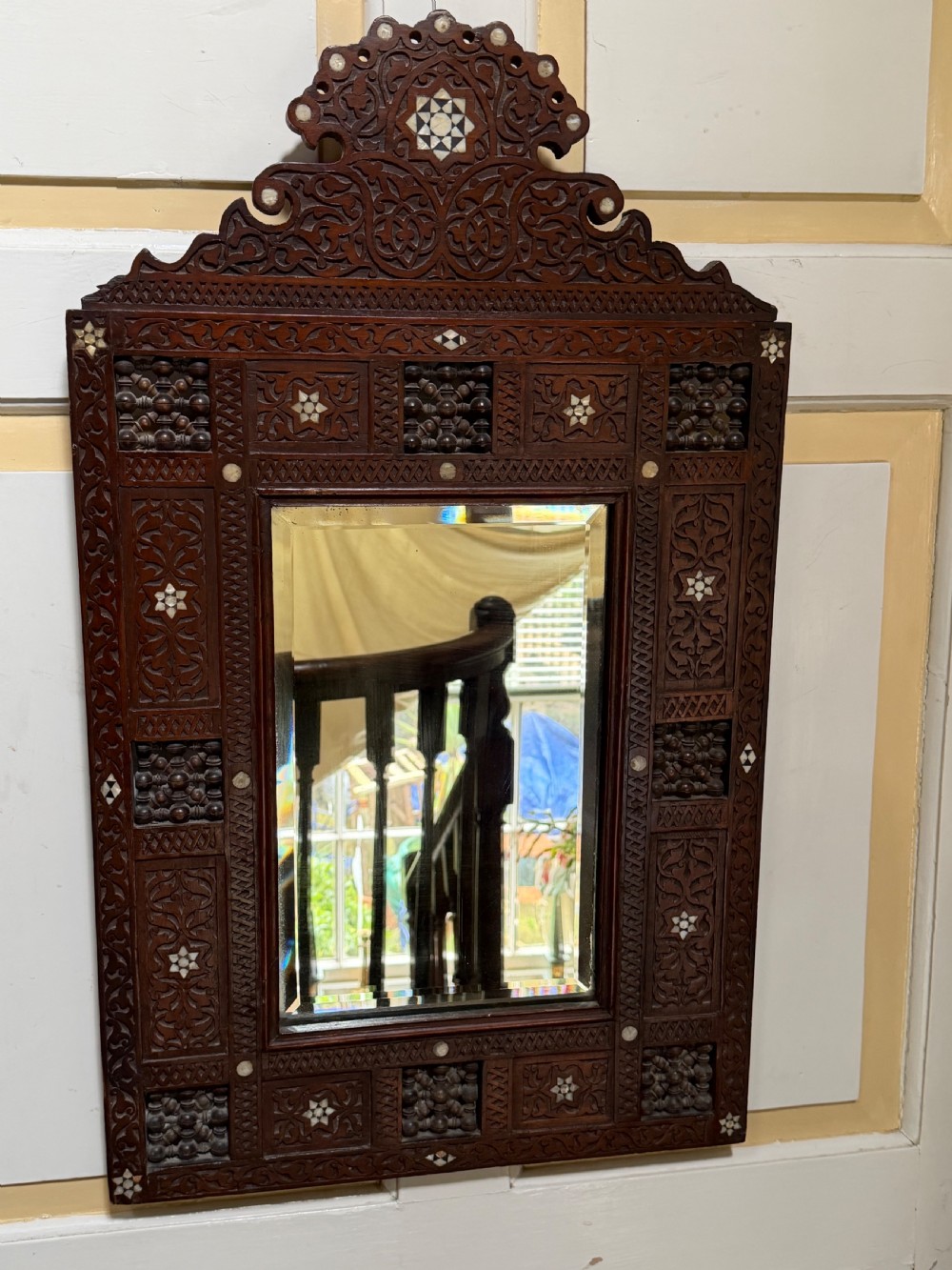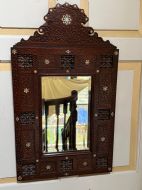 Decorative carved and inlaid frame with a central bevelled edge mirror plate . Inlaid with nacre-shell or ‘mother o pearl’ details and having panels of mashrabiya work to the corners. The rectangular frame having a carved and inlaid cresting panel to the top .