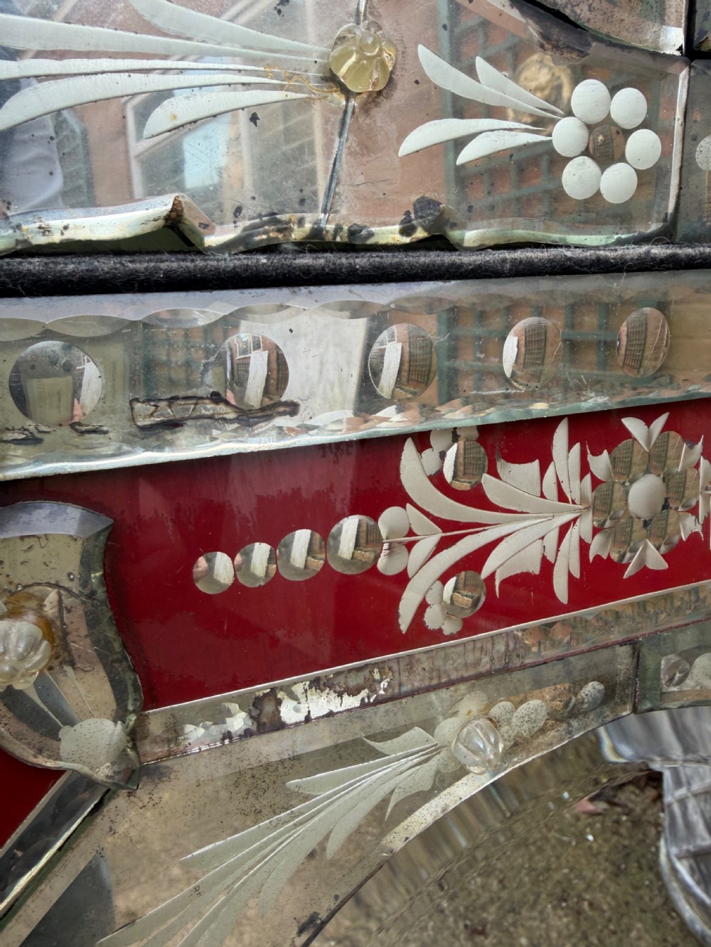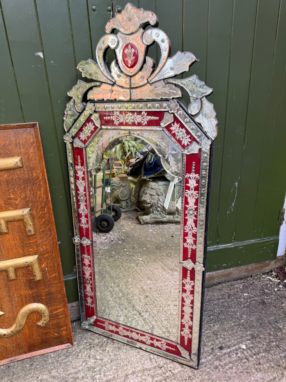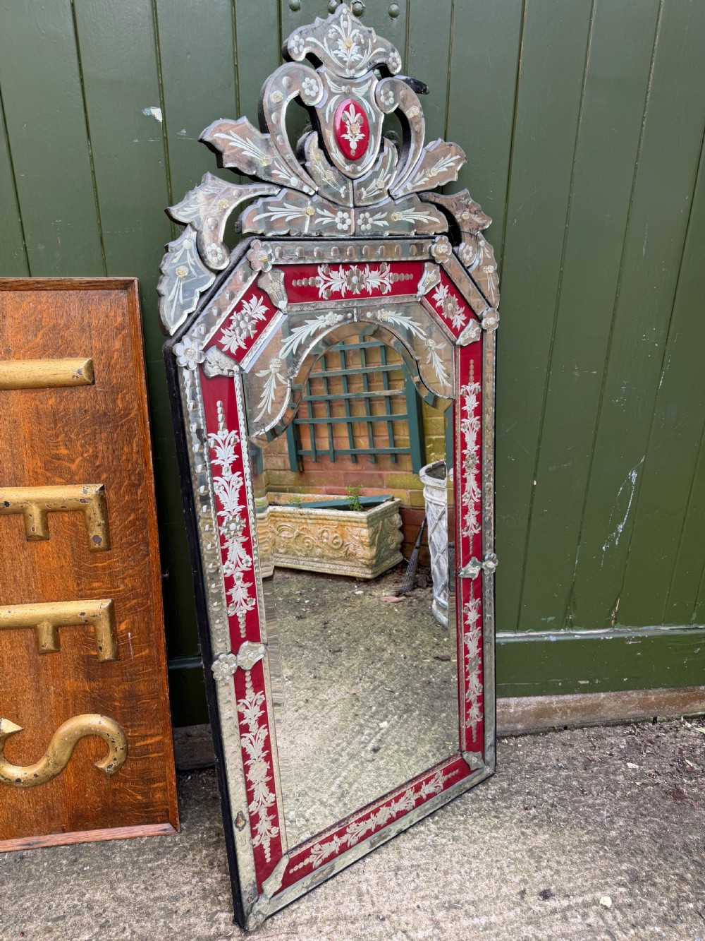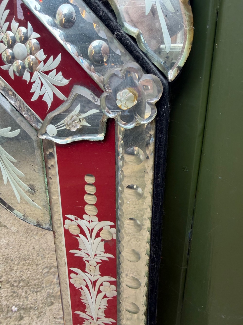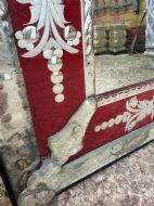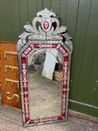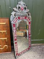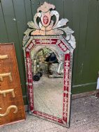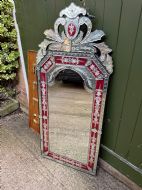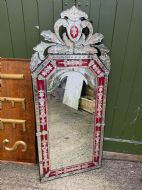 Decorative Venetian-style mirror with a central arch-top bevelled edge mirror plate , surrounded by a border of ruby red glass detailing and applied cut and etched glass elements . The top surmounted by a tall decorative crest with corresponding red motif to the centre.