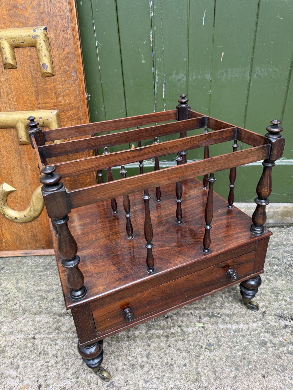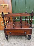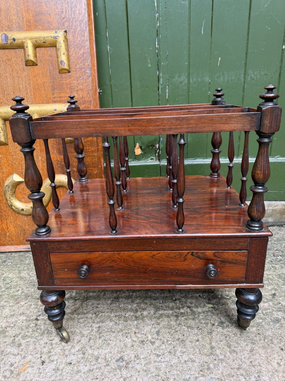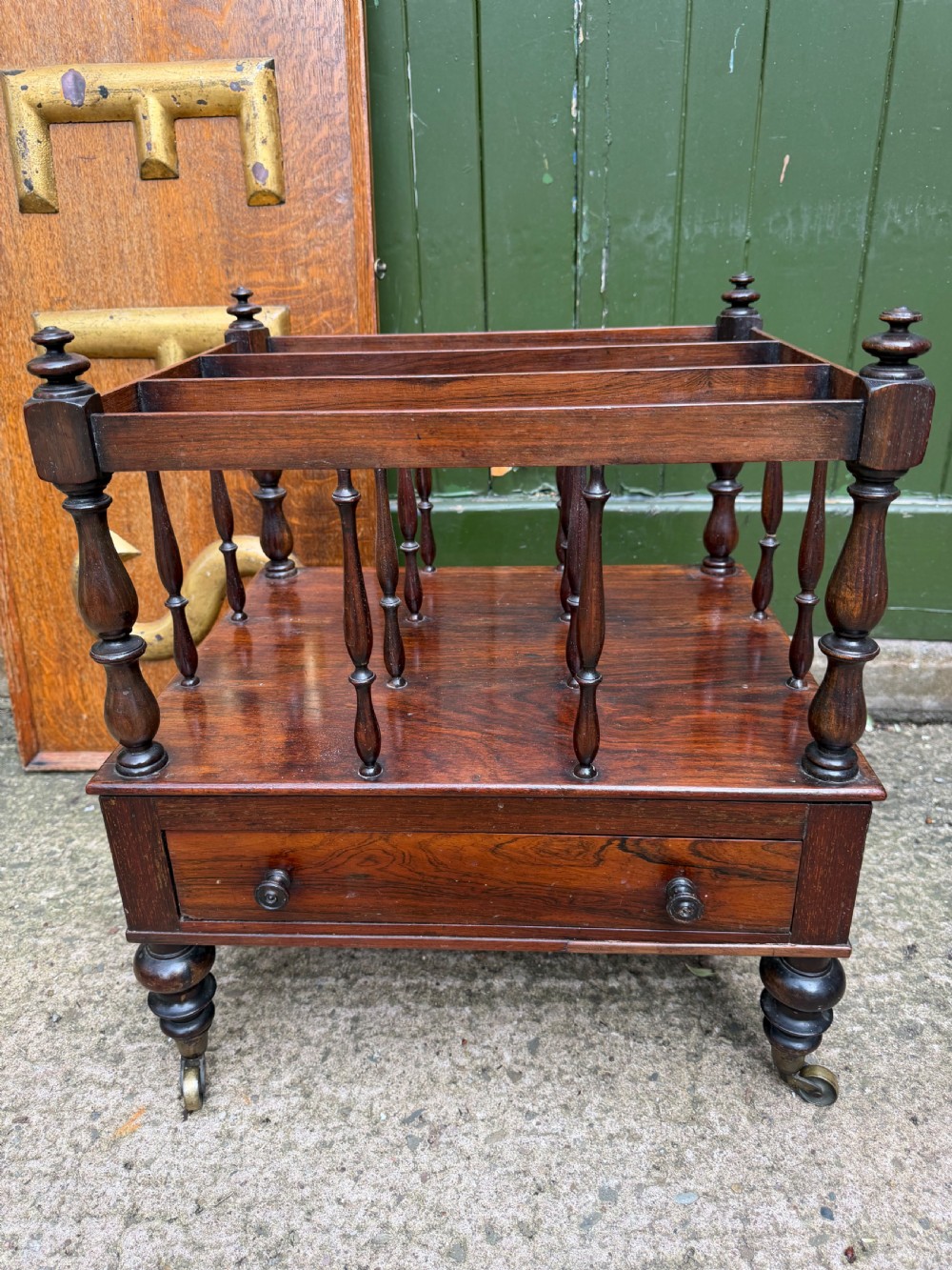 Neat rosewood canterbury or magazine rack , having three divisions to the top separated by finely turned baluster spindles.The corners having turned uprights with turned finials .The frieze fitted with a shallow full-length drawer retaining its original turned rosewood knob-pulls .