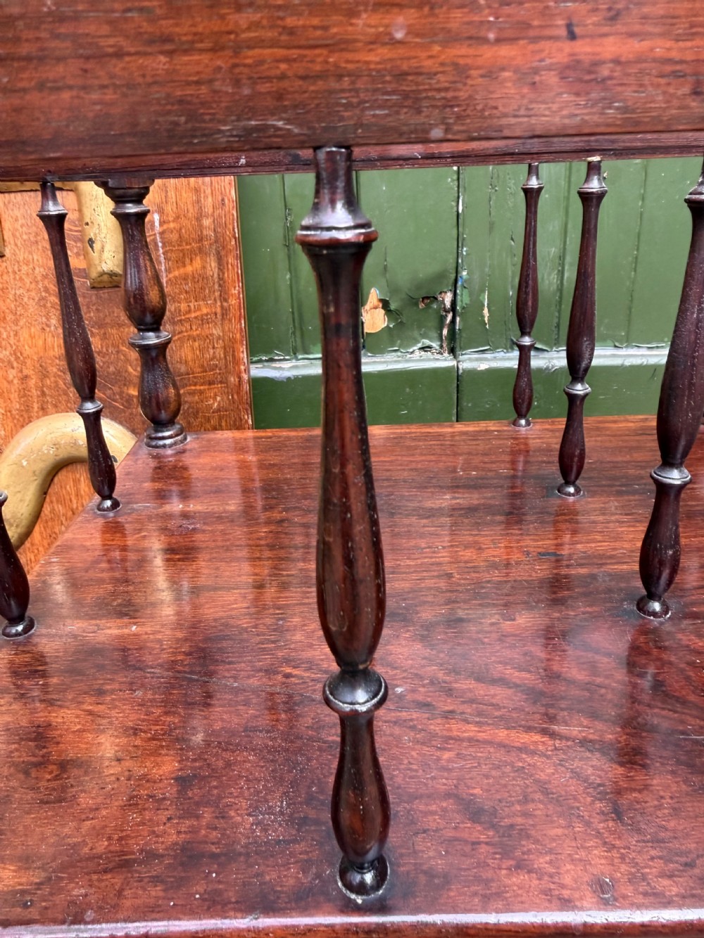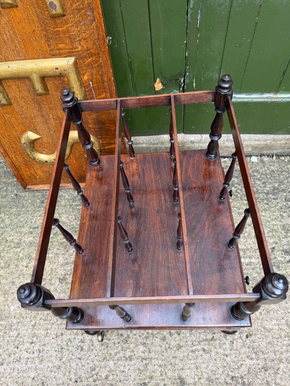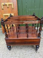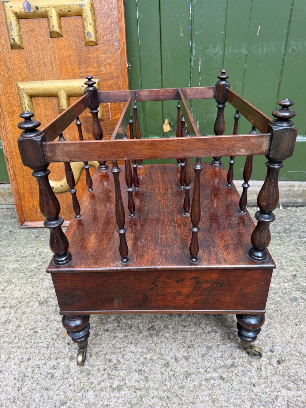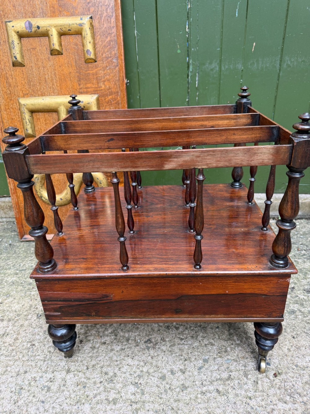 Neat rosewood canterbury or magazine rack , having three divisions to the top separated by finely turned baluster spindles.The corners having turned uprights with turned finials .The frieze fitted with a shallow full-length drawer retaining its original turned rosewood knob-pulls .