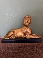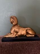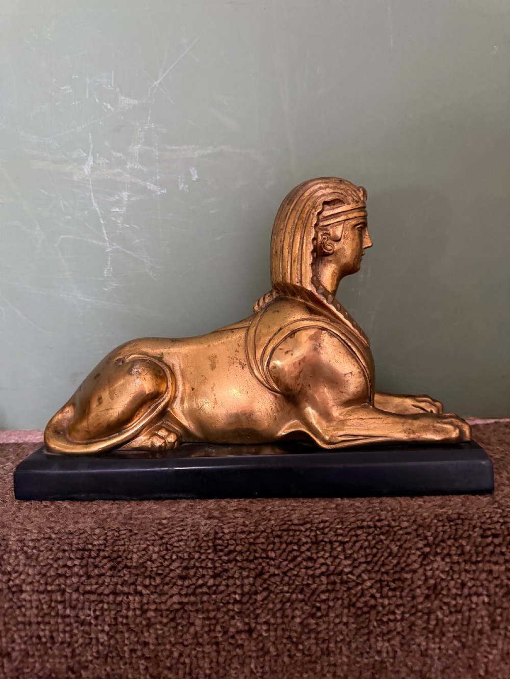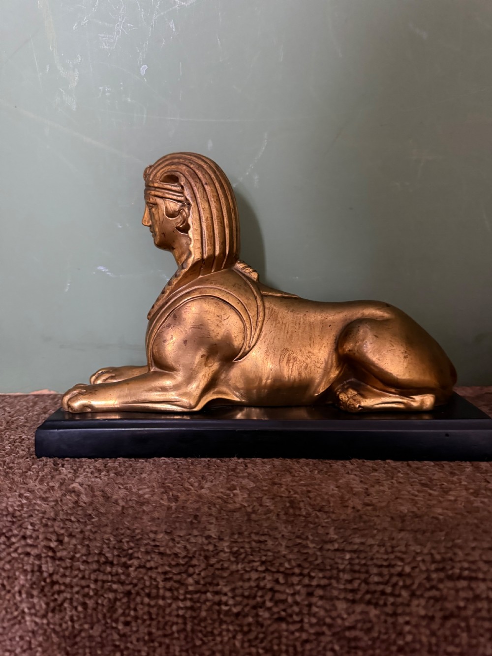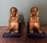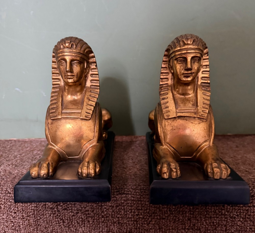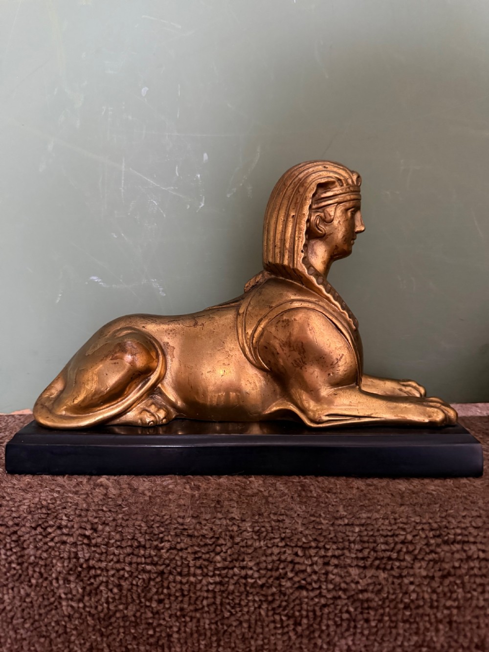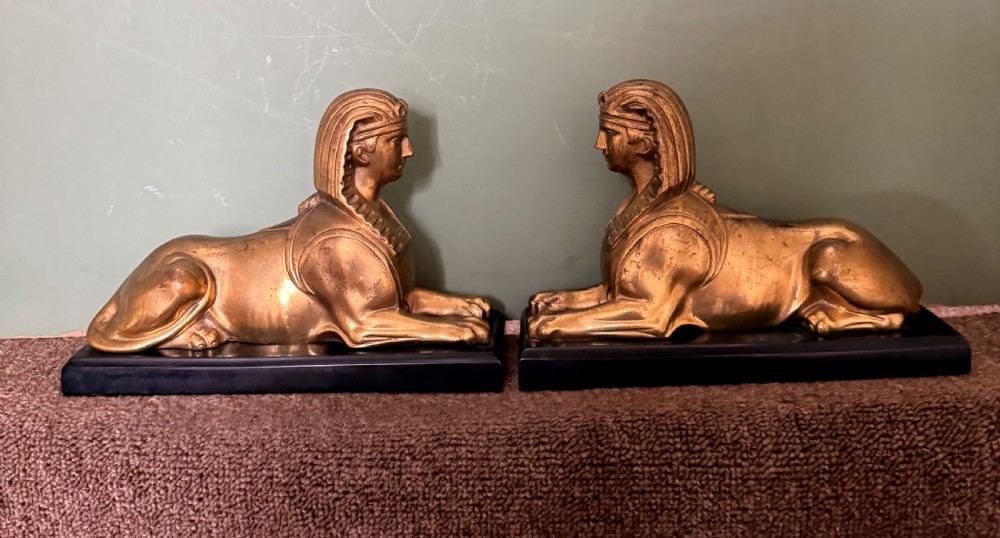 Smart pair of gilt bronze Sphinxes in the fashionable early C19th Egyptian revival taste. The well-modelled cast bronze studies with a gilded surface mounted upon rectangular dark patinated rectangular plinths.
