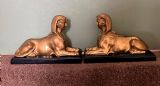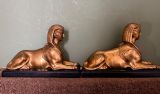 Pair of early C19th gilded bronze studies of recumbent Sphinxes on rectangular patinated bronze plinth bases .