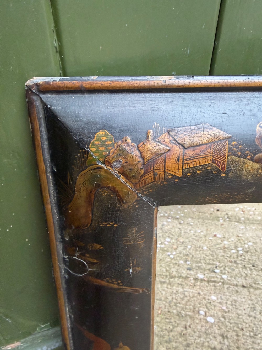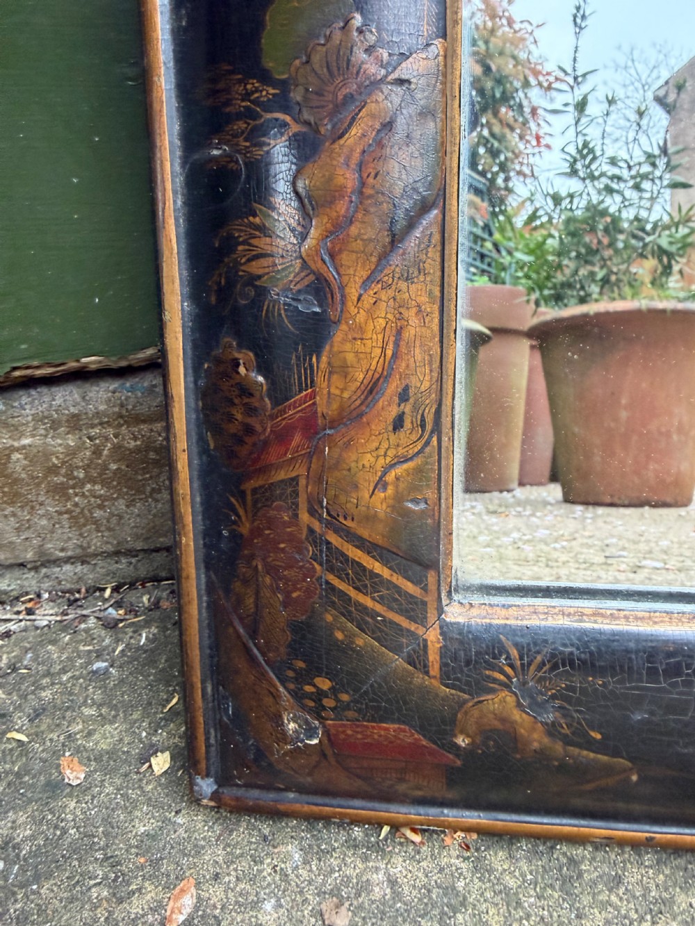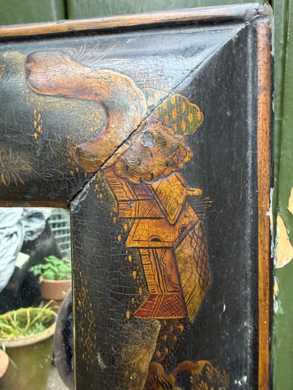 In good original condition, the aged surface with subtle atmospheric crackulature and wear purporting to an early C18th frame . Minor wear and losses to the japanned surface. The verso with original panelled backboards . The silver-grey mirror plate in good clear condition..