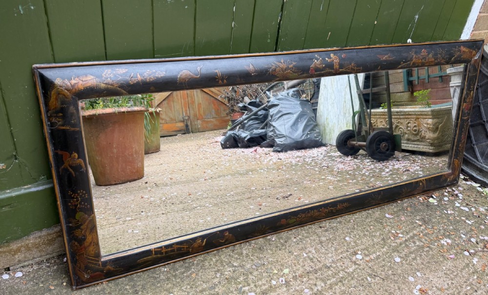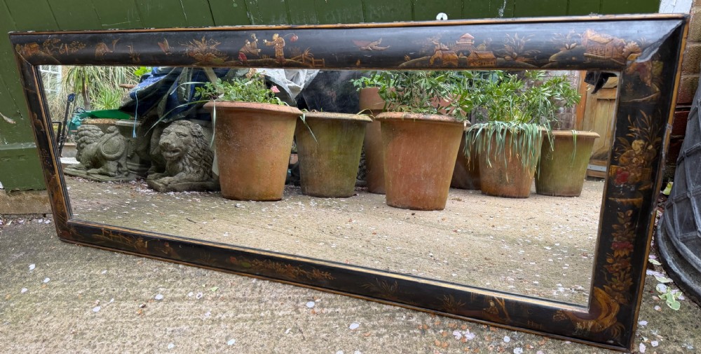 Decorative and atmospheric C19th japanned lacquer cushion-framed overmantel mirror in the late C17th / early C18th taste.