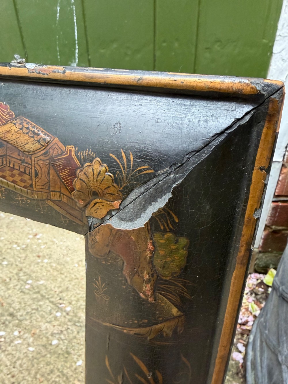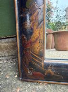 Decorative and atmospheric C19th japanned lacquer cushion-framed overmantel mirror in the late C17th / early C18th taste .