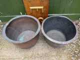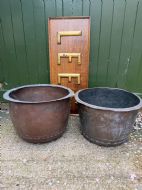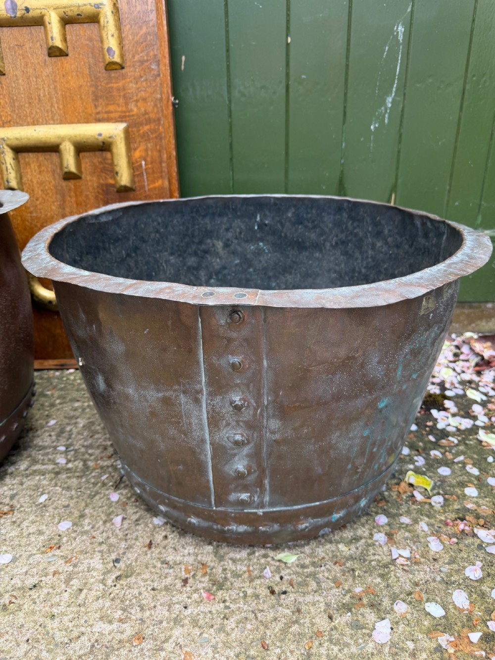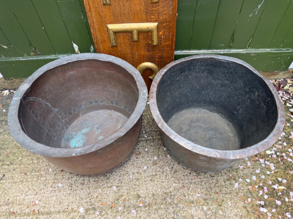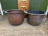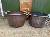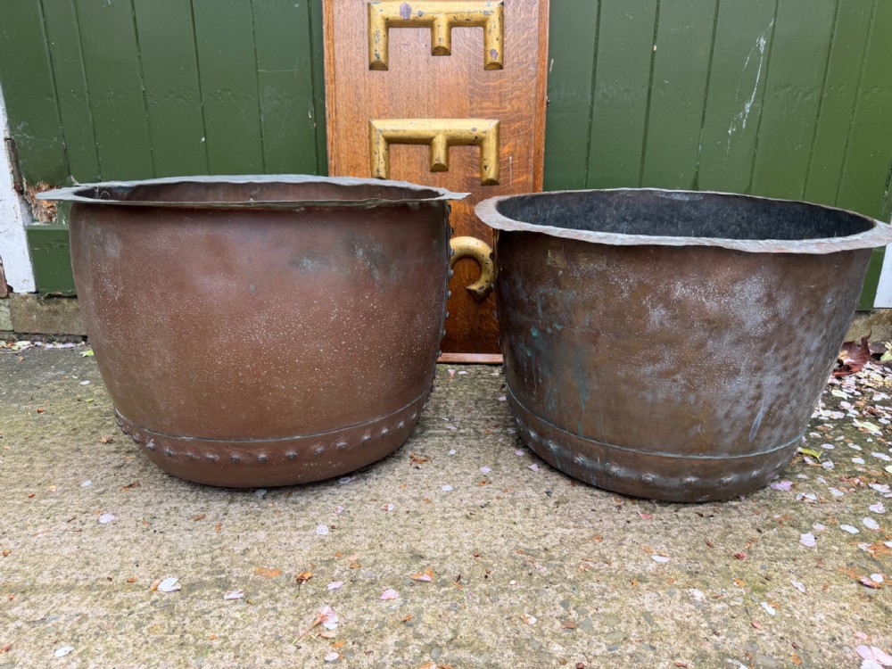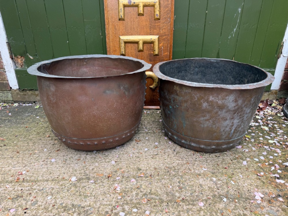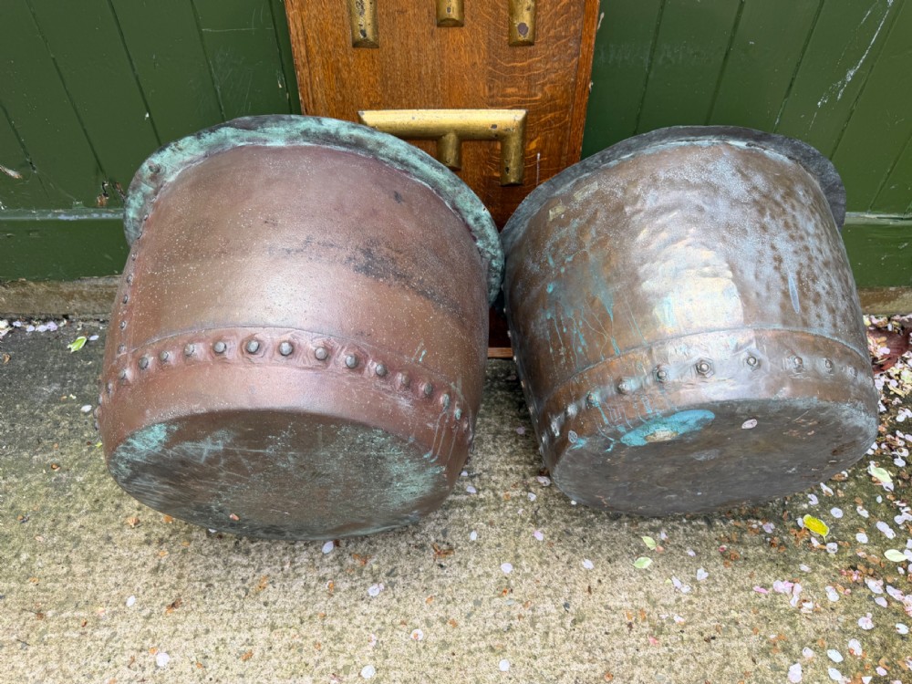 A characterful matched pair of coppers of larger scale, ideal for use as log-bins or planters to add symmetry to an interior or exterior scheme.