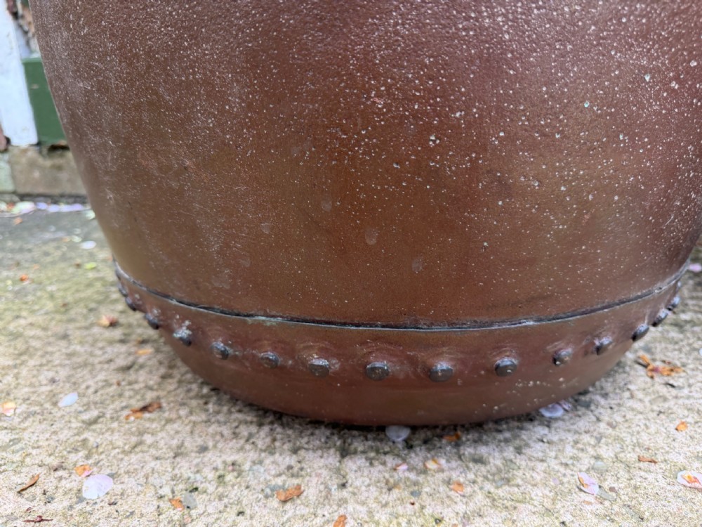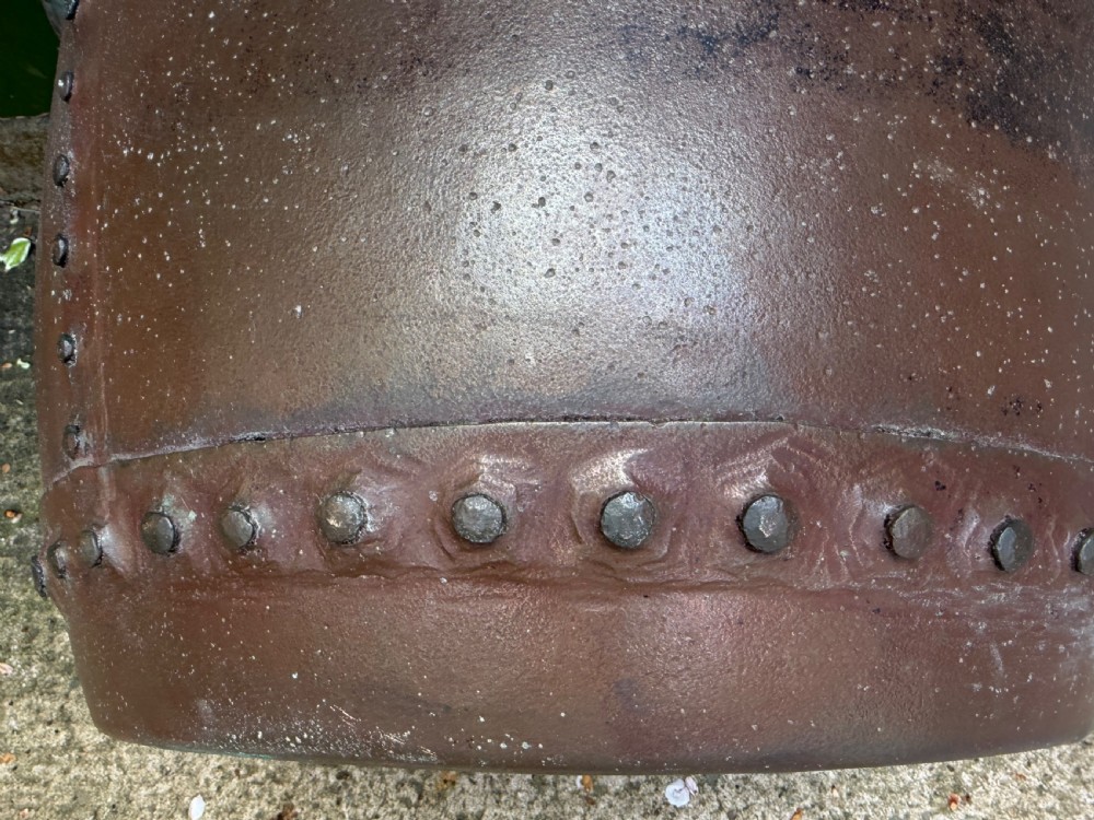 Of traditional rivetted seam construction , originally conceived as washing or industrial vessels.